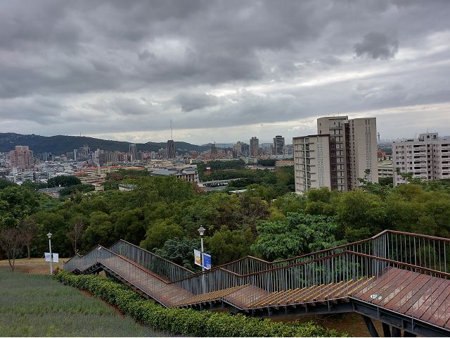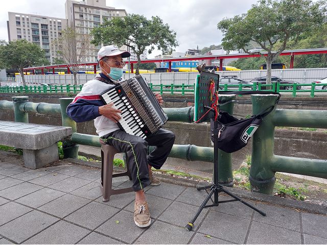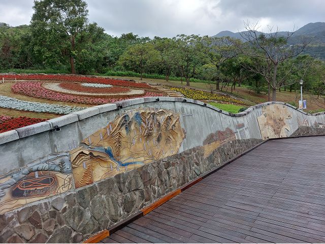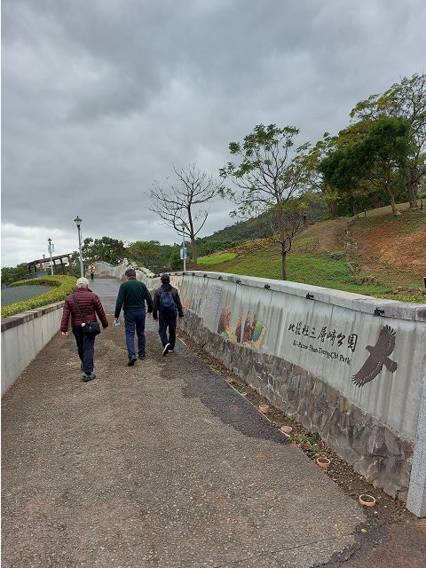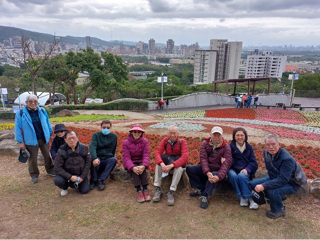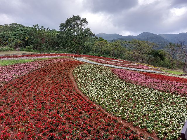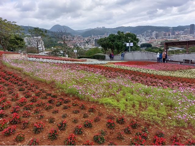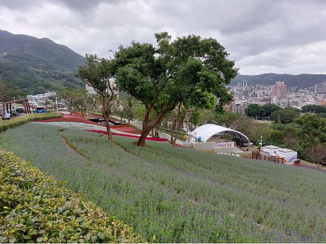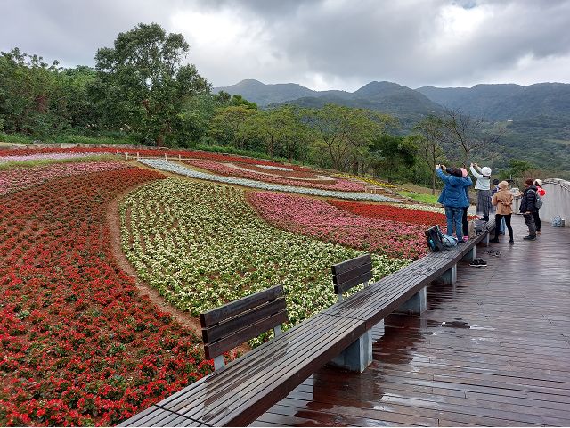 雖然去過三層崎好幾次,景物依稀,但夥伴不同、季節差異,所賞草花也非當時的花,每次自有不同的情趣。是日,烏雲密佈,在捷運站會合後,沿政戰學校圍牆外步道往公園前行,直覺山雨欲來,卻見圳溝邊一老者彈奏手風琴,獨自一人,怡然自得,連我們這群健行尋芳老友也擦身而過,竟無一人駐足停留。抵達公園後,刻意避開入口台階棧道,循另端緩升坡道繞行,愛心鞦韆、文化走廊、觀景涼亭等景物依舊,仍然是薰衣草、五彩石竹、雞冠花、四季秋海棠、銀葉菊、孔雀草、大理花等多種彩色花卉紛陳,可我們似乎來早了,薰衣草還處於含苞待放紫色浪漫中。〈按:三層崎花海預計次日開幕(1/17~3/31),工作人員還在趕工。據說,今年有別以往,是將各色花卉交織出色彩繽紛的大冠鷲展翅圖騰,鑲嵌於展區花海中云,不過,可能需空拍機俯瞰,才得見端倪吧。〉