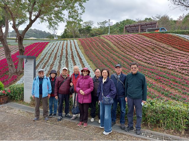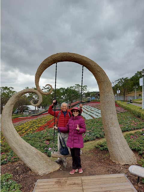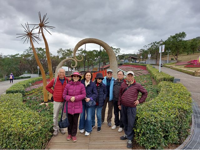 公園山坡地勢層疊起伏,花海宛如浪濤翻湧,設置有幾處打卡拍照景點,不同的角度觀賞,彩色浪花景觀依然可觀。攝影班老師帶隊,傳授利用手機和自拍,並示範如何拍出花海美照技巧,一伙人沉浸現場實作,正是得其所哉。我們且走且拍照,一樣在涼亭打尖、吃點心,陽光難得短暫露臉,大家紛紛留下雙雙對對容顏燦爛的身影。