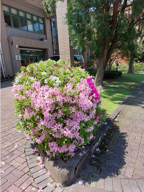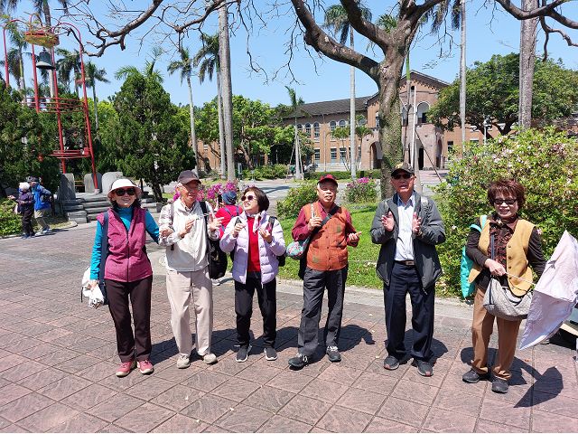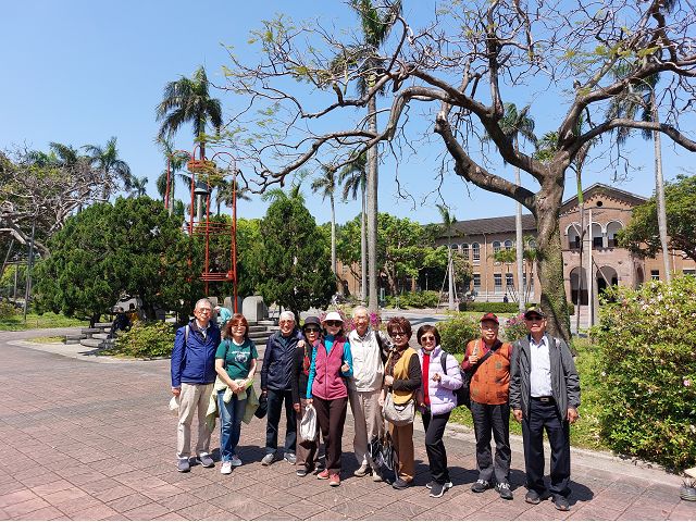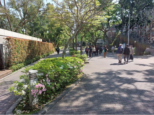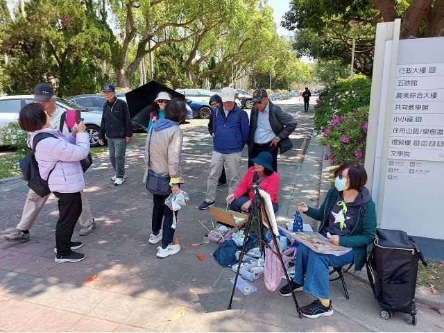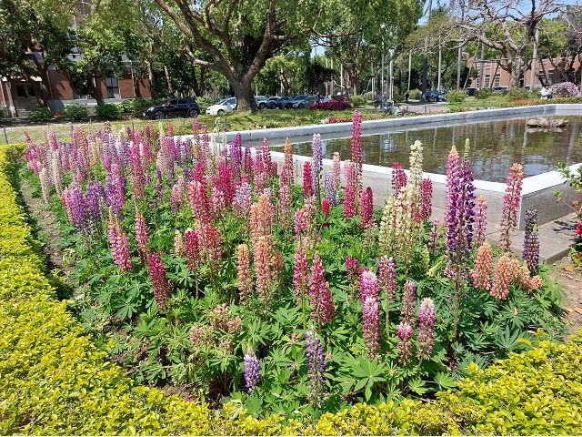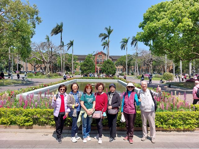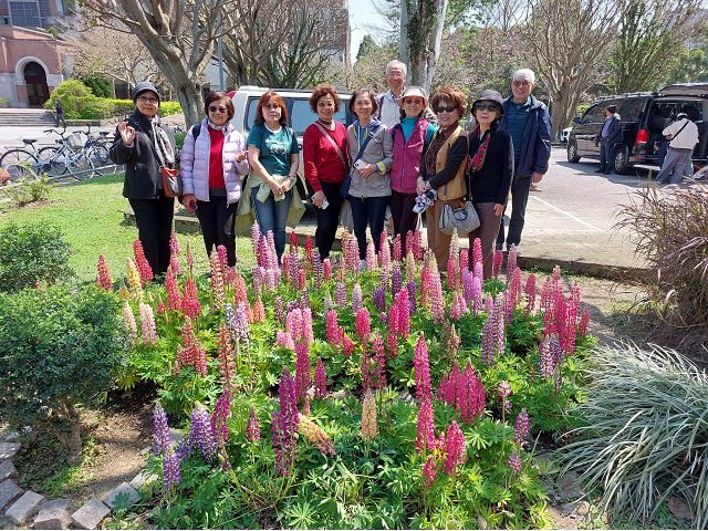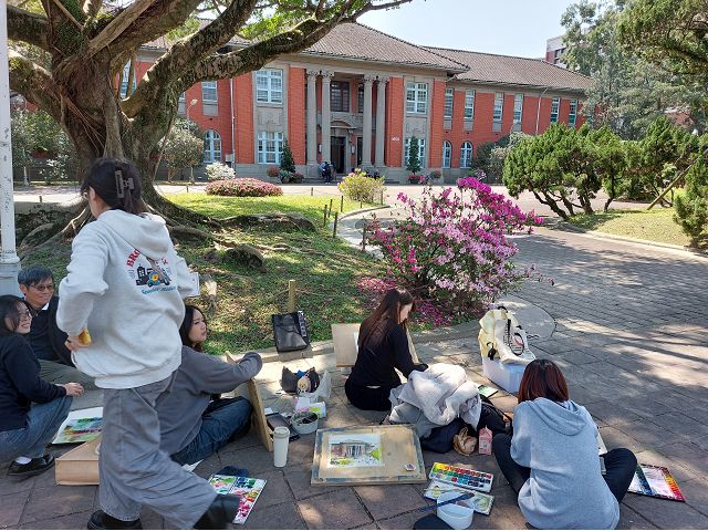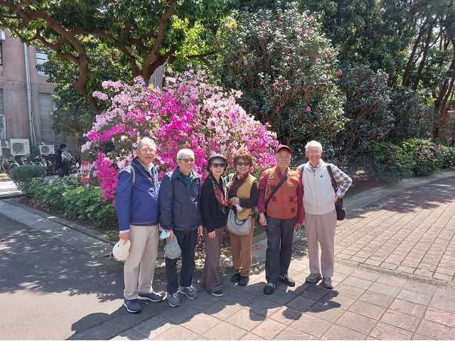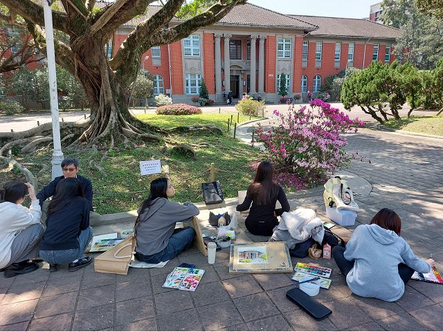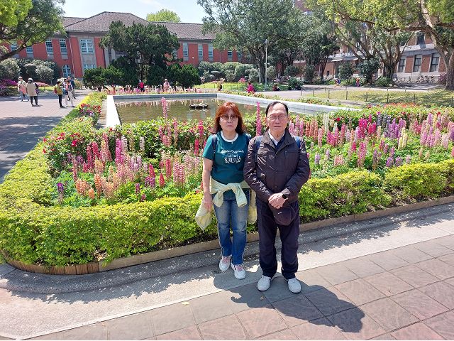 然後漫步轉向傅鐘、行政大樓前行,啊,原來杜鵑花是開在椰林大道上,沿路看到這裡、那裡處處綻放著朶朶紅白花兒,還有那行政樓前水池周邊盛開的五顏六色魯冰花,一群師大美術系一年級學生由老師帶領、正在美景當前寫生,即時捕捉春天來了的信息。老友們在古蹟群裡觀賞杜鵑花、魯冰花,一時興起,忘情高歌起"杜鵑花"來,臨老入花叢,對花引吭唸歌,亦人生樂事也。走向鹿鳴廣場時,遇見幾位管理學院的學生喬裝、舉海報,正熱心為舉辦的活動打廣告,顯示著現代年輕人熱情的一面。