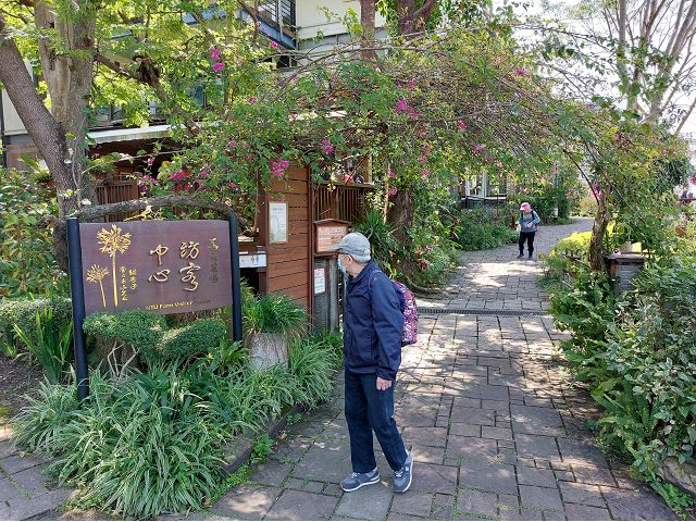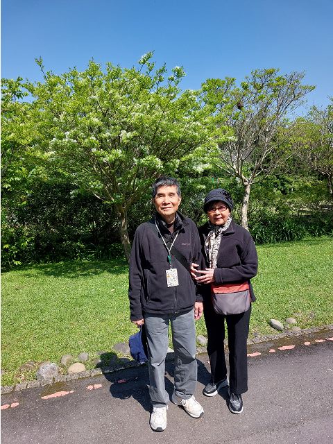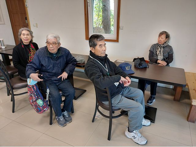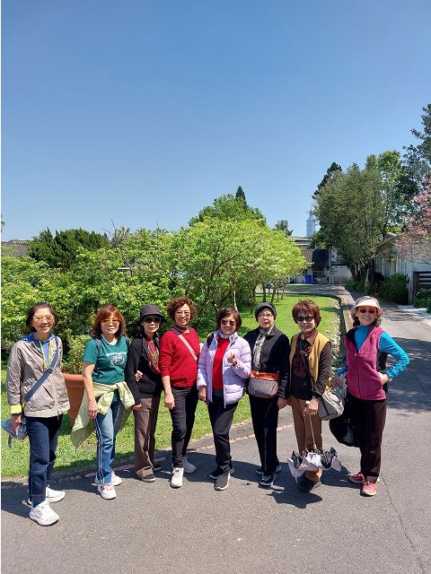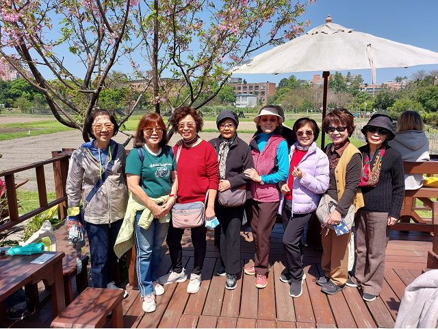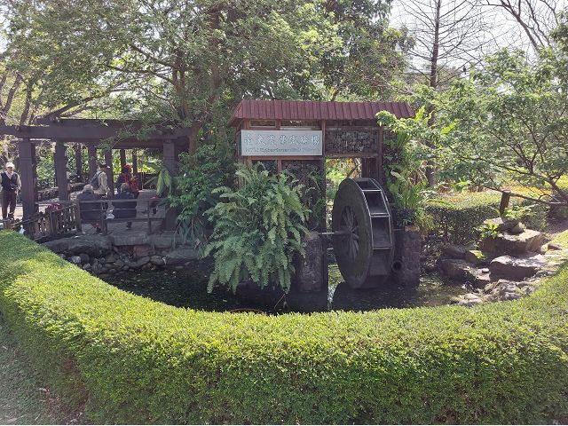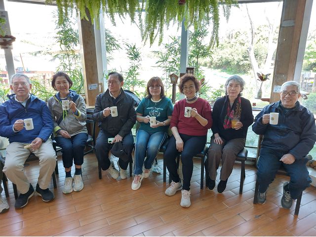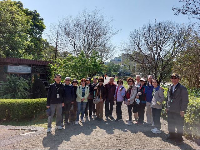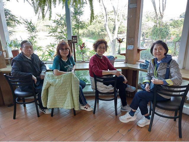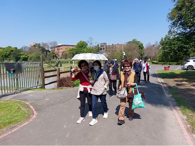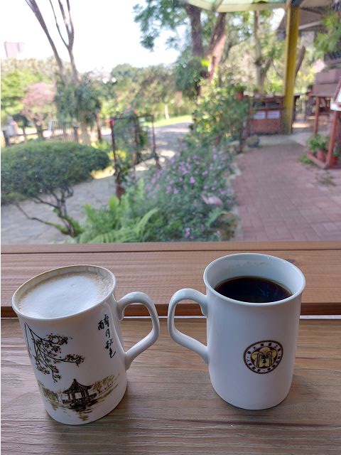 之後,順路前行,在水車造景處轉進台大農場,田園風光映入眼簾,遠方田野邊緣NTU Farm 100牌子標明台大農業試驗場歸屬權,但路過磯永吉小屋(台大舊高等農林學校作業室)、稻香館,都沒開放,惟日式木造房子、加上殘留的三兩株櫻花及含苞待放的流蘇花點綴其間,增益田園風光寧靜祥和而美麗。隨後逕往台大農場訪客中心,係由前台大綠房子改裝,讓早年販賣師生農產品的簡單福利社,逐漸蛻變成為樹林環繞的咖啡館(NTU Farm cafe bakery and drinks)兼農產品販賣處。老友們坐在溫室外形的環廳裡,環境清幽,窗明几淨,綠滿窗前,放眼四周盡是遍佈的樹木花草,旁有水池和觀景平台,池中錦鯉悠游,可觀魚、看農場,令人心曠神怡。喝咖啡嘛,可別期望太高,只是咖啡機子現磨綜合豆,也僅有美式和拿鐵,選項不多;但到此歇歇腳,好友們聊天、喝咖啡,望著窗外藍天、綠地、美麗植栽,倒也十分愜意。