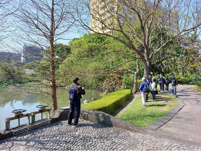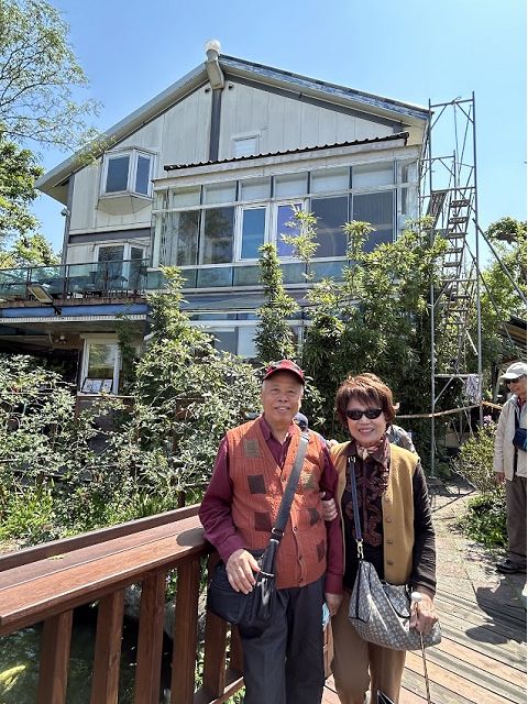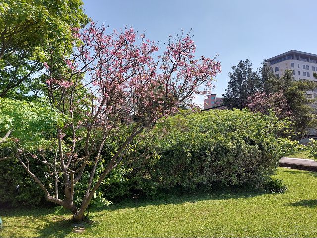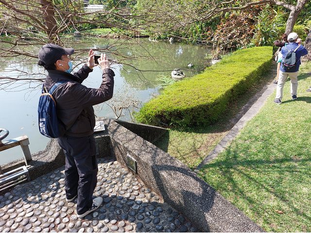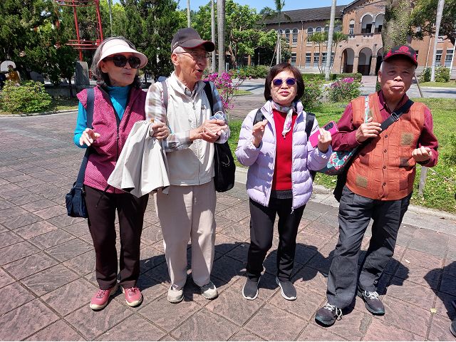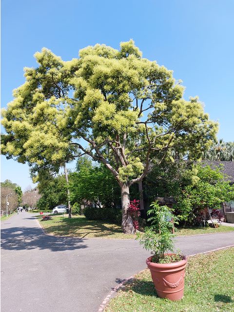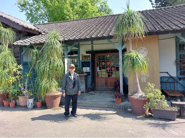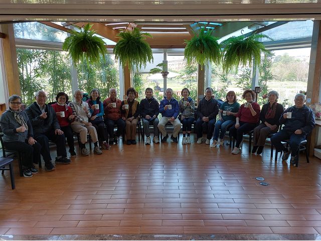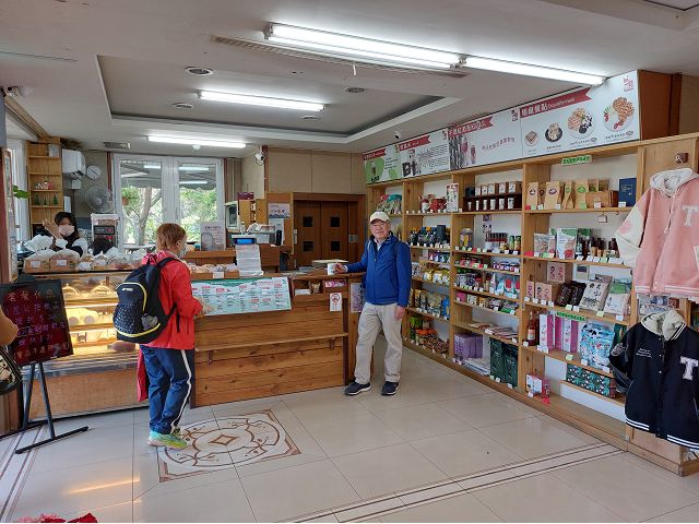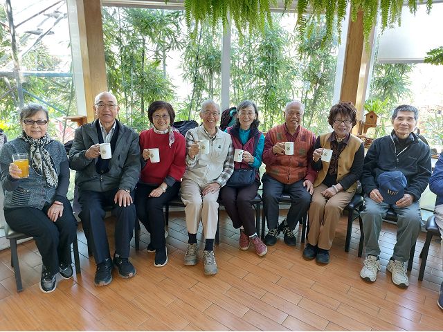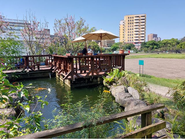 之後,順路前行,在水車造景處轉進台大農場,田園風光映入眼簾,遠方田野邊緣NTU Farm 100牌子標明台大農業試驗場歸屬權,但路過磯永吉小屋(台大舊高等農林學校作業室)、稻香館,都沒開放,惟日式木造房子、加上殘留的三兩株櫻花及含苞待放的流蘇花點綴其間,增益田園風光寧靜祥和而美麗。隨後逕往台大農場訪客中心,係由前台大綠房子改裝,讓早年販賣師生農產品的簡單福利社,逐漸蛻變成為樹林環繞的咖啡館(NTU Farm cafe bakery and drinks)兼農產品販賣處。老友們坐在溫室外形的環廳裡,環境清幽,窗明几淨,綠滿窗前,放眼四周盡是遍佈的樹木花草,旁有水池和觀景平台,池中錦鯉悠游,可觀魚、看農場,令人心曠神怡。喝咖啡嘛,可別期望太高,只是咖啡機子現磨綜合豆,也僅有美式和拿鐵,選項不多;但到此歇歇腳,好友們聊天、喝咖啡,望著窗外藍天、綠地、美麗植栽,倒也十分愜意。