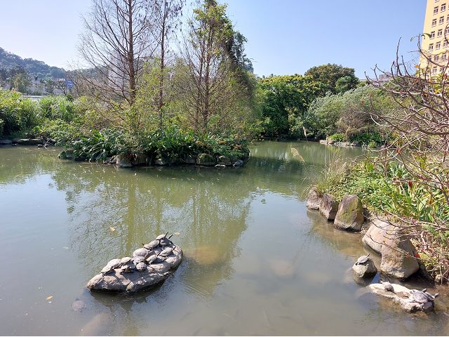 是日天氣晴朗,健行按計畫操作,只臨時少了一人。9:30,好友們在捷運公館站2號出口會合,順路從舟山路進入台大校園,漫步至瑠公圳水源池看烏龜,然後轉往台大農場,在農場訪客中心喝咖啡、聊天,之後到禮賢樓2樓品軒樓餐廳午餐。舟山路濃蔭夾道,走起來十分舒爽,時值台大杜鵑花季,可沿途杜鵑花卻不多見。瑠公圳水源池(或稱生態池),自然生態豐富,有各種魚、鳥類棲息,我們每次來都會駐足觀賞,其中烏龜是老友們的最愛,喜歡牠們露出水面,爬上石頭、懶洋洋地曬太陽,或許還遐想著龜息大法、延年益壽吧,總之,池畔流連,賞魚、曬太陽、看烏龜,樂此不疲。一學生捧著大盤育種央苗路過,祝福他能早日讓我們分享新種稻米,目送他帶著希望種苗走向實驗室。