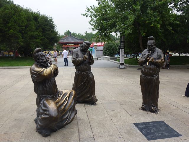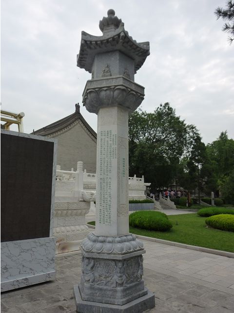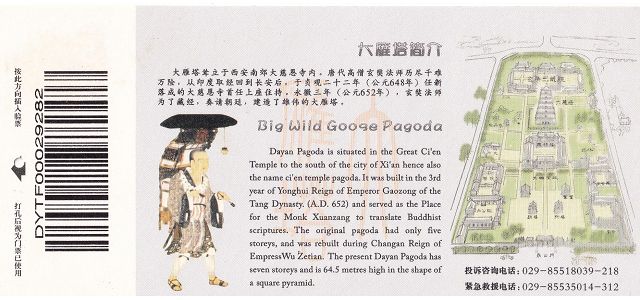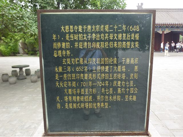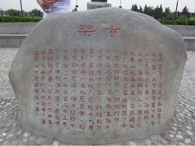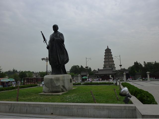 進入大雁塔南廣場,最先映入眼簾的,就是矗立園林綠地間的玄奘法師立式塑像,背影後方襯著巍峨聳立的大雁塔,是大雁塔文化休閒景區標誌性圖像。玄奘雕像法相莊嚴,底座石碑介紹其生平事蹟,略云:前往天竺摩揭陀國那爛陀寺學經修行,在印度巡禮十多年,至唐貞觀19年(645)回到長安,潛心譯經,一生所翻經論合計75部、1335卷,口述「大唐西域記」(簡稱「西域記」,為玄奘遊歷印度、西域17年間之見聞錄),稱讚為唐代高僧、著名的翻譯家、旅行家。