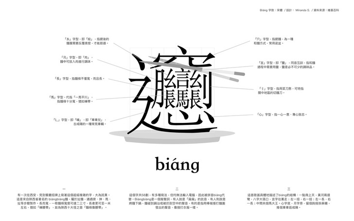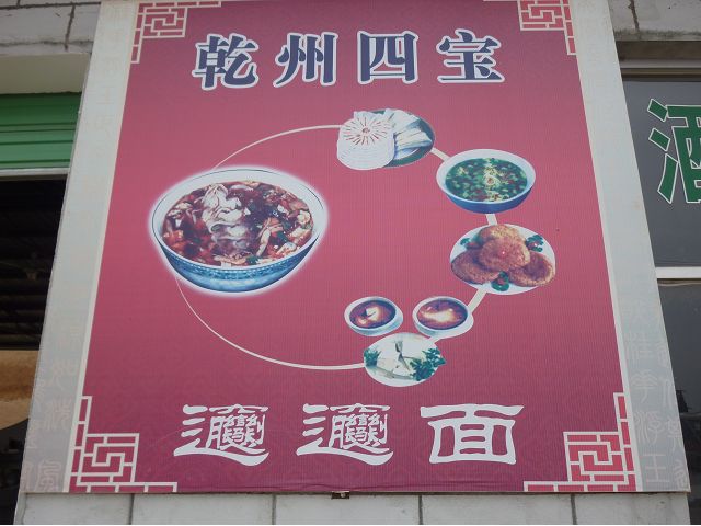 漢唐天下私房菜午餐,見識乾州(咸陽市乾縣)四寶-鍋盔、掛麵、馇酥、豆腐腦,是關中咸陽最有特色的地方風味,還有一種位居關中十大怪之首的扯麵,像褲帶的「biángbiáng麵」(取其製作過程會發出biángbiáng的聲音),經過揉、抻、甩、扯等製作步驟,麵寬而厚,猶如褲腰帶,食用前加入各色臊子或油潑辣子,口感勁道十足。為biángbiáng麵,還造出一個非常複雜的「biáng」字來。(其口訣曰:一點飛上天,黃河兩邊彎,八字大張口,言字往裏走,左一彎,右一彎;左一長,右一長,中間夾個馬大王;月字旁,心字底,留個鉤搭掛麻糖,推個車車進咸陽。)