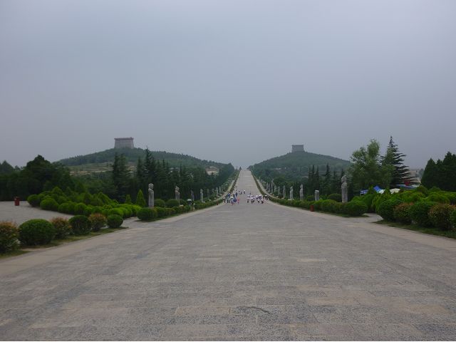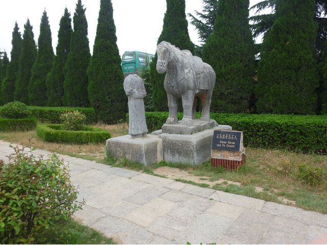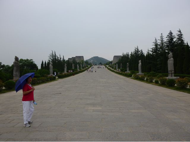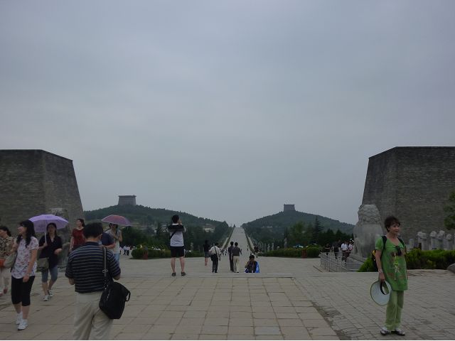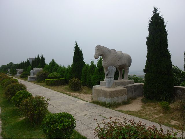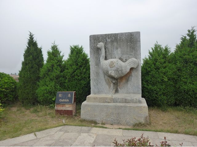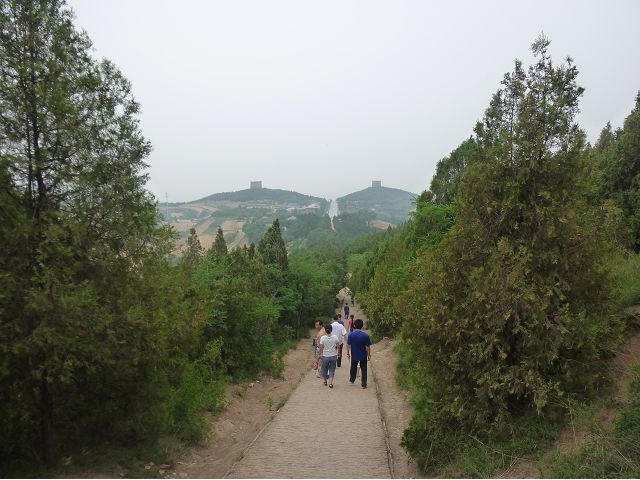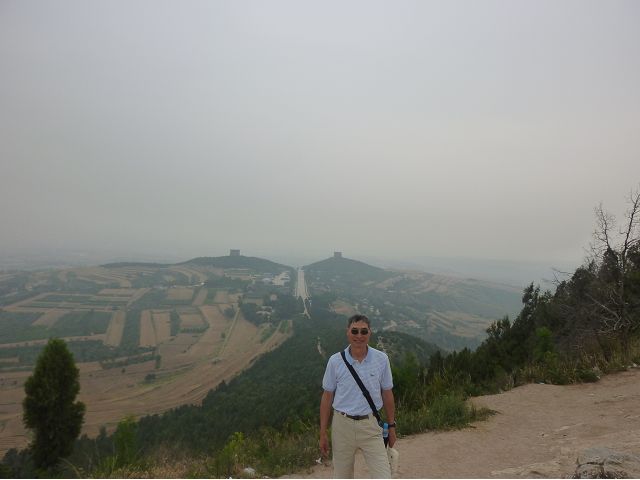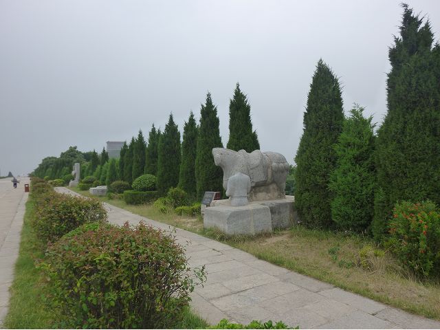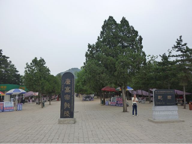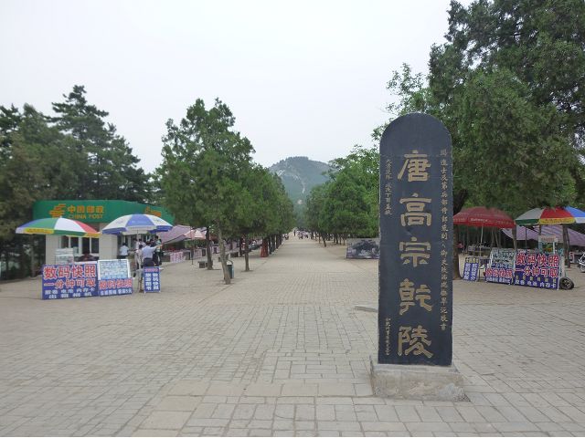 初履遼闊景區,感覺其氣勢恢宏,唐代留存文物遍佈各處,導遊邊走邊導覽介紹:乾陵建於盛唐時期,國力充盈,建築規模宏大雄偉,且依梁山三峰山陵形勢建造,北峰最高,南側兩峰較低,東西對峙,地宮位於北峰下,司馬道從南側二峰之前開始,為進入陵域的第一道門闕,殘存約8公尺高的土闕,第二道門闕殘存約15公尺,建於高約40公尺的南側二峰上,二闕之間留有瓦礫。沿司馬道向北,兩旁仍留存有八稜柱石華表(帝王陵墓的標誌)、翼馬、朱雀、仗馬及牽馬人、翁仲、東側無字碑、西側述聖紀碑等,碑以北為第三道門闕,從殘存的條石基礎看,闕身皆附有二重子闕,門內左右排列當時臣服於唐朝的61座無頭蕃臣石像,背面刻有國名和人名,但有60尊遭大地震(嘉靖大地震,1556年1月23日)毀損。蕃臣像北面即內城南門朱雀門,門外置石獅、石人各1對,並豎立一座郭沫若所書「乾陵」亭,門內有祭祀用的獻殿遺址;獻殿之北為地宮,高踞於陵園最北處。此處見立著「唐高宗乾陵」和解說碑文,林蔭道路旁許多攤商散落林間。末了,導遊還帶領到主峰山頭俯瞰,灰濛濛黃土丘陵間,乾陵靜靜躺臥這片大地裡,無語上千年了,卻一直引人發思古之幽情。