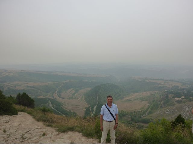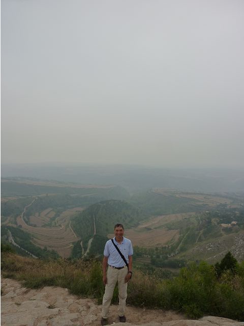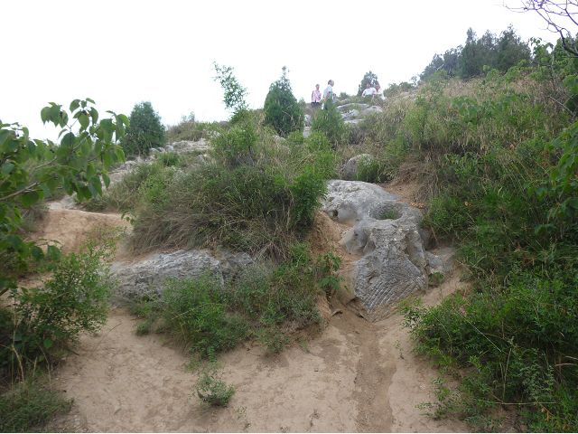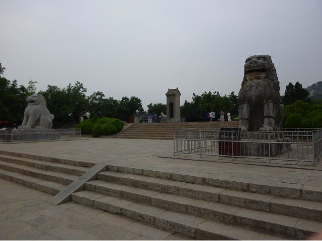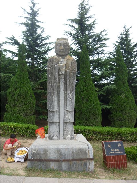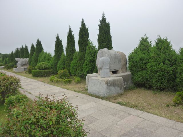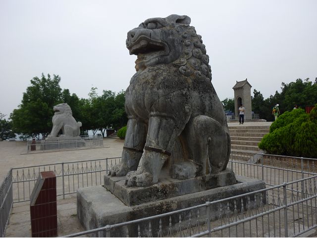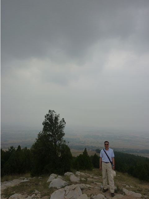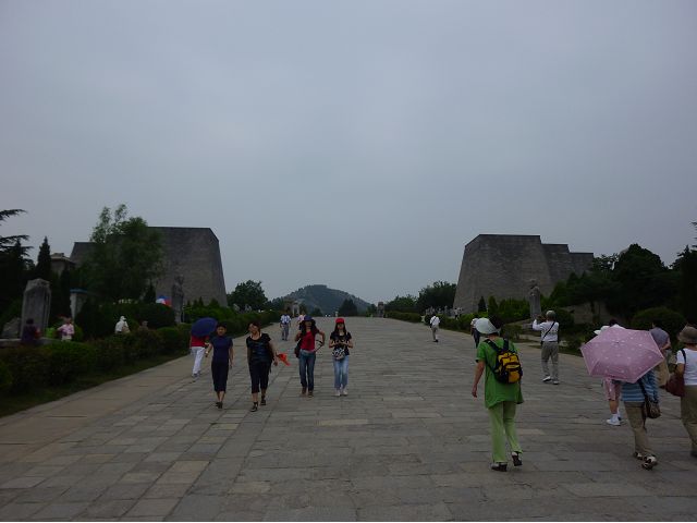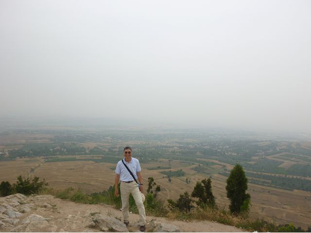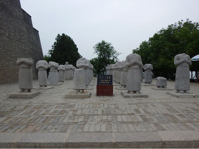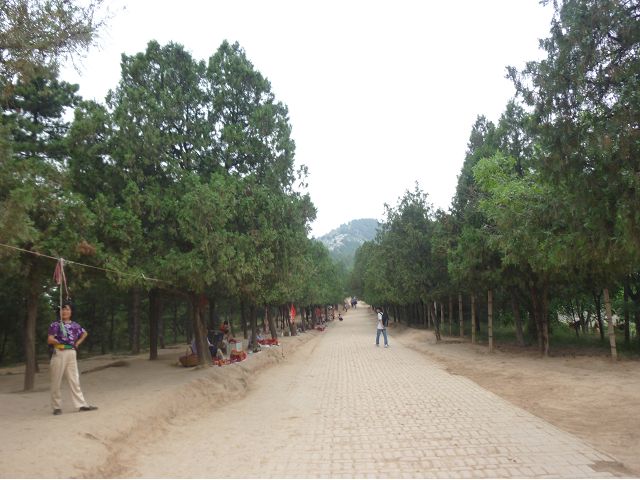 初履遼闊景區,感覺其氣勢恢宏,唐代留存文物遍佈各處,導遊邊走邊導覽介紹:乾陵建於盛唐時期,國力充盈,建築規模宏大雄偉,且依梁山三峰山陵形勢建造,北峰最高,南側兩峰較低,東西對峙,地宮位於北峰下,司馬道從南側二峰之前開始,為進入陵域的第一道門闕,殘存約8公尺高的土闕,第二道門闕殘存約15公尺,建於高約40公尺的南側二峰上,二闕之間留有瓦礫。沿司馬道向北,兩旁仍留存有八稜柱石華表(帝王陵墓的標誌)、翼馬、朱雀、仗馬及牽馬人、翁仲、東側無字碑、西側述聖紀碑等,碑以北為第三道門闕,從殘存的條石基礎看,闕身皆附有二重子闕,門內左右排列當時臣服於唐朝的61座無頭蕃臣石像,背面刻有國名和人名,但有60尊遭大地震(嘉靖大地震,1556年1月23日)毀損。蕃臣像北面即內城南門朱雀門,門外置石獅、石人各1對,並豎立一座郭沫若所書「乾陵」亭,門內有祭祀用的獻殿遺址;獻殿之北為地宮,高踞於陵園最北處。此處見立著「唐高宗乾陵」和解說碑文,林蔭道路旁許多攤商散落林間。末了,導遊還帶領到主峰山頭俯瞰,灰濛濛黃土丘陵間,乾陵靜靜躺臥這片大地裡,無語上千年了,卻一直引人發思古之幽情。