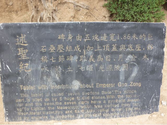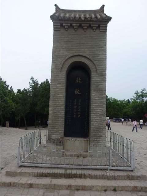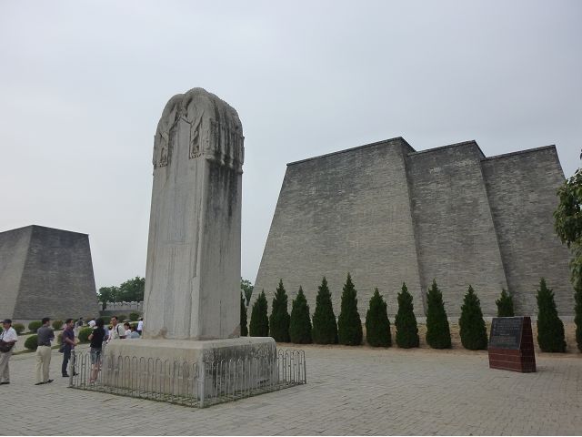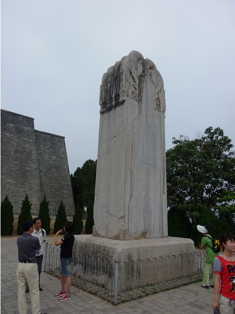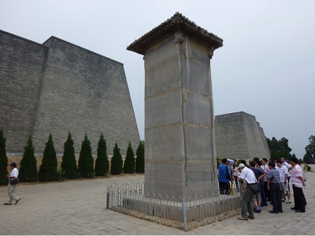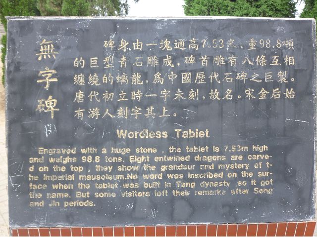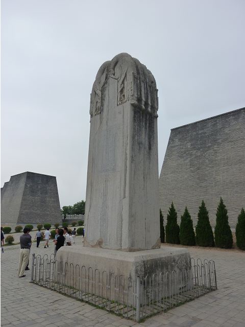 〈在朱雀門外司馬道東側,聳立著巍峨壯觀、雕刻精美的無字碑,北靠東闕,南依翁仲,與西側述聖紀碑相對。述聖紀碑碑文是武則天親撰、其子唐中宗李顯所書,記述唐高宗文治武功,開帝王陵前立功德碑之先例。在乾陵之前,帝王陵墓不樹碑,墓內也不放墓誌銘,乾陵突破了慣例,因此具有特殊的歷史意義。〉