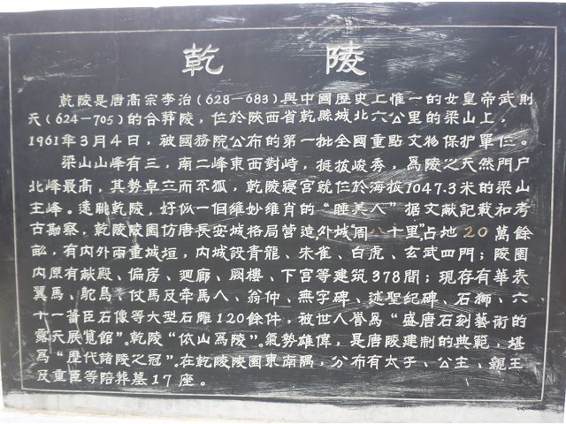 乾陵位於西安市西北方向、咸陽市乾縣梁山,為唐王朝第三位皇帝唐高宗李治與皇后武則天(中國歷史上唯一的女皇帝)合葬的陵墓,也是世界上唯一的一座一對夫妻、大唐大周兩朝皇帝的陵墓,採用依山為陵的建造方式,有氣勢磅礴的陵園規劃和地表上大量的唐代石刻,除了主墓外,還有17座小型陪葬墓,葬著其他皇室成員與功臣,稱為唐十八陵,屬5A級旅遊景區、全國重點文物保護單位。據查悉,武則天於弘道元年(683),任命吏部尚書負責乾陵的工程,陵園仿長安城的格局營建,分為皇城、宮城和外郭城,城內有獻殿、偏房、迴廊、闕樓等建築,次年8月李治下葬;之後,乾陵工程繼續進行,唐中宗李顯於神龍二年(706)5月,下令將武則天葬入。乾陵滿是盛唐遺風,且是迄今唯一未被盜掘的唐代帝王陵墓。