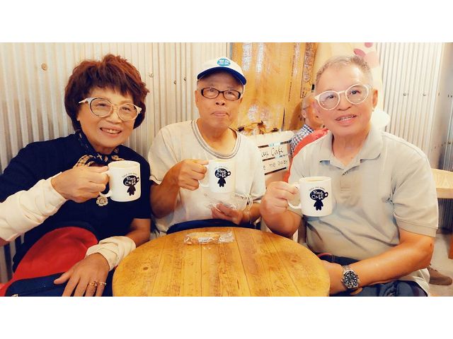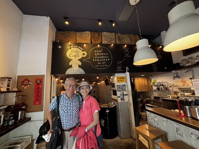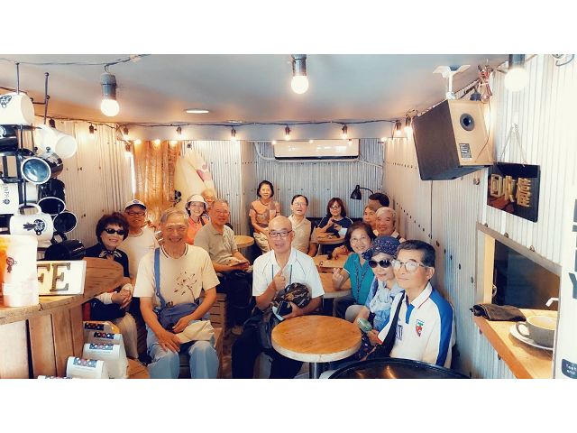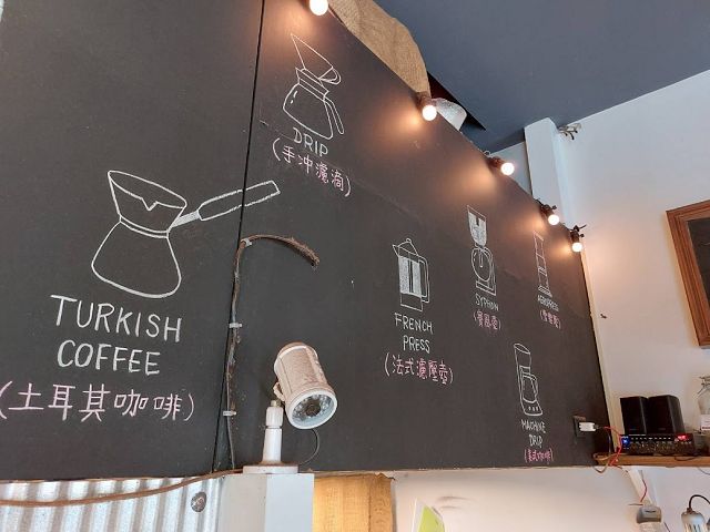 真難為他了,居然在明曜百貨的後巷中,找到這家店面狹窄、像白色貨櫃屋,空間不大,沒有洗手間,卻主打阿拉比卡手烘咖啡的店(台北市大安區忠孝東路四段170巷5弄22號)。我們16人入坐,就等於包場了,店裡的咖啡自己烘、糖水自己煮、檸檬自己榨,全部自己來;16人分別點了美式黑咖啡、拿鐵、小白、瑪其朵、抹茶咖啡,夠店家兩位年輕男女忙一陣子,倒是他們慢條斯理、一杯一杯陸續端上來,大夥擠坐在暖色系的裝潢裡,擺龍門,安心靜候咖啡來,溫馨氛圍,絲毫不覺得侷促。