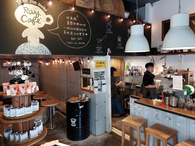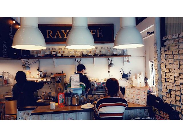 是日,天氣依然悶熱,大夥準時到齊,國璜領軍照計畫操作,引領大家搭乘電扶梯,進入捷運忠孝復興站地下層,沿東區地下街步行,那時候距開門營業時間還早,幾乎所有店面都緊閉著,沒什麼行人,涼爽舒適,真是早鳥銀髮族步行的好地方。逾一個月沒碰頭,帶點兒興奮,好像有聊不完的話,邊慢走邊聊天,不知不覺就走到捷運忠孝敦化站地下街出口了,旁邊豎立大大的「誠品生活書店」看板,可惜也還沒到營業時間,因為這緣故,國璜說,為請大家喝咖啡,探路時就在這個區塊方圓蒐尋適合的咖啡店,因而發現以「請支持精品咖啡日常化 乾淨x香甜x圓潤の咖啡」作為廣告的「RAY CAFE」。