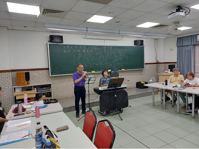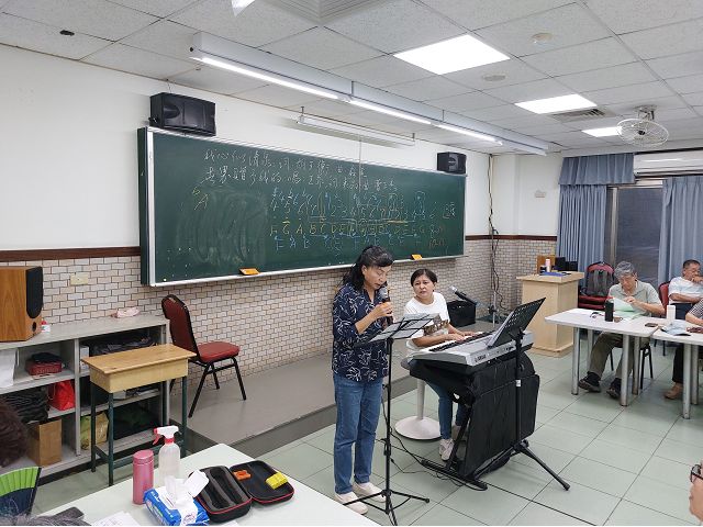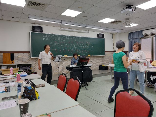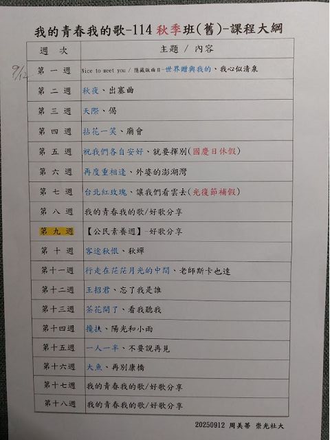 終於,秋季班9/12(週五)開課啦,教室裡大部分是老面孔,不過,不是大家都能開心再相聚,因好幾位還在旅遊中,也有幾位請事、病假看診的,他們暫時缺席了;另外,夏敏因健康因素,麗雯因膝蓋骨折、十字韌帶斷裂,無法行走,這學期都沒報名,但也增加維臻、穎怡兩位新同學,本班人數仍維持滿額狀態。老師的課堂秩序一如舊貫,她準備了課程大綱、教唱歌譜,每次教唱兩首歌,連班長、副班長也連選連任,能者多勞,同學也習慣坐老位置,班上除原本兩對夫妻檔之外,好像還多了一個班對,真是可喜可賀呀。