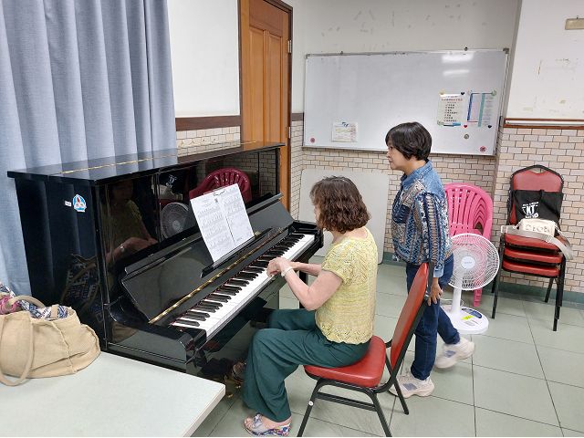 第一週(9/12)教唱「世界贈與我的、我心似清泉」兩首歌,第二週「秋夜、出塞曲」,第三週「天際、偈」,教唱之後,同學一樣輪番演唱,也都由老師現場伴奏,享受歌星級待遇,班長則一律錄影音上傳群組,讓同學可以聽自己的、也可以聽別人的歌聲。老師說,懂得自己的歌聲、音域,唱歌時可以掌握得更好。安琪自彈自唱功力增,也是越來越有自信了。