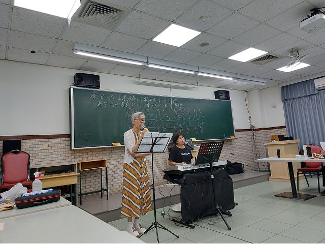 同樣的,10/17教唱難易截然不同的"再度重相逢、外婆的澎湖灣"兩首歌,前者,老師播放了伍佰C調的16度音域版(須飆至高音5)和郁可唯演唱的9度音版,後者,則是大家比較熟悉的、王夢麟唱的輕快旋律。同學獻唱的時候,也是唱將級同學選唱"再度重相逢"的多,且有挑戰伍佰C調、副歌升8度唱原汁原味的曲調,玉招姐也挑戰,勇氣讓我甘拜下風。老師說,一般男生音域介於10~12、13度間,女生為8~10度間,以她本人來說,可以輕鬆唱C調5~7、至高音1,高音2已勉強,得用假音,要飆到高音5,難以想像。果然,挑戰伍佰C調原key的同學,一樣難以企及高音5,得用假音唱,倒是大華哥降B key、華哥降A key唱16度音,老師說是游刃有餘,功力確實不凡。許多同學演唱郁可唯的9度音版,婉轉柔媚,也一樣好聽。