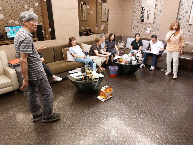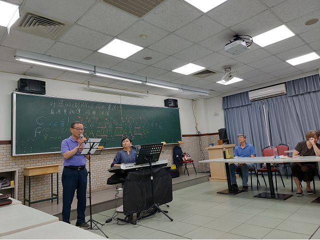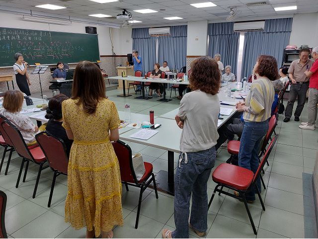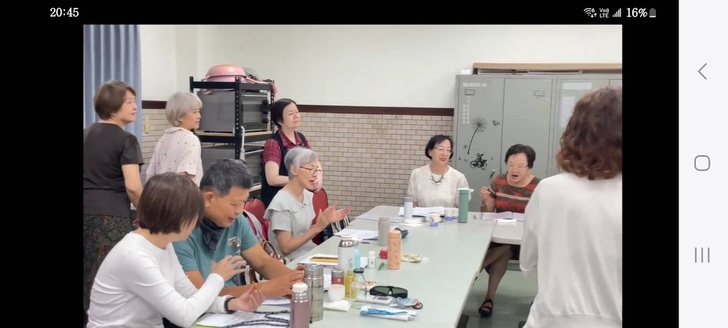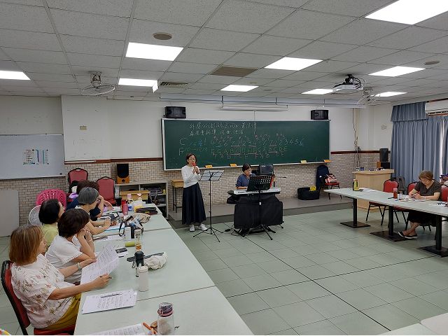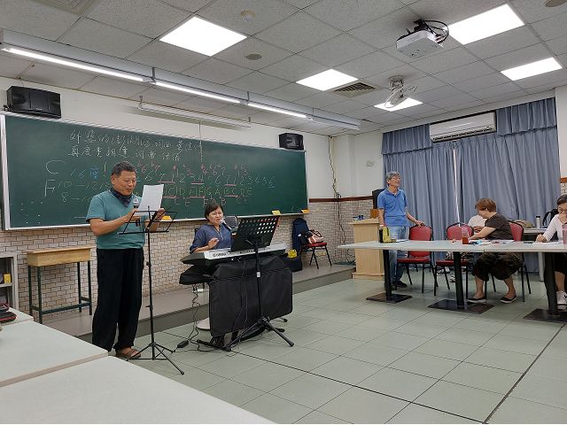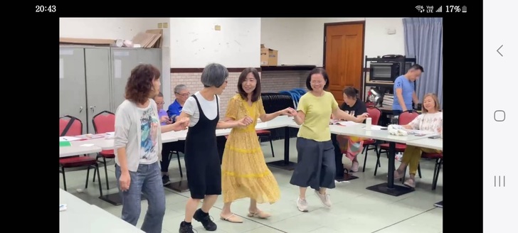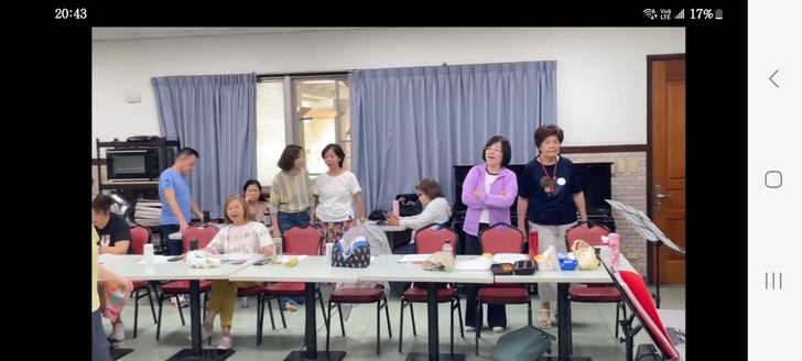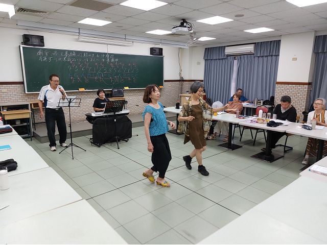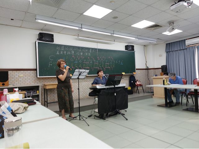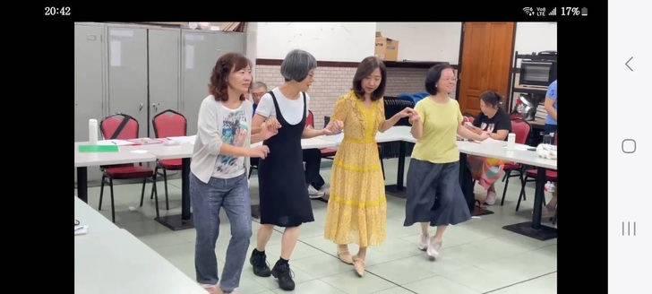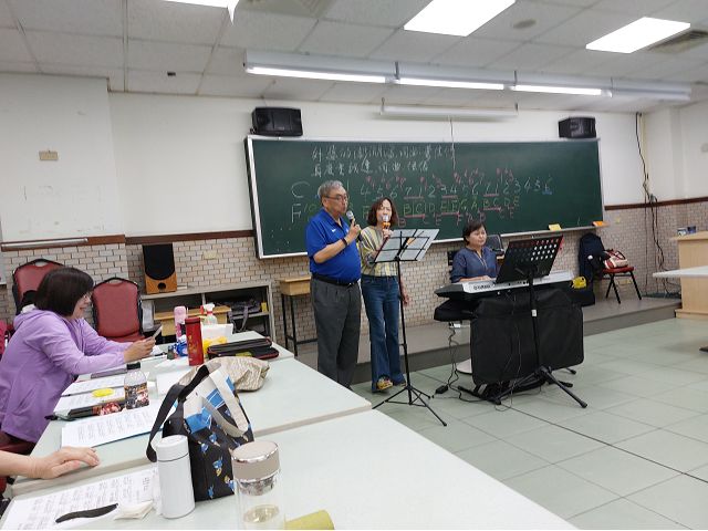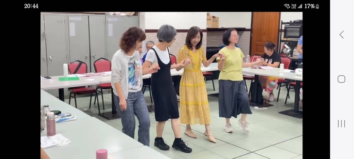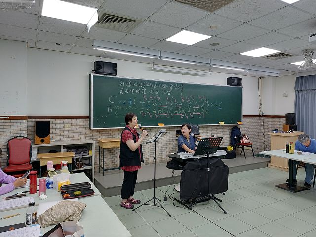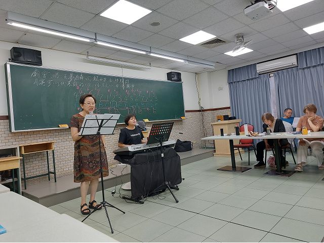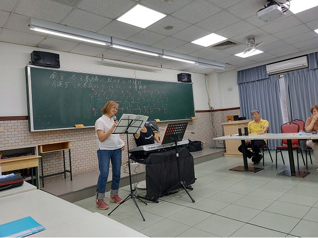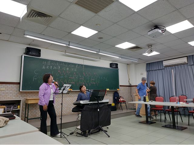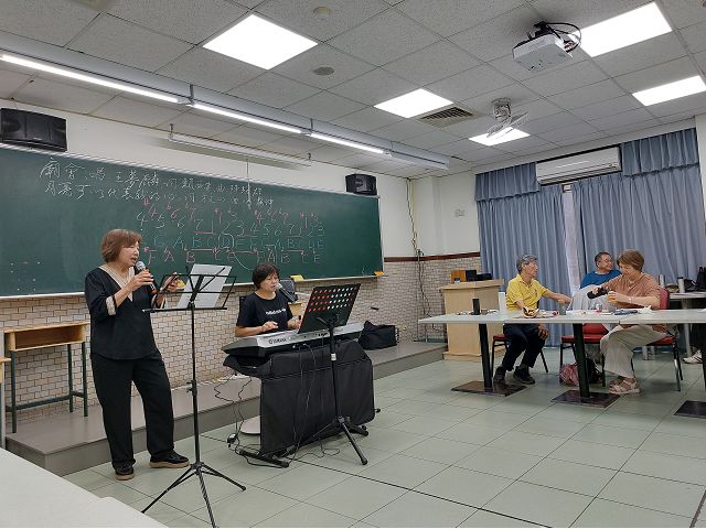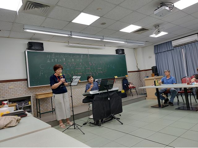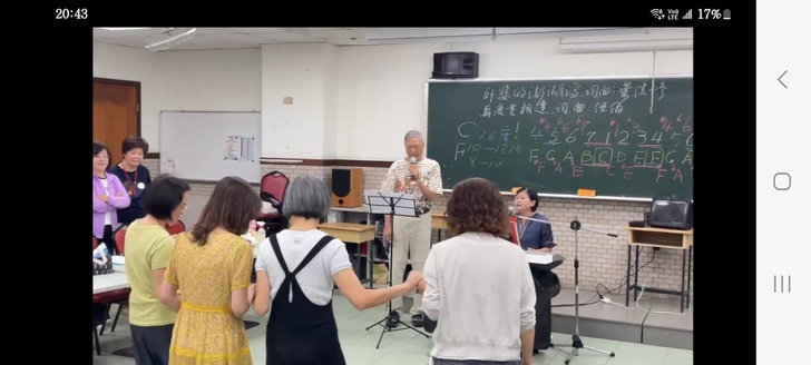 其實,那天不只有唱現教的兩首歌,周哥、安琪夫婦對唱"月亮可以代表我的心"、小蘋唱"天際"、秀梅唱"世界贈與我的"、馬哥唱"秋夜"等,都好聽、動人心弦,尤其班上暱稱情哥王子的馬哥,唱"秋夜"時,雖然手持歌譜,但那是作樣子的,我知道他的視力已衰退至幾乎視而不見,是靠著記譜完整演唱"秋夜"的,記憶力之佳已直追班長了。至於最資深公民唱"外婆的澎湖灣"時,淑芬說,獲有4金釵舞群伴舞的殊榮,可主角要唱、要顧歌譜、要聽老師的伴奏和陪唱,已經手忙腳亂了,那有餘力欣賞舞群伴舞的曼妙舞姿呢,虧得華哥代班錄影、琇惠截圖,才有幾張照片填白,以誌其盛況。