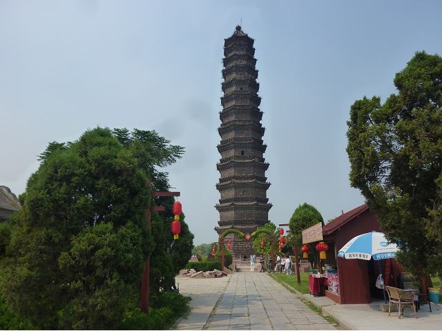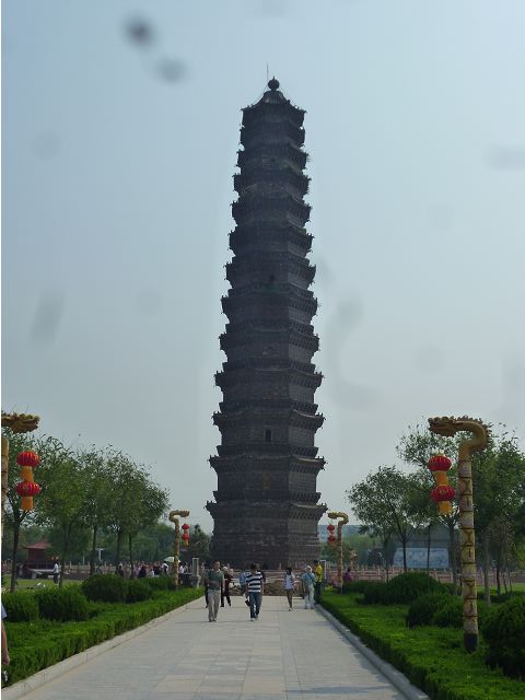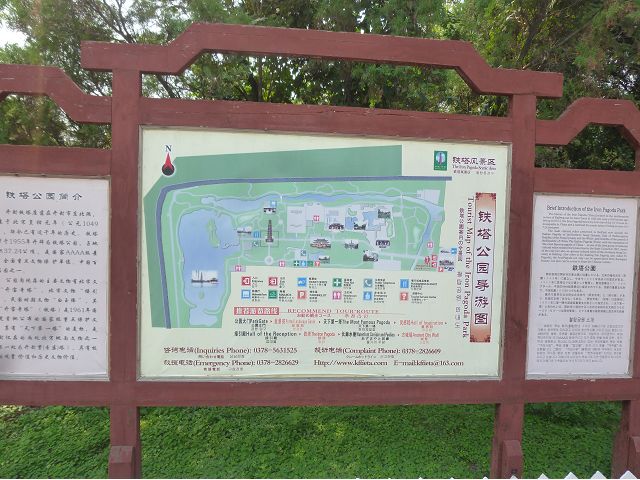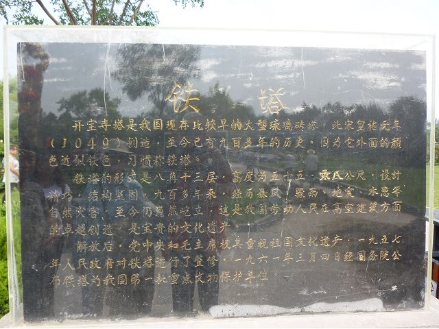 步入鐵塔公園,已見鐵塔尖端隱隱出現於極樂世界牌坊後方,隨後陸續路過"天下第一塔"石碑、"極樂世界"牌坊、"接引殿"寺院後,抵達聳立於公園的開封鐵塔。現存鐵塔係宋仁宗重修燬於火災的開寶寺塔,於皇祐元年(1049)落成,為了防火,改成仿傳統木式結構的磚造塔,並鑲嵌琉璃面磚,塔檐鋪黃色琉璃瓦,八角形塔身,共13層,高55.8公尺,由下而上逐層遞減,通體砌褐色琉璃磚,恍如鐵鏽,遠望似鐵鑄,故民間稱其為鐵塔;磚上刻飾飛天、麒麟、菩薩、樂伎、獅子等花紋圖案,造型優美,神態生動,佛塑像仍完好,堪稱宋代磚雕藝術的傑作。鐵塔設計精巧,結構堅固,歷經戰火、水患、地震等災害而未毀損,依然屹立迄今;北宋古蹟、開封地標,號稱天下第一塔,列為國家級重點保護文物,確實當之無愧。