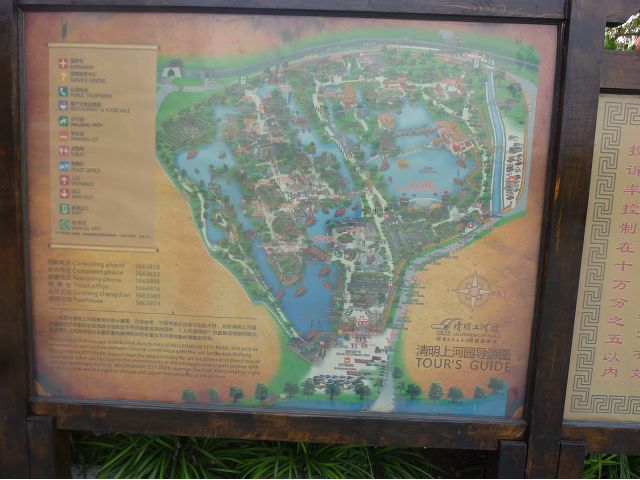 〈按:清明上河園占地600餘畝,其中水域面積約120畝,依照清明上河圖畫作的場景,精心再現了當時的街市風貌、民俗活動和人文景觀。景區裡分為南苑和北苑,汴河蜿蜒如帶,串連起公園內各景點,使各個景區既獨立、又由虹橋相連結。南苑區呈現北宋的民俗風情和市井文化,虹橋以東是迎賓主題區,豎立著張擇端雕像,虹橋以東是住宿休息區,有醉杏樓、文繡院、仿古驛站等建築,虹橋以西是民風民俗區,有工藝和小吃一條街,虹橋以北是遊藝活動區,可以觀賞各種精彩表演及絕活。北苑則呈現皇家園林和古代娛樂主題。〉