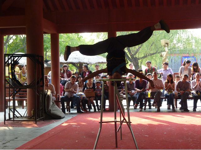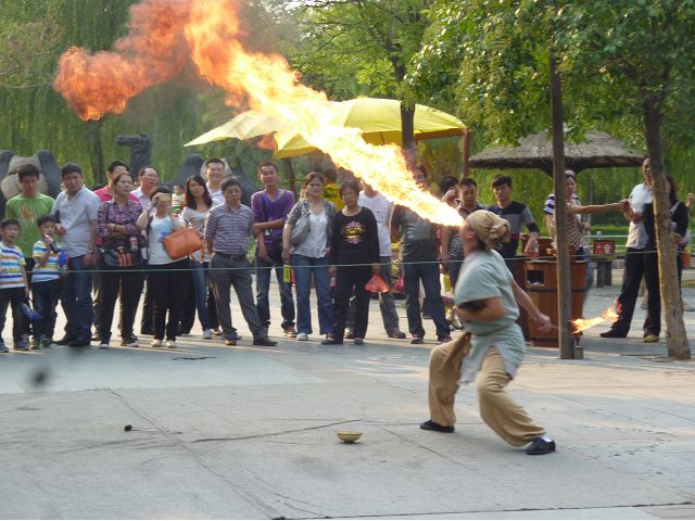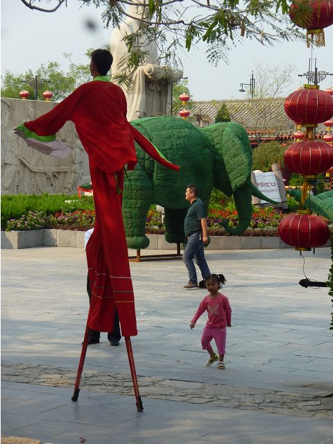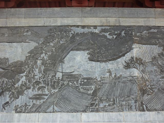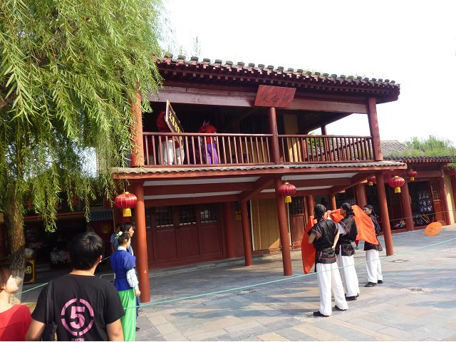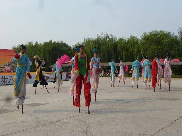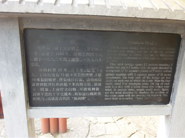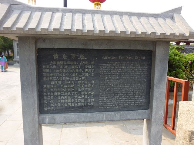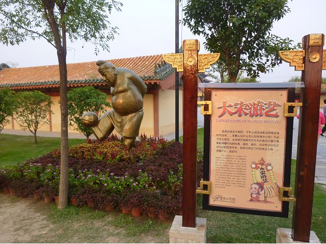 清明上河園位於開封市龍亭湖西岸,是以畫家張擇端的"清明上河圖"畫作為藍本,營建的仿宋代文化主題公園,不僅生動還原、具體呈現原作圖像,且是一座集歷史文化、民俗風情、遊樂體驗於一爐的綜合性旅遊景區,於1998年10月28日開放,已被列為5A級旅遊景區和非物質文化遺產展演基地。漫步園中,彷彿穿越千年,飛越到繁華的北宋都城汴京:古樸典雅、鱗次櫛比的仿宋建築林立著,充斥酒肆茶坊、勾欄瓦舍、糧行綢莊等各色店鋪,一如清明上河圖所描繪人潮洶湧的街市榮景,而身著宋代服飾的園中工作人員穿梭其間,有人在蹴鞠、鬥雞、射箭等表演大宋游藝,也有踩高蹺、民間雜耍和傳統戲曲等等熱鬧場景,可以看到圖畫上的虹橋、碼頭、孫羊正店、腳店、臨水大殿、茗春坊、九龍橋、拂雲閣等景點,還有遊船、觀光車等供遊客遊覽園區,以體驗當時的市井生活、感受其繁榮與活力,亦烘托出一派古都氛圍景象,邊走、邊看,竟不知今夕是何年。