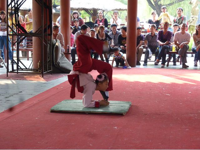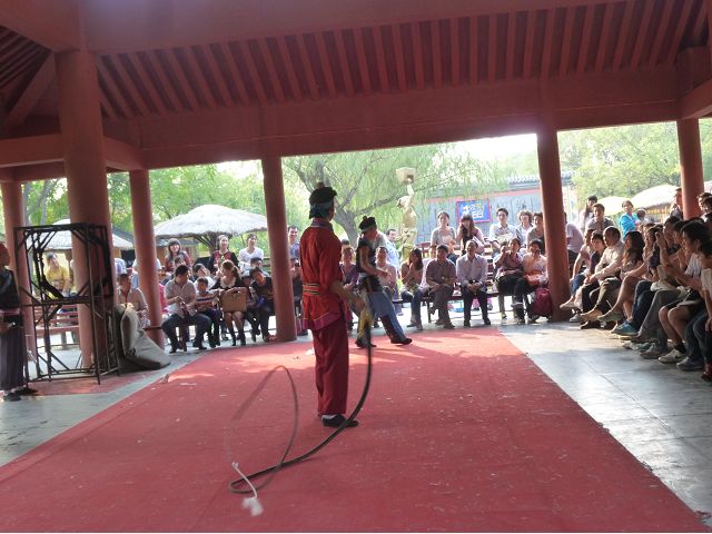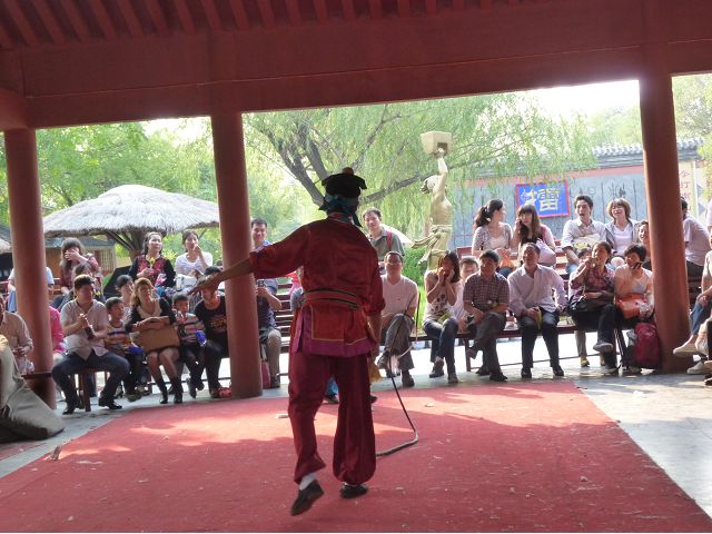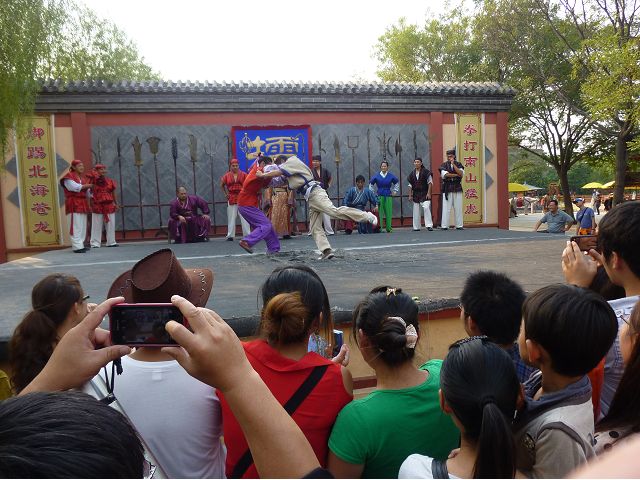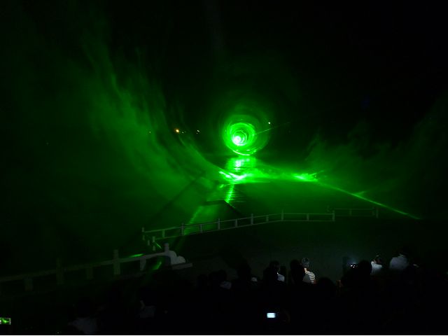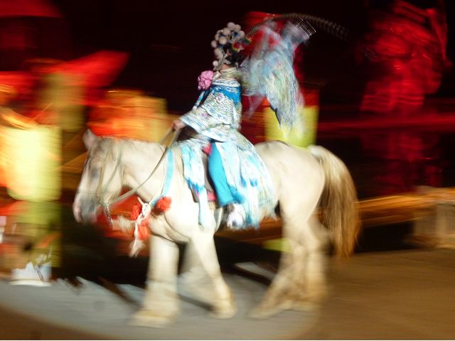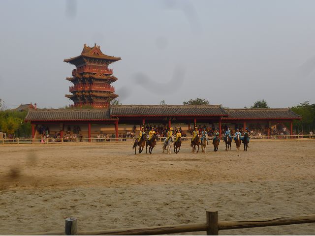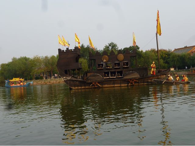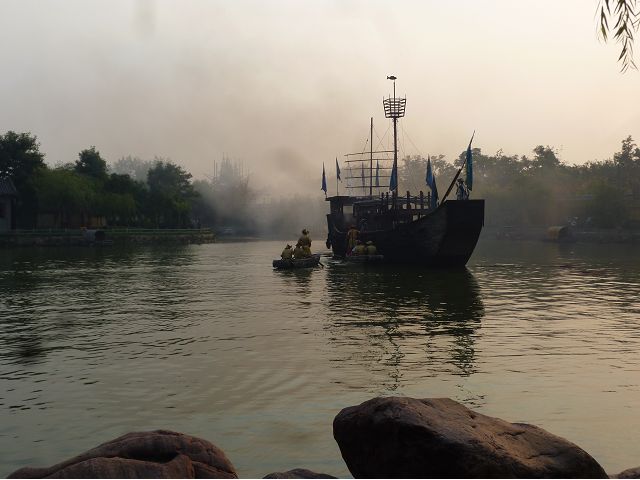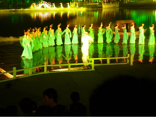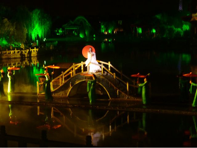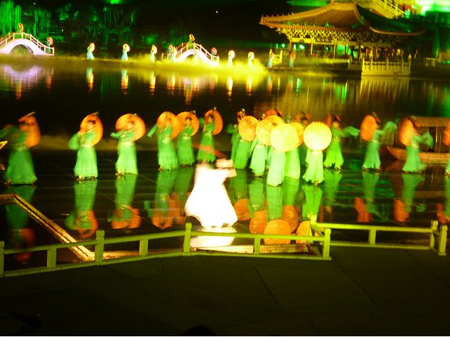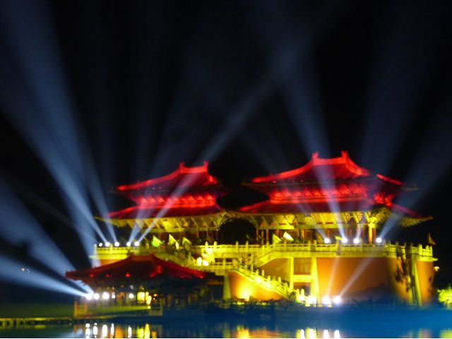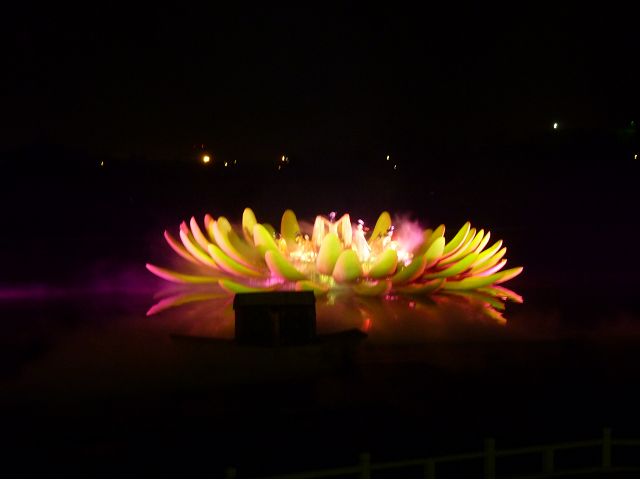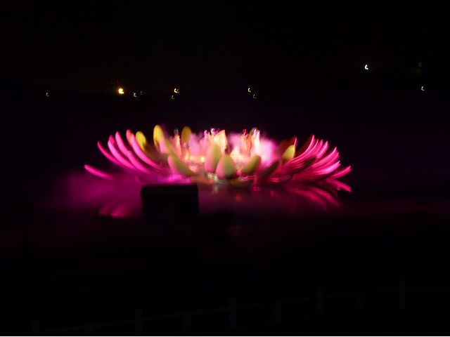 夜幕降臨後,燈光漸次亮起,景象如夢似幻,更增添一份迷人的韻味。我們則於此時進入劇場,觀賞在皇家園林區景龍湖上演出的-"大宋東京夢華"夜間版大型水上實景秀。據說明,全劇結合"清明上河圖"、"東京夢華錄"和耳熟能詳的經典宋詞蘊含意境,演繹北宋王朝鼎盛時期的印像畫卷,以亭台樓榭、水系橋廊為背景,運用燈光映射、流光溢彩的效果,致亭台樓閣、水中明月常隨波盪漾迷離,700多名舞者演員則依劇情演戲,穿插亭台樓閣橋棧間,生動再現了宋代汴京的繁華盛景;全劇共70分鐘,優伶景物隨聲光變換、浮光掠影,連綿不斷,感官深受震撼。