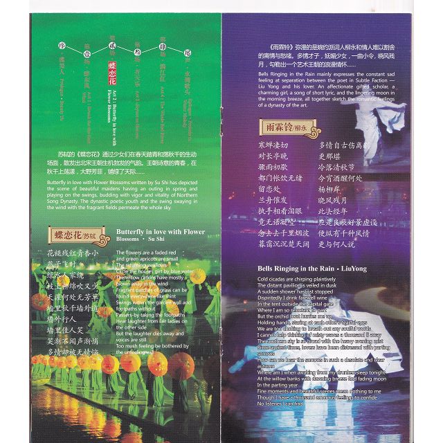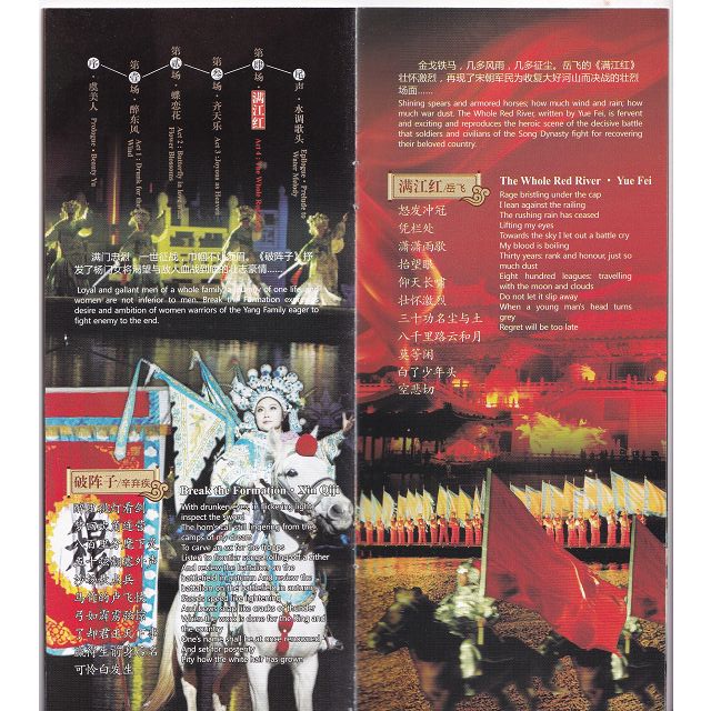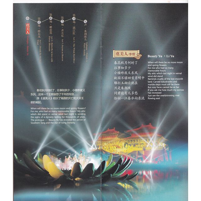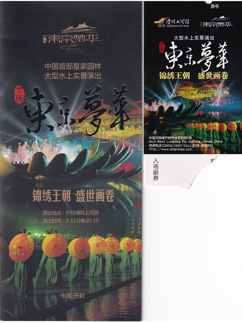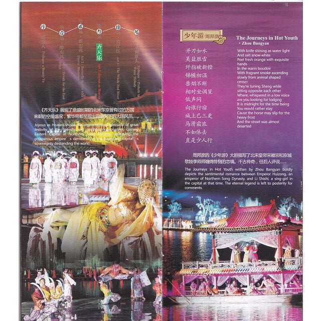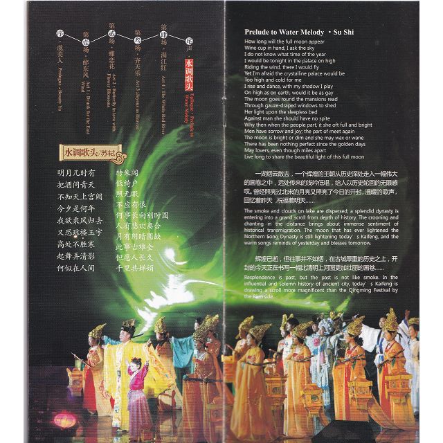 〈大宋東京夢華乙劇於2008年4月5日正式公演,分為日間現實版和夜間版,本人觀賞夜間版演出。全劇涵蓋序、醉東風、蝶戀花、齊天樂、滿江紅和尾聲,共6幕,以李後主"虞美人"為序,其間穿插比較熟悉的宋詞有蘇軾"蝶戀花"、辛棄疾"青玉案"、岳飛"滿江紅"和尾聲蘇軾的"水調歌頭"等,主軸是以經典宋詞意境烘托北宋王朝的輝煌,似乎也寓含盛極而衰的道理。〉