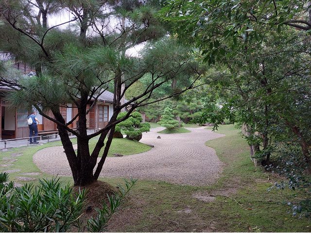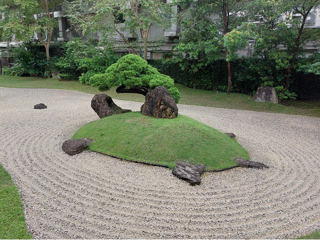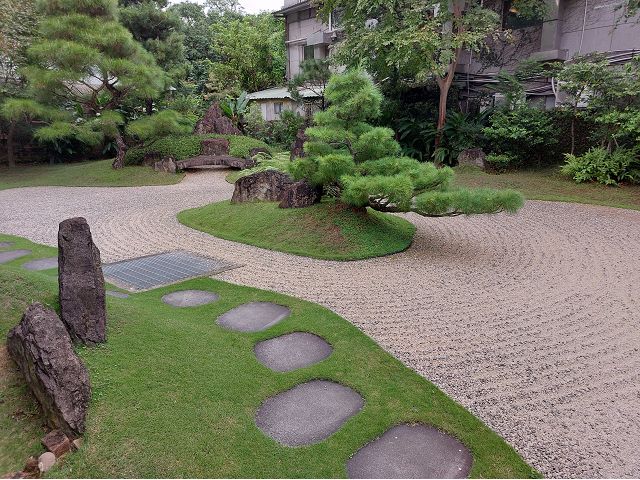 還有荷花池北側的日式木造平房建築-南門町三二三,為日據昭和5年(1930)所建茶屋,光復後,曾為林葉試驗所職員宿舍,嗣經整修,於2014年重新開放,內部空間小,氣氛雅致,但較有看頭的是後方的日式枯山水庭園,是邀請日本庭園家小口基實設計的禪花園,有山有水和龜、鶴二島,搭配著素雅的苔蘚草坪及綠葉植物造景,堆疊有致的石塊代表山,大片面積的淺色碎石表現水,碎石上拖曳出的水波紋線反射內在心境,據說是表現日本佛教寂靜空靈的禪學觀,我這俗人的觀點很簡單,優美庭園賞心悅目,寓意龜鶴延年、長青益壽。