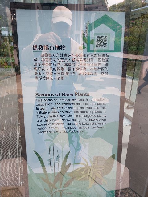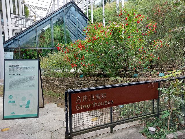 再次是行政院農委會「國家植物園方舟計畫」的溫室群建築,擔任搶救台灣稀有植物免於消失滅絕的展示工作。林葉試驗所目前擁有6座植物園,都座落在海拔1000公以下的都市或淺山地區,研究人員具有充分的植物分類、鑑定與栽培技術,可為植物營造優良的生存環境,非常適合作為受威脅植物的保育基地,乃於民國108年9月4日啟動與林務局、特有生物研究保育中心(已改名農業部生物多樣性研究所)、中興大學惠蓀林場、台大梅峰山地實驗農場、蘭嶼高中等單位建立合作夥伴關係,推動台灣受威脅植物遷地保存工作,讓適合的專業單位依照不同的海拔、氣候條件與植物需求,進行分散式在地保種工作,也希望植物園像一艘方舟,成為原生受威脅植物的避難所,如不幸野外棲地消失,仍然有部分個體能在植物園裡代代繁衍,以保留未來復育野外族群的生機,讓珍貴植物資源獲得永續保存的機會。到植物園,別忘了參觀,很有意義的工作喔。