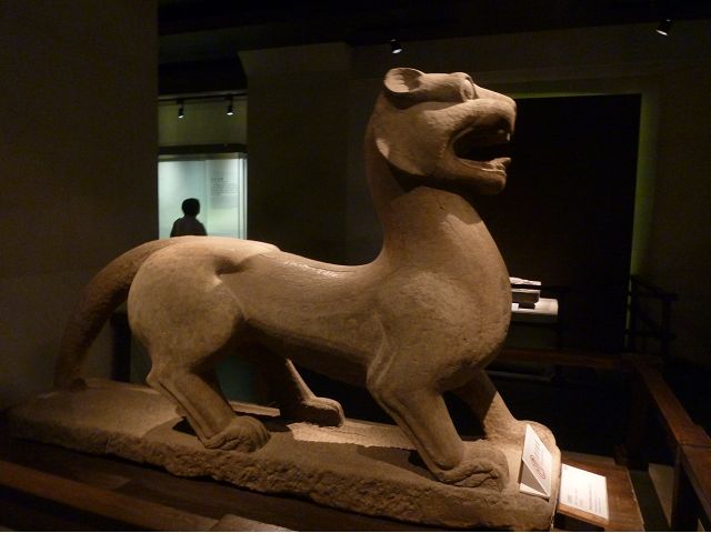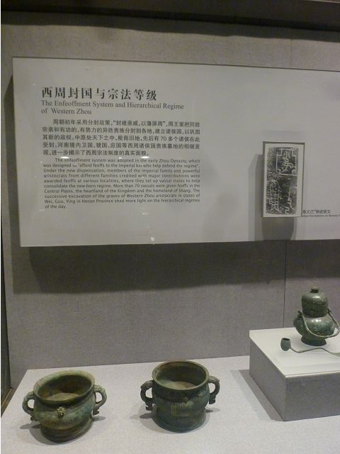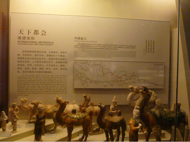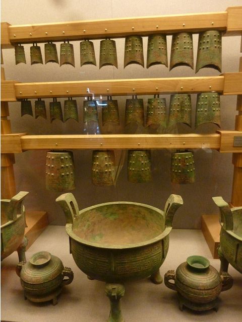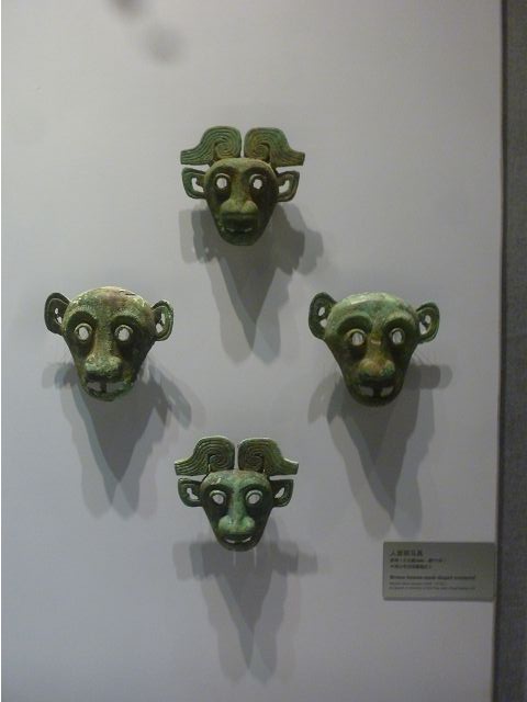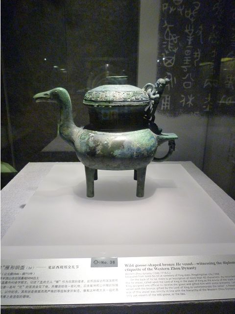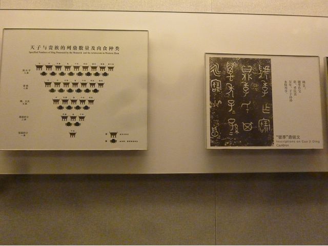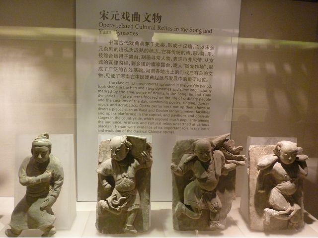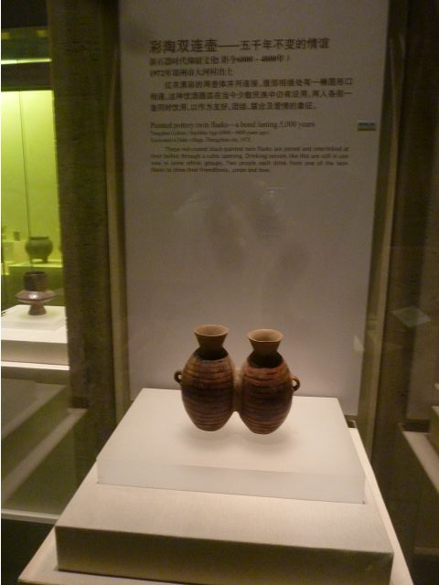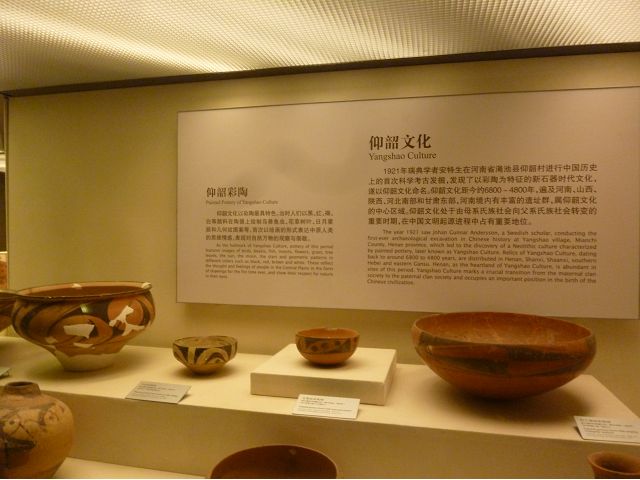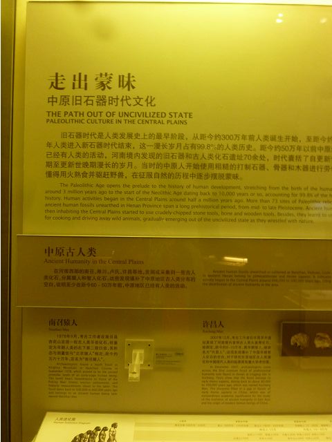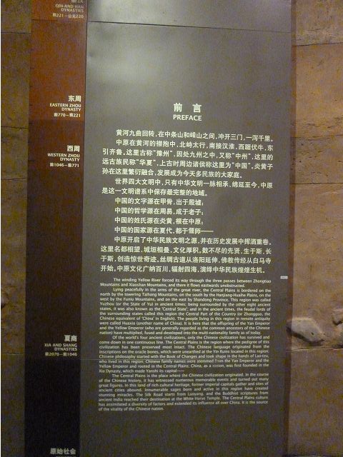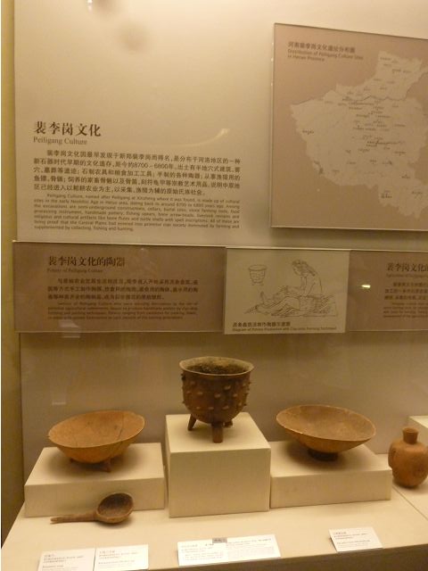 河南博物院建築外觀造型如戴冠的金字塔,據說發想自登封市的元代觀星台,具水面倒影效果的拋光地磚,則是設計的巧思;進入大廳,迎面一座大型銅雕,雙象一人,說是河南省簡稱「豫」字的意象,背後壁畫有代表鄭州名勝的圖案,還有象形文字,樸拙自然,古意盎然。河南博物院主展館在1~3樓、設十個展廳,以「泱泱華夏 擇中建都」為理念,陳列展品文物、圖案解說,從新石器時代、夏商、西周、東周、秦漢魏晉南北朝、隋唐,一路延續至宋、金、元代,包括裴李崗文化時期、仰韶文化時期、河南龍山文化時期,展示了中原地區的文明起源。展示品繁多,眼花撩亂,幸好有專人導覽參觀,好像每一件文物都承載著厚重的歷史信息和文化價值,恍如介紹中原地區歷史悠久的華夏文明史,僅憑信手雜記、擇要摘錄印象較深刻者如後: