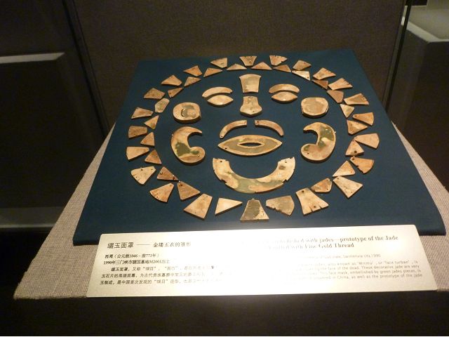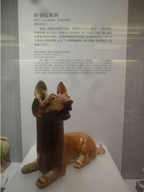 *漢代貴族認為玉可護屍不朽,故以金線編綴玉片製成人體形狀的金縷玉衣為喪葬殮服,覆蓋全身九竅,展示的綴玉面罩即為一例。漢代隨葬器-左臥姿紅釉陶狗,頭部扭轉近90度、雙眼圓睜,警戒造型,身長50厘米,採用泥質紅陶,通體施紅釉,可作為漢代"事死如生"喪葬觀念的見證。