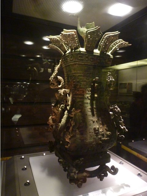 *蓮鶴方壺為春秋時期青銅製的盛酒或盛水器,器形碩大,壺冠飾雙層蓮花,蓋頂是展翅欲飛的仙鶴,壺的兩側有耳,為龍形獸造型,器腹四面各盤踞一虺龍,器足則為兩頭卷尾獸,遍身細雕蟠螭紋,展現高水準的青銅鑄造工藝,專家視為東方最美的青銅器。