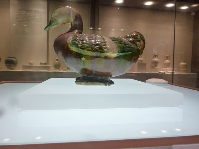 *唐代以三彩釉陶器知名,三彩鴛鴦可作為代表,鴛鴦呈臥姿造型,通體施黃、綠、白三色釉,釉色交融形成斑駁絢麗的視覺效果,寫實與裝飾兼具,展現唐三彩工藝水準。