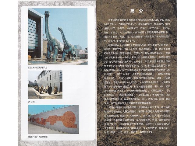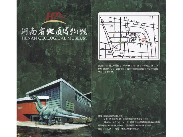 〈按:河南省地質博物館前身為河南省地質局,籌建於1956年,設有地質標本陳列室,藏有化石、岩石和礦物標本436餘種,文化大革命時遭嚴重破壞,標本流失;1983年10月重新籌建河南地質博物館,1984年重新開館,2001年合併河南省地質礦產廳圖書館、資料館,於2008年4月完成組建新館標本展品採集徵集和陳列布展工程。〉