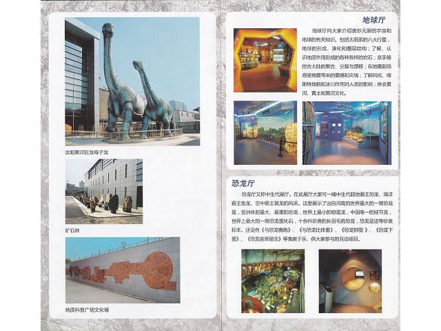 河南省地質博物館(已更名河南自然博物館,鄭州市金水東路18號)館內設有地球廳、恐龍廳、生命演化廳、古象廳、礦產資源廳、地質環境廳、礦物廳、4D動感影院(多功能廳)和地震海嘯感受劇場,館外設置礦石林、科普廣場、恐龍雕塑等,是一座大型的自然科學博物館。館徽由博物館英文名Henan Geological Museum首寫字母組合而成,形似一頭大象奔走在金黃色的懸弧地球表面上,正如標誌所象徵的,表明其地質研究主體是地球,館藏就以發掘出土的恐龍及古生物化石、岩石和礦石標本為大宗,恐龍化石種類多,如汝陽黃河巨龍標本龐大而壯觀,以及各種質地與顏色的岩石和礦石等,都很值得一看。