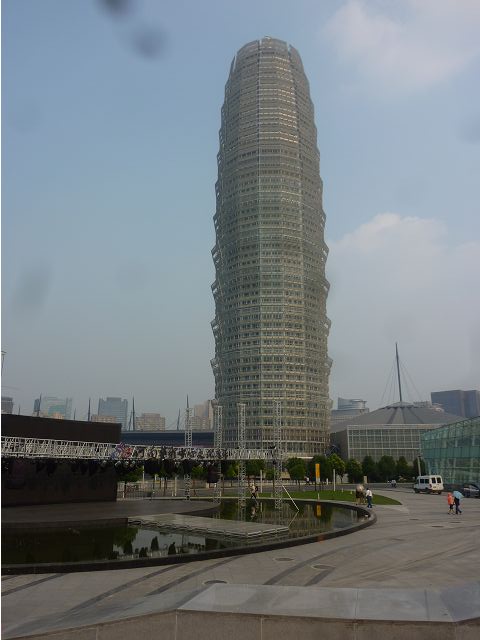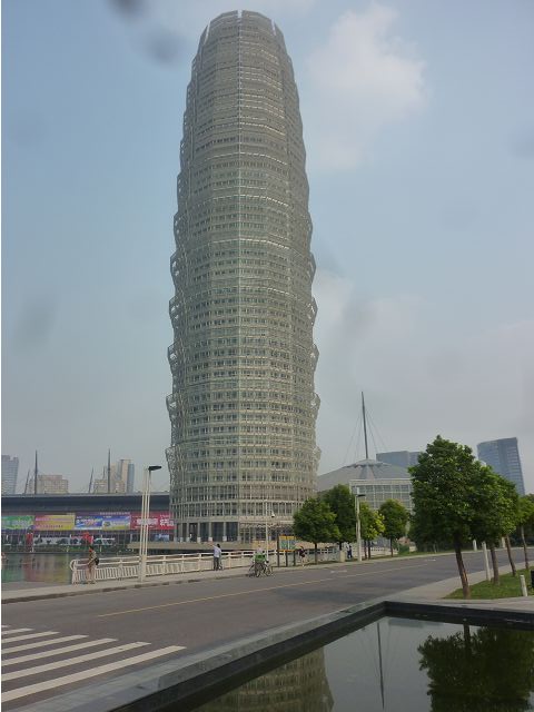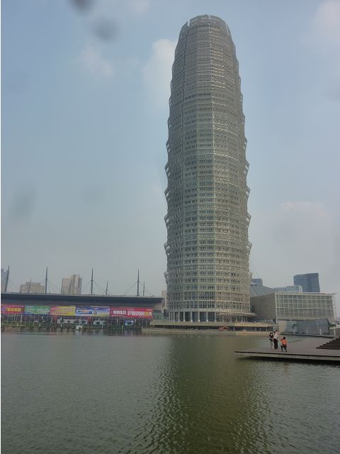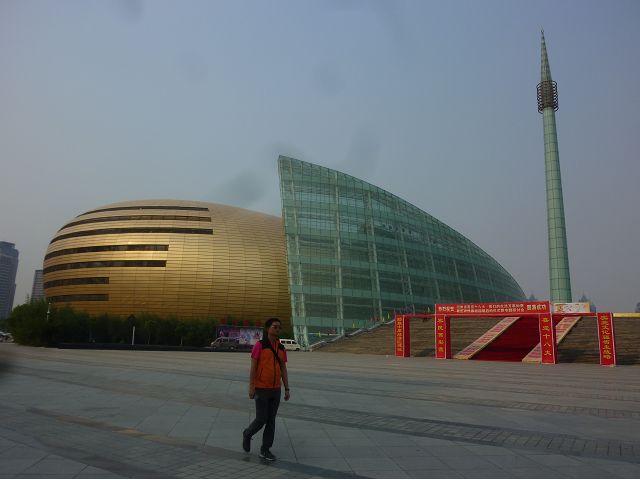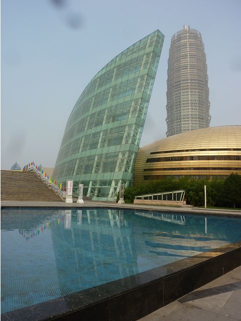 河南藝術中心座落鄭州新區(鄭州市鄭東新區鄭州龍湖商業圈),由五個橢圓體和兩片翻捲上升的藝術牆組成,含大劇場、音樂廳、多功能小劇場、美術館和藝術館,於2007年11月29日完工,夕陽下熠熠生輝,是嶄新的地標性建築。據說,建築設計發想自河南出土的古代樂器陶塤、石排蕭和賈湖骨笛的抽象造型,藝術牆如黃河波濤翻捲的浪花,中間晶瑩剔透的裝飾柱亦是骨笛演化而來,那棟像玉米筍的大樓則是鄭洲綠地JW萬豪酒店,新穎、巍峨、壯觀。匆匆一覽,建築設計將古代中原古老文化跟現代建築技藝結合的巧思,也令人驚嘆,擊節讚賞。