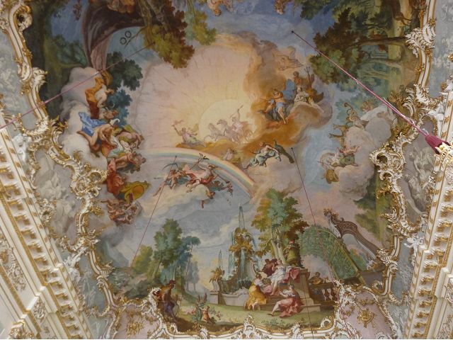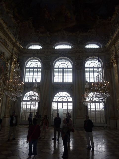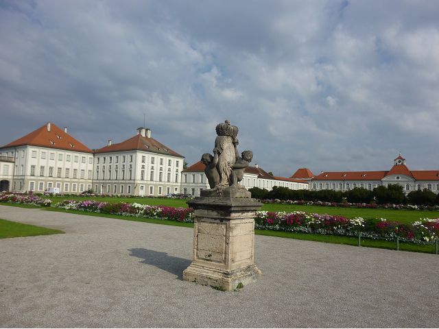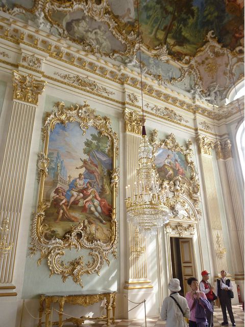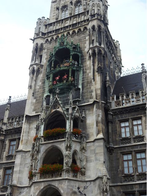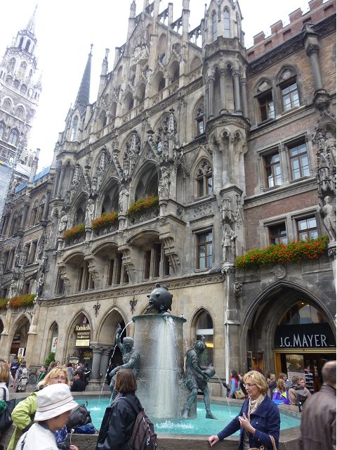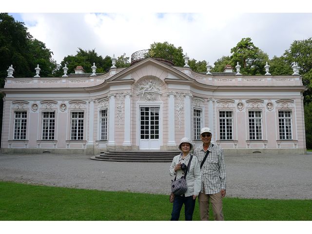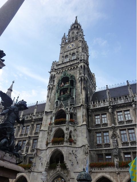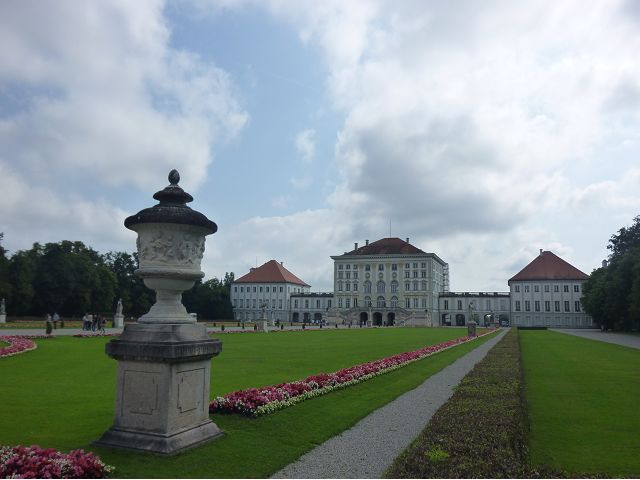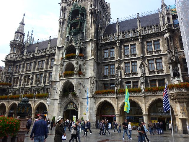 第二天(0729),走訪擁有氣派大花園的寧芬堡宮(Schloss Nymphenburg)、瑪麗恩廣場(Marienplatz)和市政廳。寧芬堡宮是一座巴洛克式宮殿,落成於1675年,為巴伐利亞統治者的夏宮,如今已經成為慕尼黑重要的觀光點。導遊帶領步入開闊庭院的引道,白牆紅屋頂宮殿建築林立、綠地庭園花團錦簇,已讓人讚嘆;進入宮殿內,仰觀宮殿廳堂頂部的壁畫和環視廳堂的裝飾設計,富麗堂皇,王宮珍藏引人入勝,但也讓人眼花撩亂。地陪吳小姐旅德已21年,既專業又敬業,娓娓介紹宮殿館主路德維希家族史等,說道一些房間仍保留著最初的巴洛克風格,其餘的被重新裝飾成洛可可或新古典主義風格,因對其歷史實在不熟,聽來無感,可後花園的樹林步道清幽宜人,曲徑通幽處,水榭宮殿倒影如幻境,真是迷人。