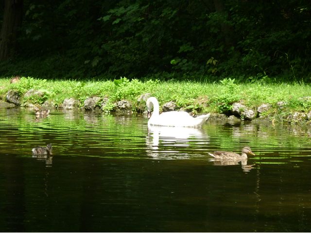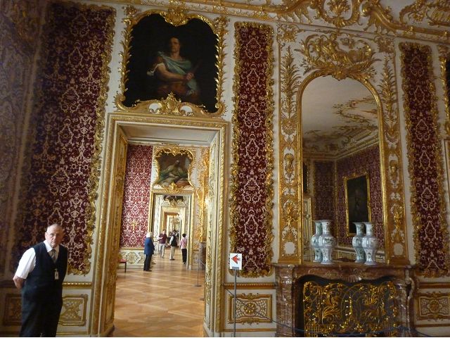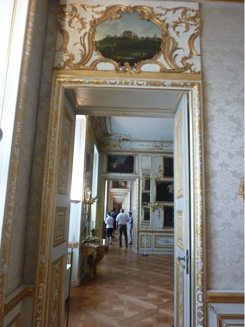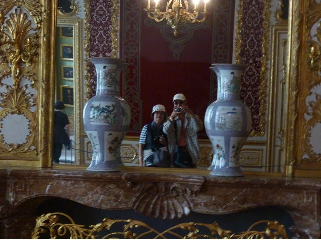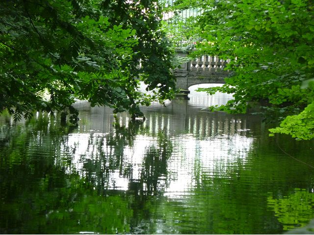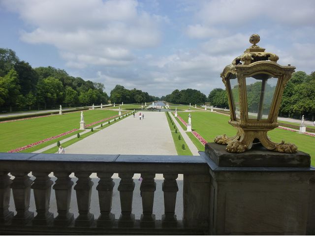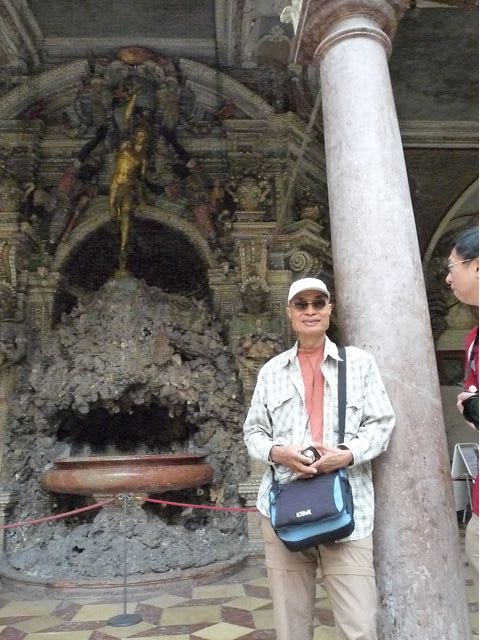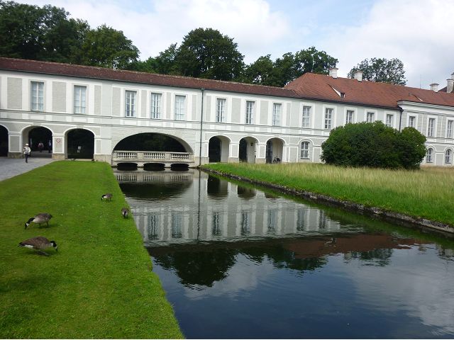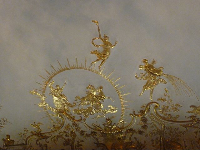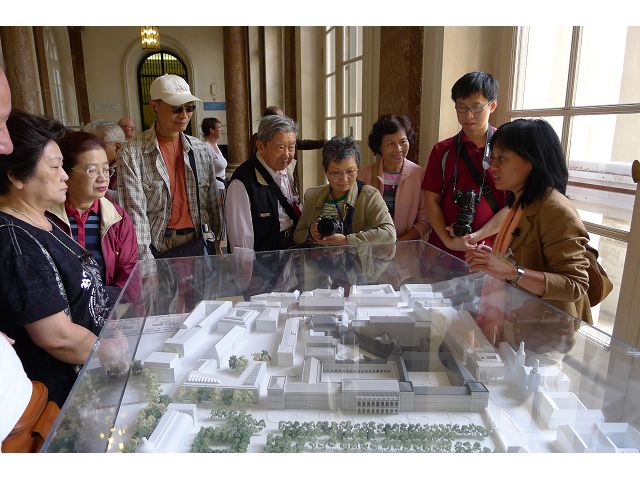 第二天(0729),走訪擁有氣派大花園的寧芬堡宮(Schloss Nymphenburg)、瑪麗恩廣場(Marienplatz)和市政廳。寧芬堡宮是一座巴洛克式宮殿,落成於1675年,為巴伐利亞統治者的夏宮,如今已經成為慕尼黑重要的觀光點。導遊帶領步入開闊庭院的引道,白牆紅屋頂宮殿建築林立、綠地庭園花團錦簇,已讓人讚嘆;進入宮殿內,仰觀宮殿廳堂頂部的壁畫和環視廳堂的裝飾設計,富麗堂皇,王宮珍藏引人入勝,但也讓人眼花撩亂。地陪吳小姐旅德已21年,既專業又敬業,娓娓介紹宮殿館主路德維希家族史等,說道一些房間仍保留著最初的巴洛克風格,其餘的被重新裝飾成洛可可或新古典主義風格,因對其歷史實在不熟,聽來無感,可後花園的樹林步道清幽宜人,曲徑通幽處,水榭宮殿倒影如幻境,真是迷人。