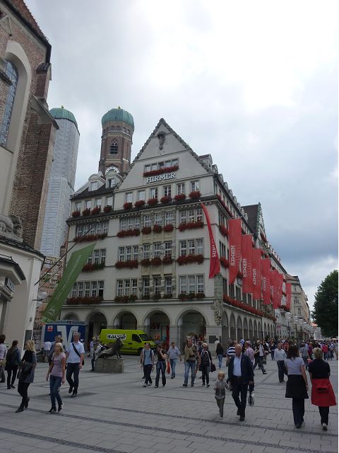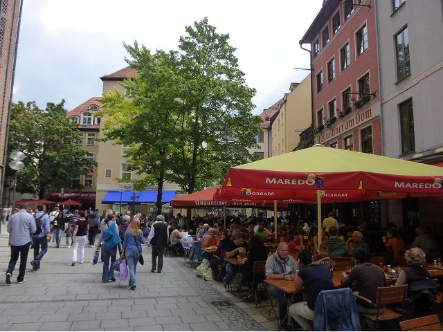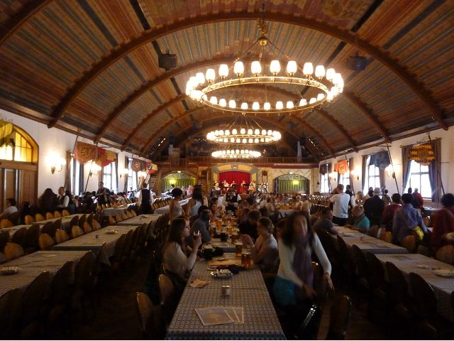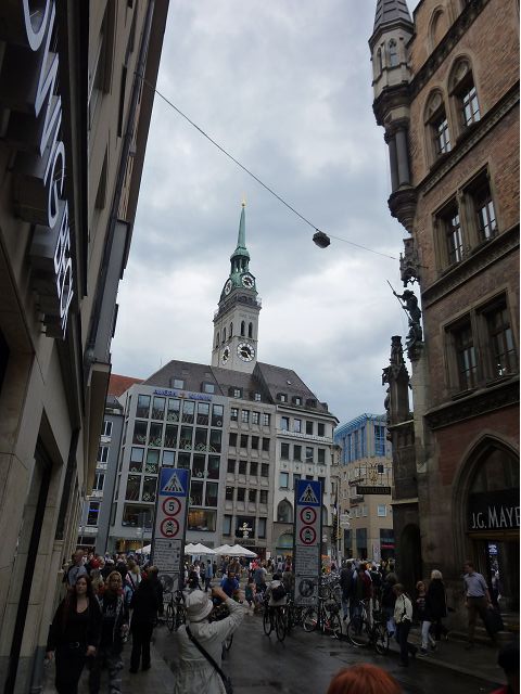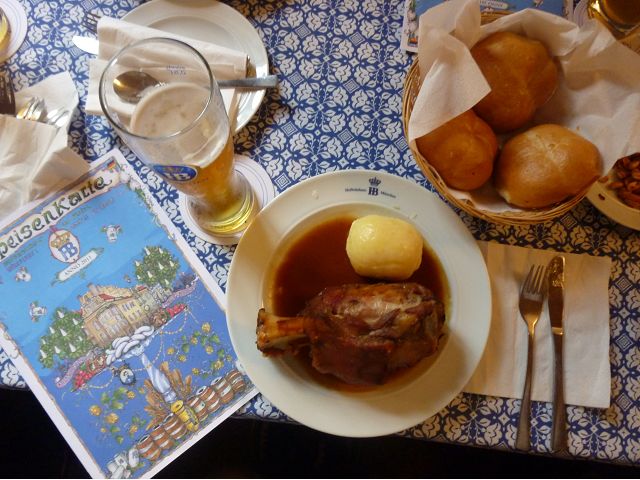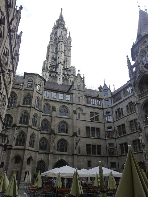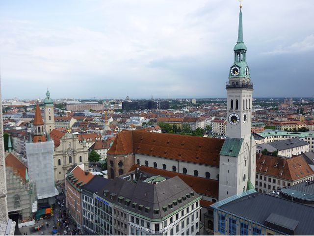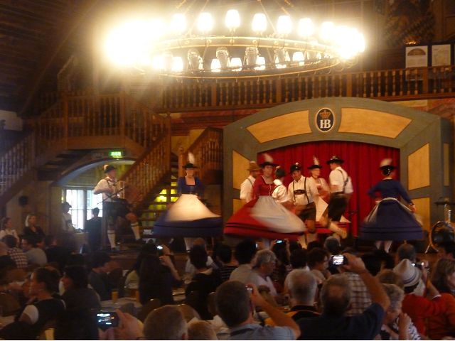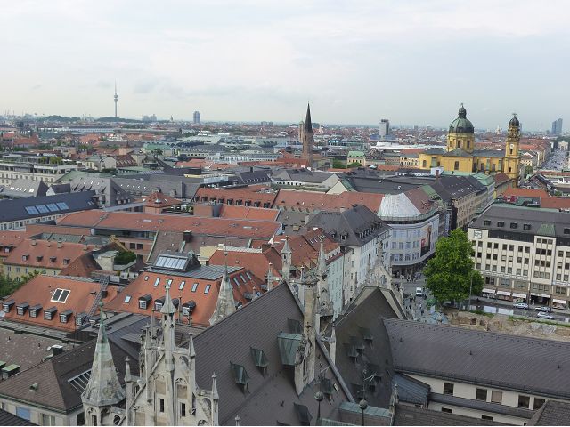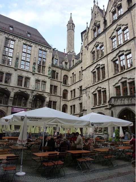 登上市政廳頂樓,俯瞰慕尼黑美麗市容,大片紅色屋頂之間穿插著 聖母教堂(Frauenkirche)、聖伯多祿堂(St. Peter)、聖彼得教堂( St. Peterskirche)等等安寧詳和的圓頂尖塔天際線,巴伐利亞文化藝術之都頗能觸動人心。巴伐利亞以露天啤酒屋文化和豬腳香腸知名,據說,每年十月慕尼黑啤酒節(Oktoberfest)會湧進幾百萬人,蔚為盛況;我們只在建於16世紀的皇家啤酒屋(Hofbräuhaus)晚餐,吃豬腳套餐,附帶看在地秀,場地壯觀,但餐和秀兩者都一般,乏善可陳。