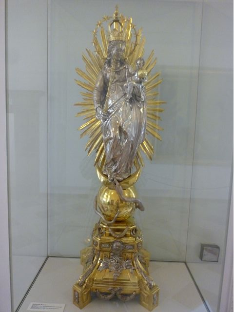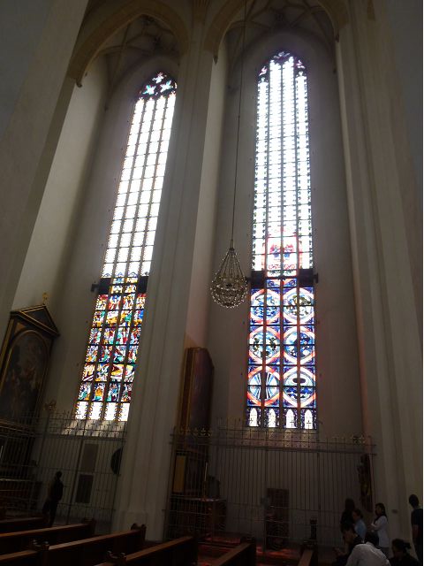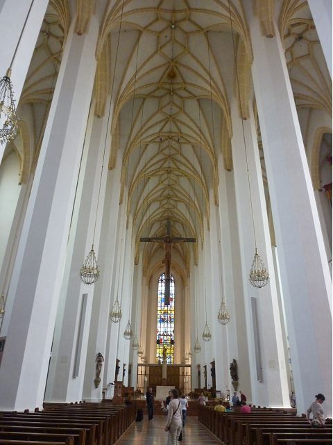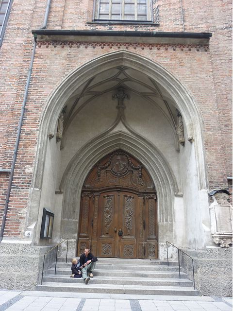 * 聖母教堂(Frauenkirche)在聖母廣場,初建於15世紀,是天主教慕尼黑-弗賴辛總教區的主教座堂,因獨特的洋蔥圓頂雙塔,從市內任何方向都能看到其鐘樓,而成為慕尼黑的重要地標,和新市政廳一樣,是市中心最高的建築和受歡迎的遊覽勝地。推開教堂巨大木門,便可以看到長長的燈飾從天花板垂吊下來,一路照亮引往祭壇的方向,直抵尾端十字架上的耶穌雕像,兩側簡單樸實的細長白柱,間隔著細長窗戶,直線排列整齊,沒有任何裝飾,磁磚地板上卻留有稱作「惡魔的腳印」的水泥腳印。據流傳的老故事說,惡魔要求建築師蓋一間沒有窗戶的教堂,儘管建築師手法再怎麼巧妙,終究讓惡魔發現受騙,憤而踱腳,乃造成磁磚上的水泥腳印坑洞云。