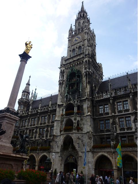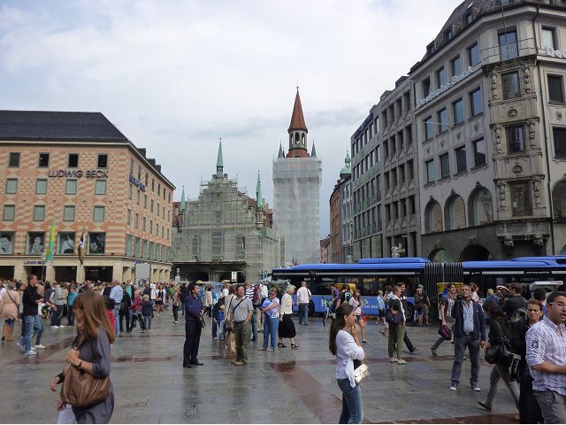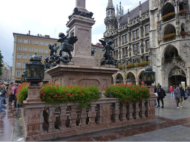 *瑪利恩廣場(Marienplatz)建於1158年,是為了慶祝瑞典軍隊撤離慕尼黑而建造,新舊市政廳都在周邊,廣場中央則是著名的瑪利亞圓柱,頂端是聖母瑪利亞金色雕像,圓柱基座四角各有天使分別斬殺獅子、龍、蛇與怪獸,象徵戰勝戰爭、瘟疫、饑荒和背信,寓意城市克服災難、獲得和平。瑪利安圓柱不僅是宗教象徵,也被視為慕尼黑的地理中心點。舊市政廳為14世紀哥德式建築,目前供市議會使用,廣場北側85公尺高的新市政廳(Neues Rathaus)鐘樓尤為出名,每天固定時間會有木偶秀,由32個真人大小的木偶演出威廉五世公爵於1558年的結婚場景,吸引遊客駐足觀賞。