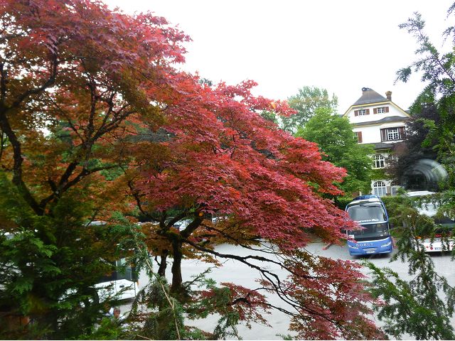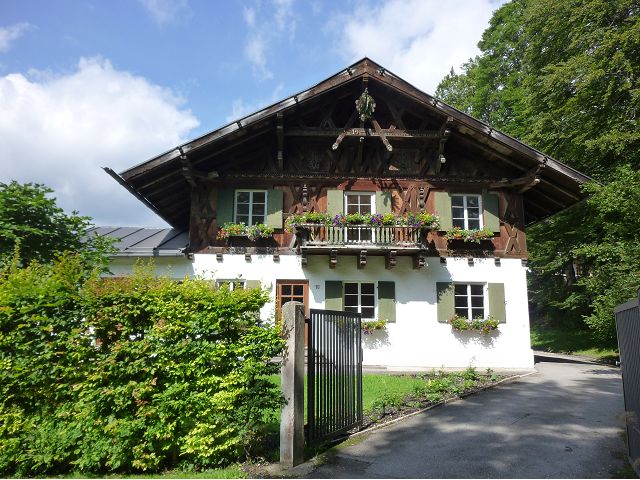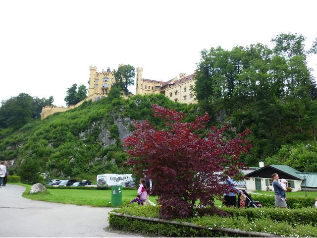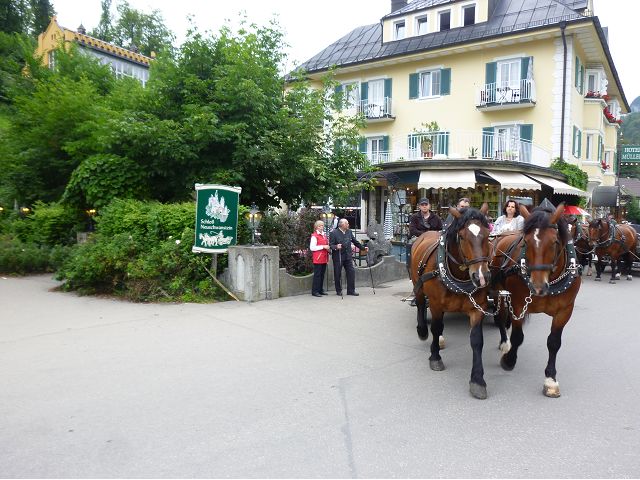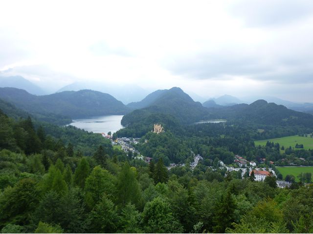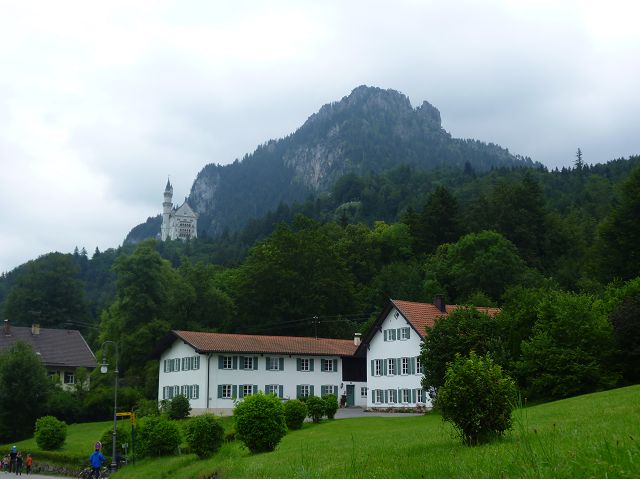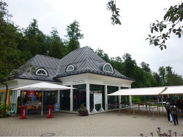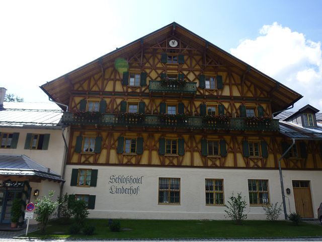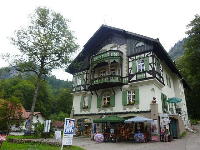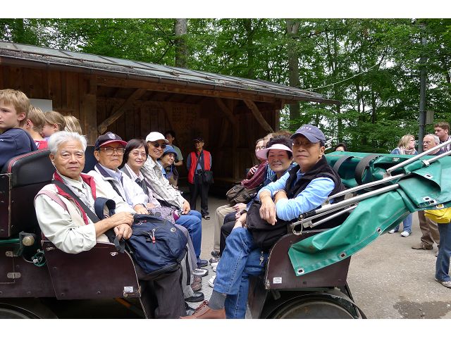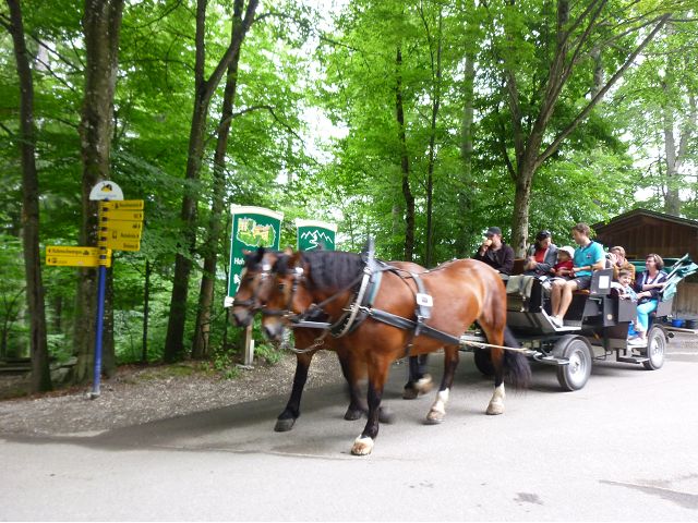 我們坐馬車下山,馬匹拖車,雙馬溫馴秀氣,拖車無蓬,似專為載約十餘客人而設計,緩緩馳行樹林間,滿眼青翠,十分舒適。返回Hohenschwangau馬車出發地,售票亭巴伐利亞民居建築一樣好看,在Ludwigs Stüberl餐廳外牆有一大幅巴伐利亞地區著名的濕壁畫(Lüftlmalerei),描繪當地傳統生活場景,有機會見識到這種在灰泥未乾時進行繪製的壁畫技術,也是一得。夜宿福森(Füssen)火車站旁的Luitpoldpark飯店,離新天鵝堡6公里的優美小鎮,許多遊覽旅客會先安排在此住宿一晚的行程。