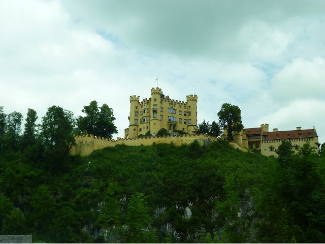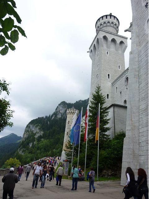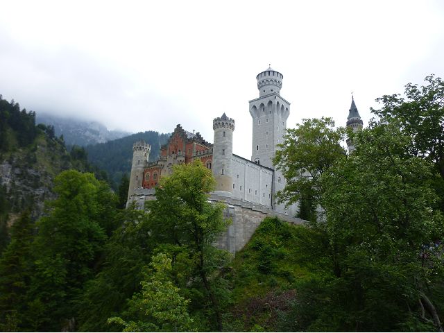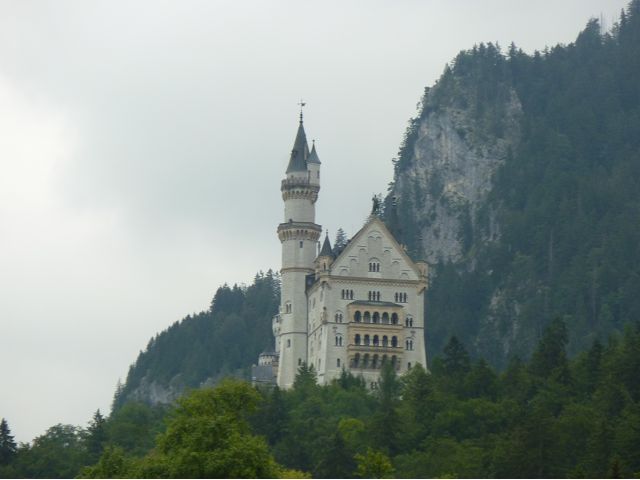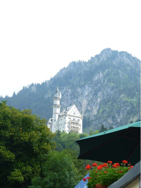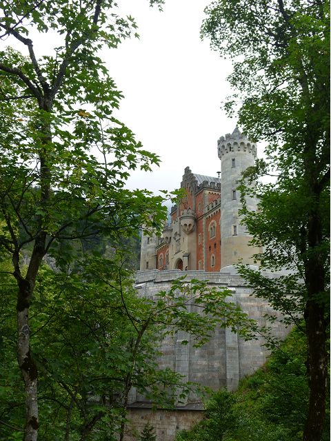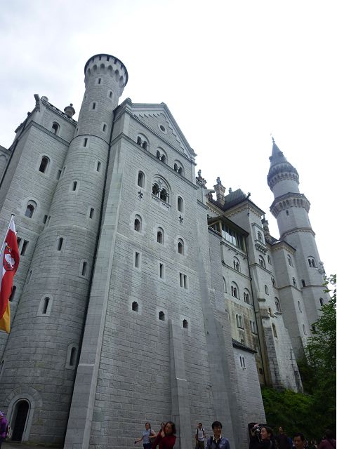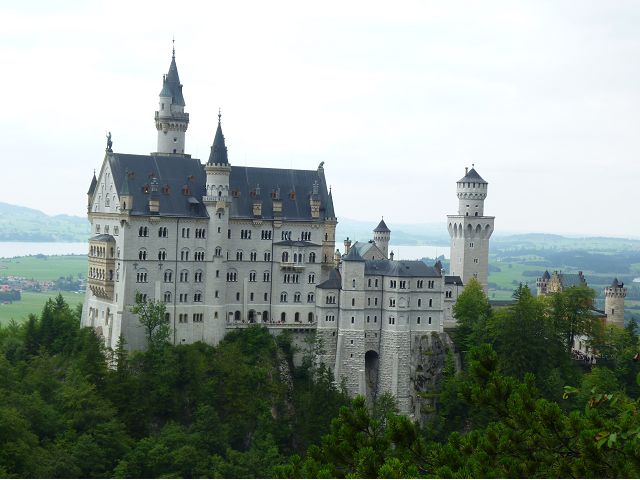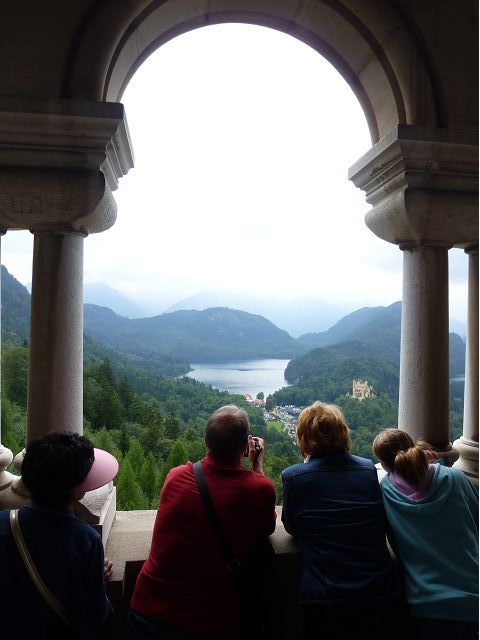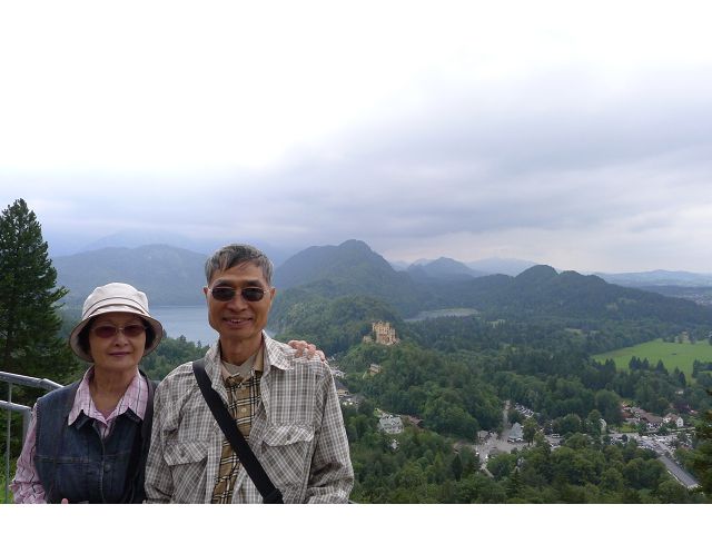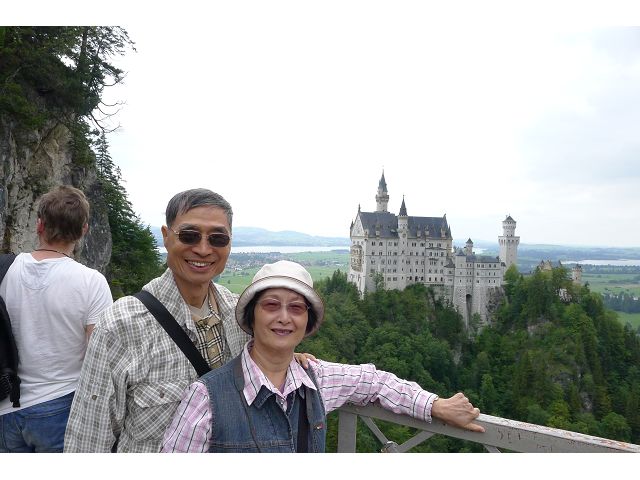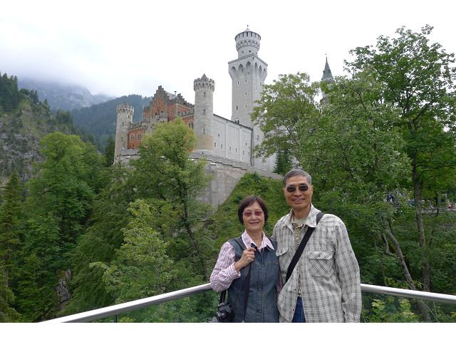 新天鵝堡座落於德國巴伐利亞南部偏遠山區峭壁之上,國王路德維希二世建此宮殿,原作為個人的避世幽居住所,故前往需沿著山路步行或搭乘接駁車上山,我們在山腳下Hohenschwangau的餐館預約接駁車上山,途中可眺望藏身阿爾卑斯山林裡、遙遙相向的新天鵝堡與舊天鵝堡,呼吸清新森林芬多精,倒也不覺旅途勞累。之後,徒步天空步道觀景前行,經橫跨懸崖的瑪莉安橋(Marienbrücke),俯瞰新天鵝堡和鵝黃色舊堡點綴在高山森林、深谷河流間,城堡外觀潔淨優雅,尖塔高聳,連綿青山、藍色湖泊、蜿蜒河流和散佈村落的綠野,景色壯麗,非常好看,遊客如潮湧,紛紛駐足橋上拍照打卡。再前行,在一處觀景台,可回頭看瑪麗安橋,橋上還是擠滿了人,橋下一道瀑布如匹練般自峽谷間奔流而下,峽谷巨岩、鐵橋飛瀑,風景既壯觀又秀麗。站在新天鵝堡廊前觀景,遠望阿爾卑斯山巒景色氣象,又是一番不同的氣氛感受,總是令人看不厭倦。旅行團同樣沒安排參觀宮殿內部,時間、經費所限吧。此生就只一遭,不知宮殿內部玄虛,是否已留下遺憾?(據報導,2025年7月,上述城堡以「巴伐利亞國王路德維希二世的宮殿:新天鵝堡、林德霍夫宮、夏亨宮和海倫基姆湖宮」名義,列入世界文化遺產名錄,是德國最受歡迎的旅遊景點之一。)