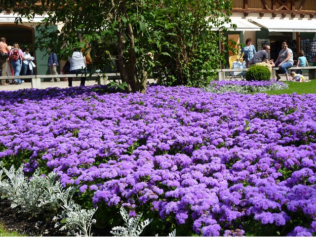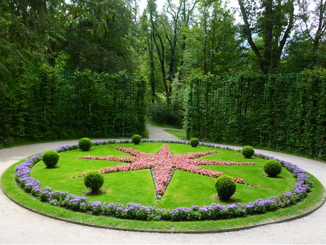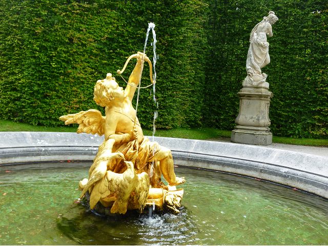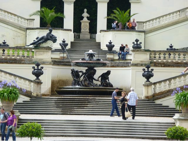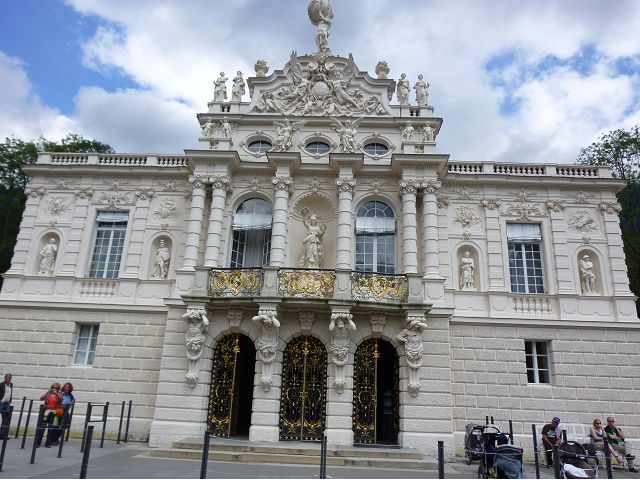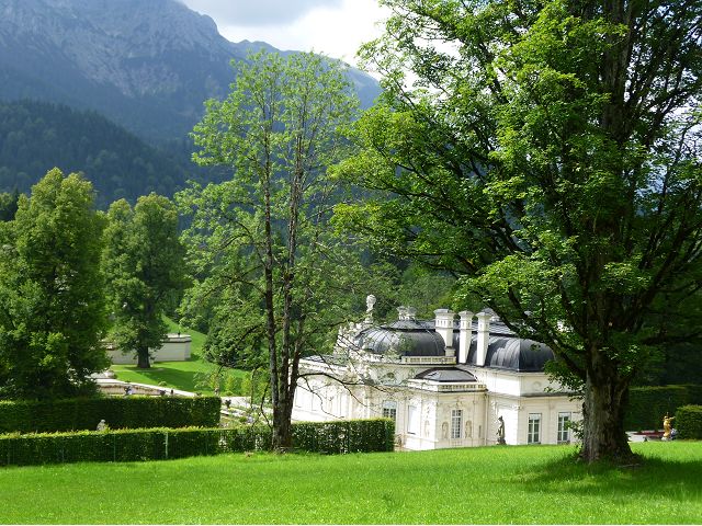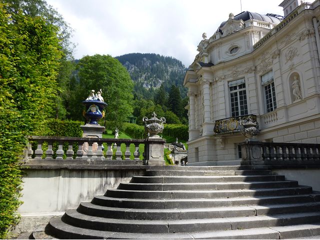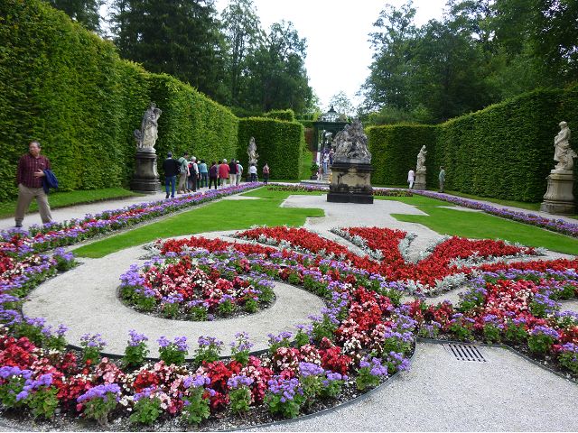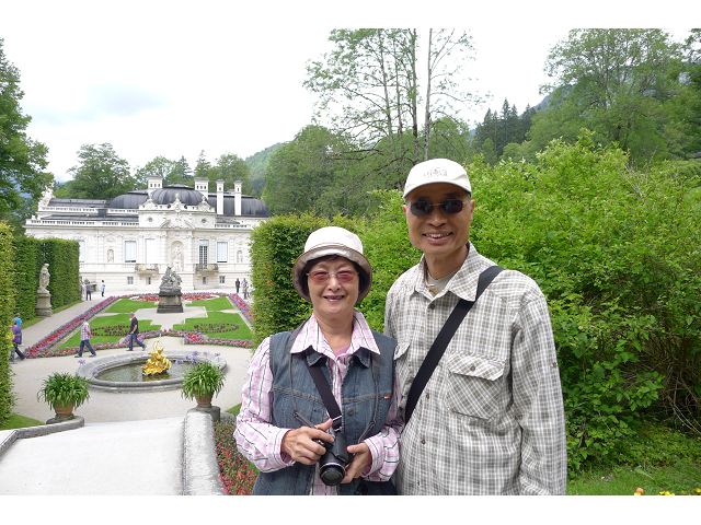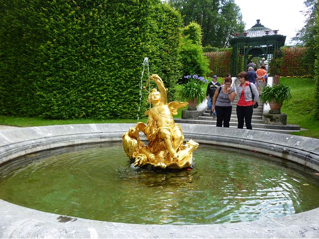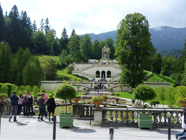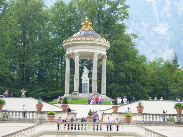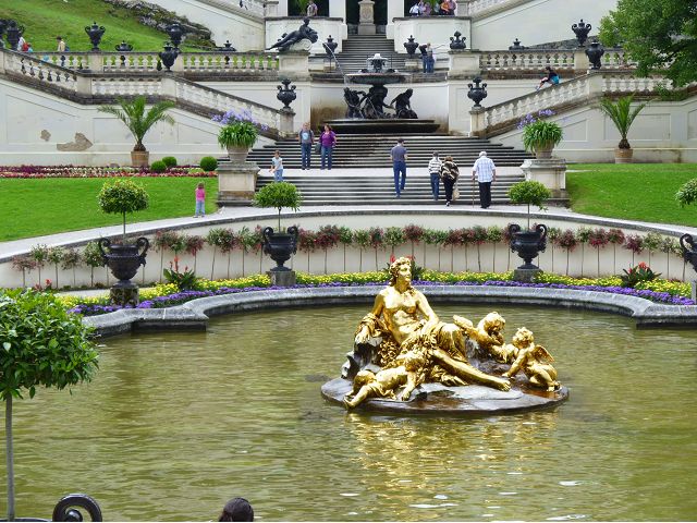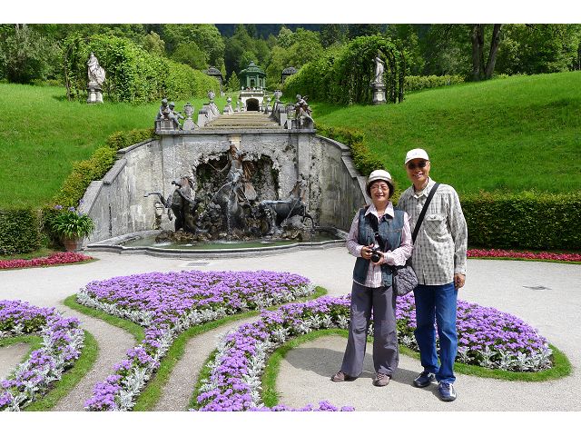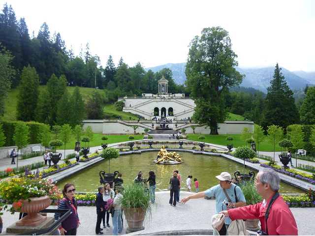 第四天(07/31),走訪阿爾卑斯山區裡,由巴伐利亞自由浪漫、喜好藝術的傳奇國王路德維希二世所建的林德霍夫宮(Schloss Linderhof)和新天鵝堡(Schloss Neuschwanstein)。林德霍夫宮是國王所建三座王宮中最小的一座(另外兩座為新天鵝堡、海倫基姆湖宮),建於1874~1878年間,也是他在世時唯一完工的一座,座落巴伐利亞州西南部上阿瑪高(Obermmergau)附近一處靜謐的山谷之中,小巧精緻,作為其私人行宮。參觀時,需走一段長長的林蔭小徑,沿路周遭景色漂亮,抵達時看見一棟最醒目的傳統巴伐利亞經典半木結構(half-timbered)風格建築,上半部是裸露的深色木樑結構,設有多個帶綠色百葉窗的窗戶和陽台,下半部為白色粉刷外牆面,標識著Schloßhotel Linderhof名稱,極具特色。宮殿前後方都是花園,規劃嚴謹,佈署精緻,井然有序,各有相對應的噴泉、裝飾品、綠色長廊和雕塑,花團錦簇,真是漂亮,尤其紫色花海搶眼之至。宮殿前方花園採典型的法式對稱植栽設計,中央是大型噴水池,噴泉揮灑在金色維納斯和天使海豚的雕像上,步上頂端觀景台,俯瞰整個宮殿,直可比擬凡爾賽宮,非常壯觀。宮殿後方的北方花園則風格迥異,綠色山坡頂上一座綠色音樂亭子,泉水從那裡慢慢流洩而下,底部是希臘神話裡的海神青銅塑像,手持三叉戟駕馭著馬群,噴泉四射;還有可愛的拉弓金色邱比特,潺潺噴泉水代替了他的箭,很逗趣,邱比特射出水箭是否也帶來溫柔的愛,不知是甜蜜或痛苦?旅行團沒安排參觀宮殿內部,但這座阿爾卑斯山腳下的宮殿庭院,與自然和諧交融,寧靜安祥,美得令人難忘,印象深刻。