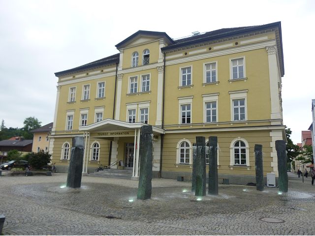 *遊客中心在馬克西米利安皇帝廣場(Kaiser-Maximilian-Platz)邊,黃色古典風格的建築,屋前則裝置現代風格的石柱噴泉,門口上方卻是英文"TOURIST INFORMATION"標示,混搭一處也不違和。