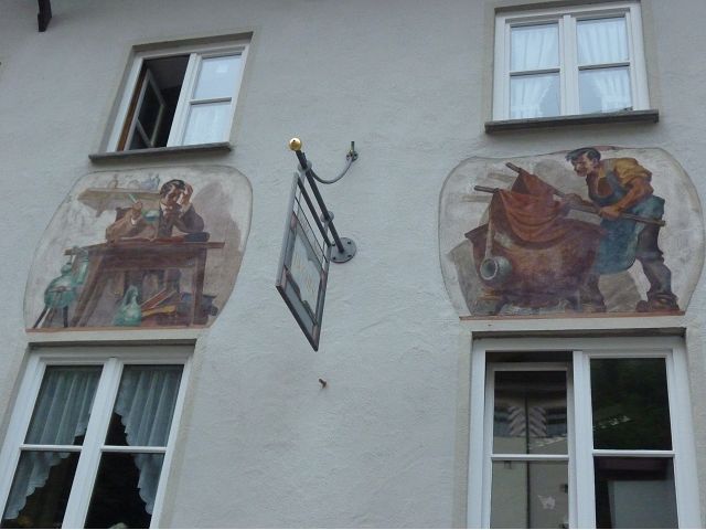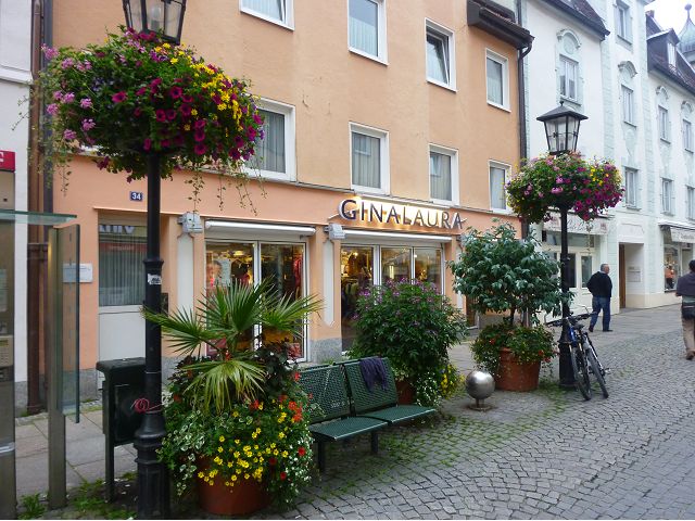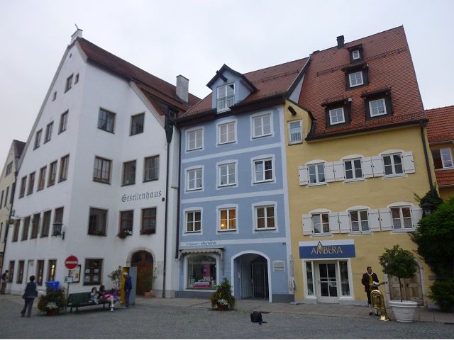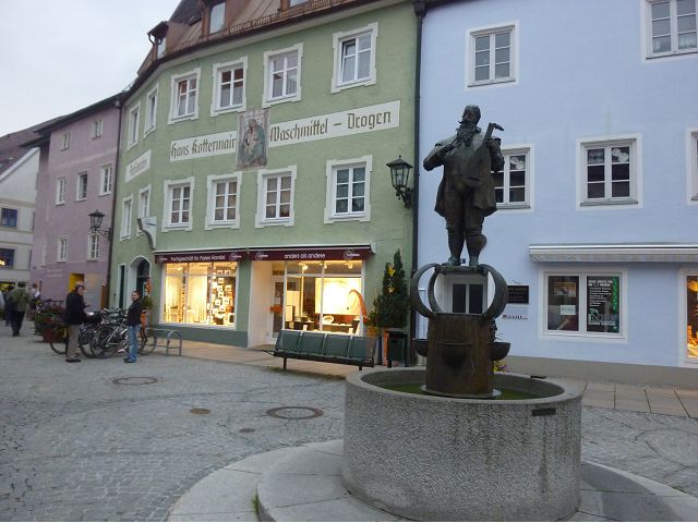 *市中心噴泉(Stadtbrunnen)廣場,周圍建築物是典型的巴伐利亞或阿爾卑斯山區風格,屋頂陡峭、外牆色彩鮮豔,可作為舊城區老建築的代表。在施蘭嫩廣場(Schrannenplatz)三棟相連的傳統巴伐利亞歷史建築,一樣具有陡峭的屋頂和彩色的外牆,左邊的白色建築稱為"Gesellenhaus",意為學徒之家。