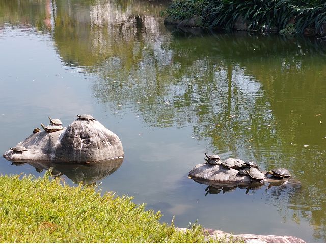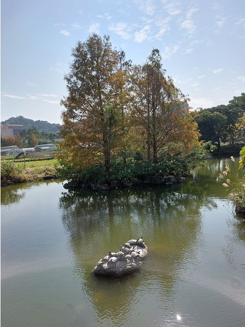晴朗好天氣(1/17),臨時起意想出門走走、曬曬太陽,於是,選擇搭乘捷運就近到駕輕就熟的台大校園散步。沿舟山路往校園裡頭走,甩掉車馬喧囂,迎面左側小木屋鬆餅店前總是一樣站著好多客人,右側生命科學館大樓前綠蔭扶疏,掩映兩側迴廊,顯得幽微深遠。再前行,瑠公圳水源池在望,這座台大與台北市瑠公農田水利會合作,為復育昔日流經台大校園的瑠公圳大安支線而打造的生態池,重現了濕地生態、親水空間,已成為校園內賞鳥與生態教育的知名景點;水池周邊植栽與池內水生植物並陳,湖面倒影婆娑,綠意盎然,烏龜盤踞著池中三兩浮石,向旁觀遊人悠然示範冬日曬太陽的愉悅,是正宗野人獻曝喔;每次來,都讓我們駐足觀賞良久,看烏龜,懶洋洋曬太陽,樂此不疲。