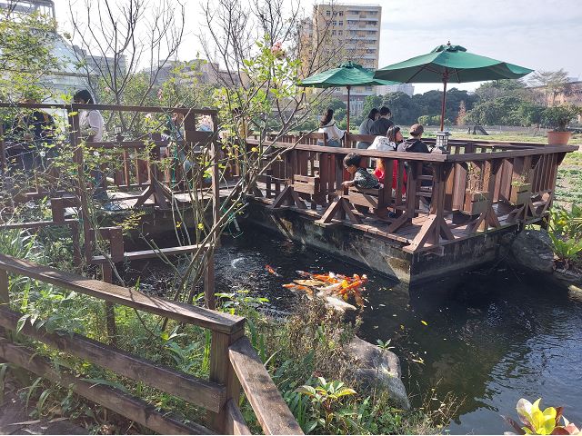 續前行,在水車造景處轉往台大農場訪客中心(即早年所稱綠房子),沿路望去,滿眼台大試驗農場自然田園風光,賞心悅目,進入綠葉環繞的訪客中心,池子裡錦鯉爭逐,生機盎然,觀魚之樂令人渾然忘我。在裡頭咖啡廳喝個下午茶,餐點是其特色,使用農場自己的產品,原料貨真價實,奶酪、蛋塔等都順口,但咖啡選項不多。到此歇歇腳,環境清幽,望著藍天、小橋、流水與大片綠意,心曠神怡,有如世外桃源。(請參閱:「20250320老友漫遊台大校園.台大農場訪客中心喝咖啡.椰林大道觀賞杜鵑花魯冰花.快意高歌杜鵑花.禮賢樓品軒樓午餐物美價廉https://blog.udn.com/jkt19813/182118118」)