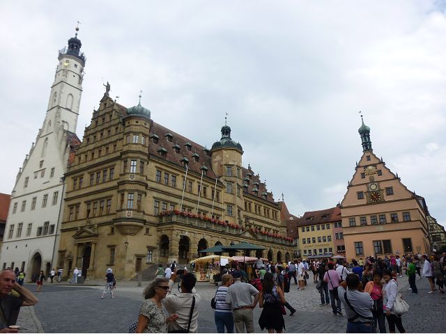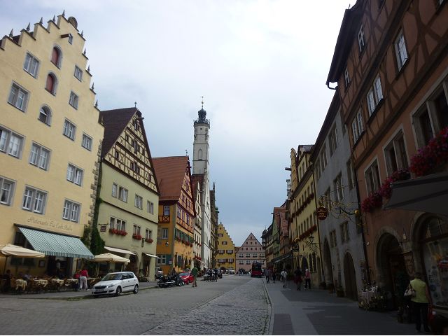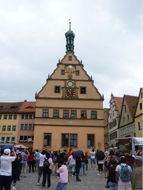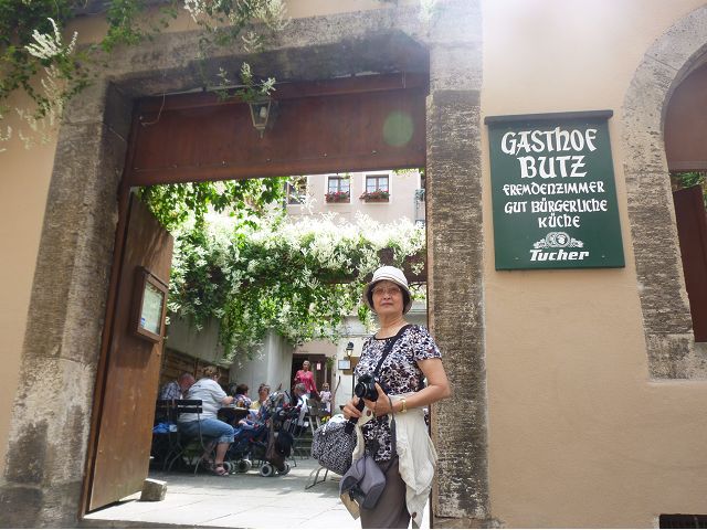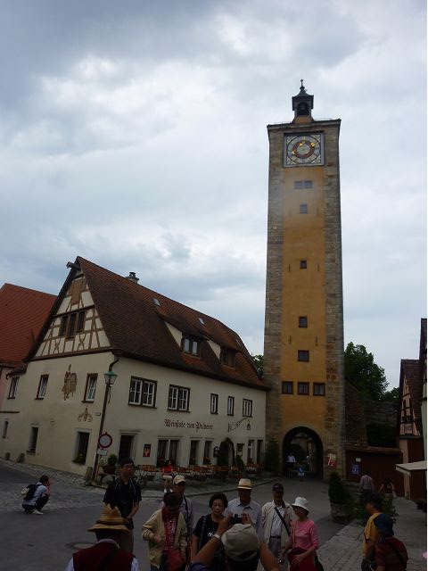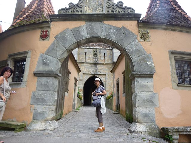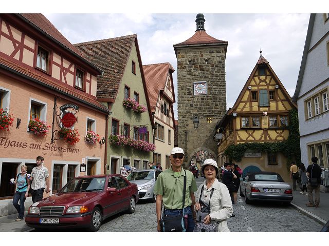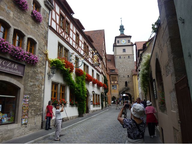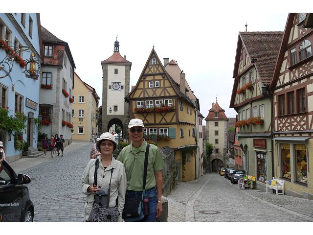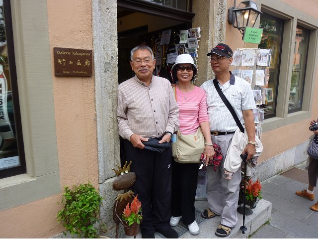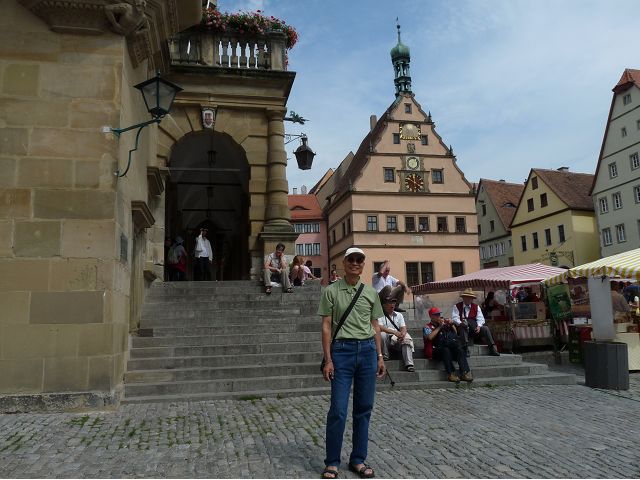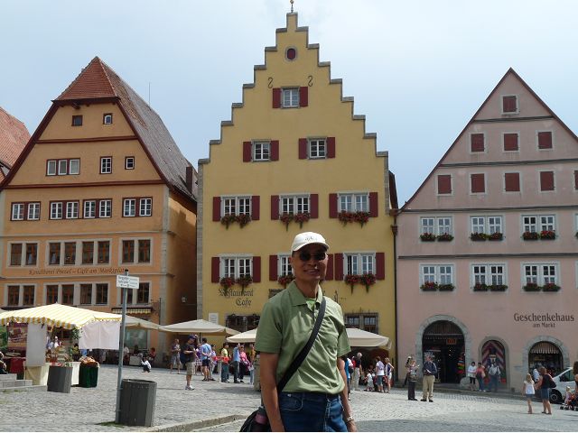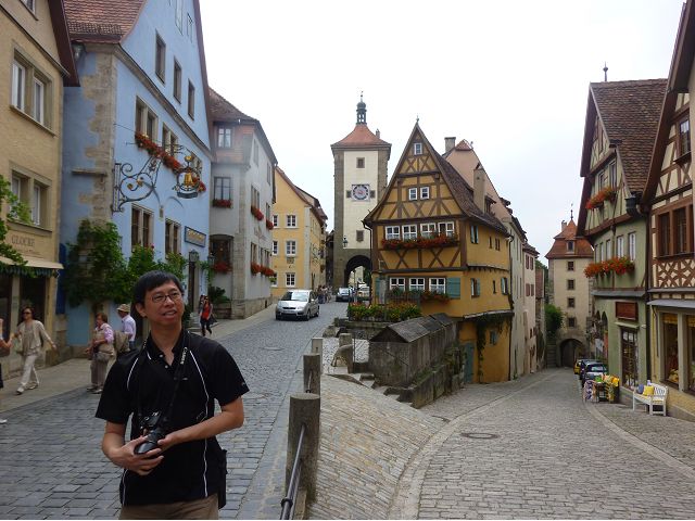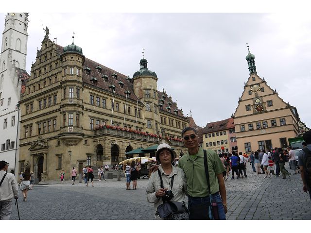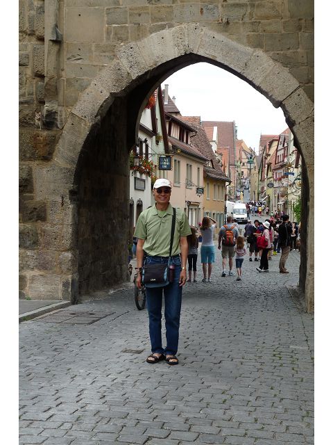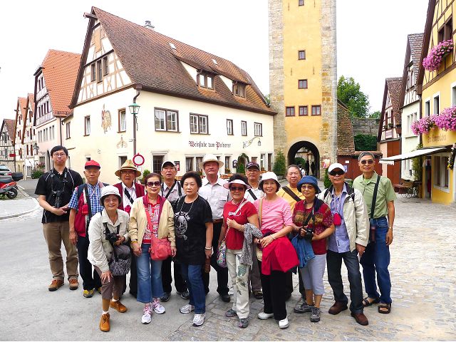 羅騰堡(Rothenburg ob der Tauber,意為陶柏河上的紅色屋頂城堡)位於德國南部巴伐利亞州西北側邊緣,是德國知名的中古世紀小鎮,此行利用半天時間漫步於羅騰堡老城。導遊介紹說,羅騰堡奇蹟般躲過兩次毀滅性災難,一是1631年三十年戰爭時的大酒杯傳奇故事,市長一口氣喝完3.25公升葡萄酒,拯救該市免於毀滅,一是1945年二戰末期,因美軍將領的童年回憶,而躲過轟炸惡運,因此之故,乃能幸運地保持住中世紀、文藝復興時期的城市風貌,才讓我們有機會欣賞羅曼蒂克的羅騰堡:走訪厚重外牆多層拱門的施皮塔炮壘(Spitalbastei)、漫步鋪設石板路鵝卵石步道的古城街道、舊城區中心市場廣場(Marktplatz)鱗次櫛比的古樸木造屋、哥德式市政廳山牆上的壁鐘定時秀出市長拼酒救市民的傳奇故事、鵝黃色小屋分岔石板路如經典明信片的普連萊小廣場(Plönlein)、路邊吸睛的商店鍛鐵招牌、城牆、城堡花園(Burggarten)及其建於1360年的Galgentor入口塔樓,還有已記不清楚的馬克斯塔(Markusturm Röderbogen)、雷達門(Röderturm)等塔樓,歐洲中世紀的建築場景,令人如置身童話世界裡般的夢幻。漫遊舊城區時,遇見一對來自斯洛凡尼亞的初老夫婦和共騎一車的德國夫婦,他們都是踏上騎遊羅曼蒂克大道的旅程;發現日本人經營的竹山畫廊,在店門前,竹山君和來自竹山的良夫夫婦合影,萍水相逢也是機緣巧合。