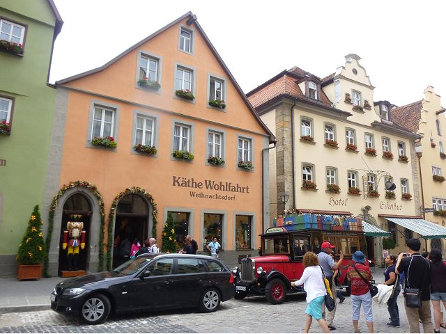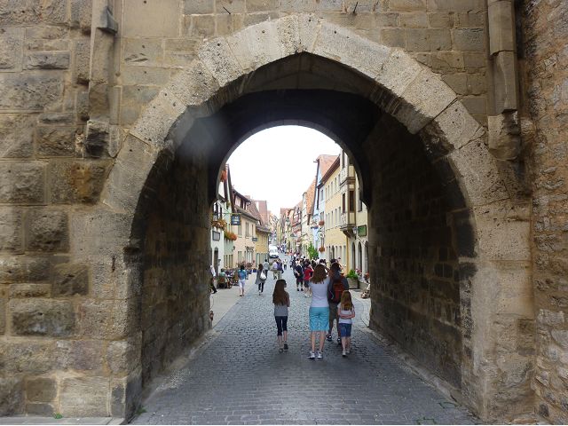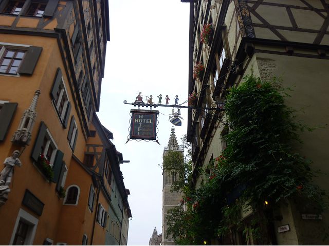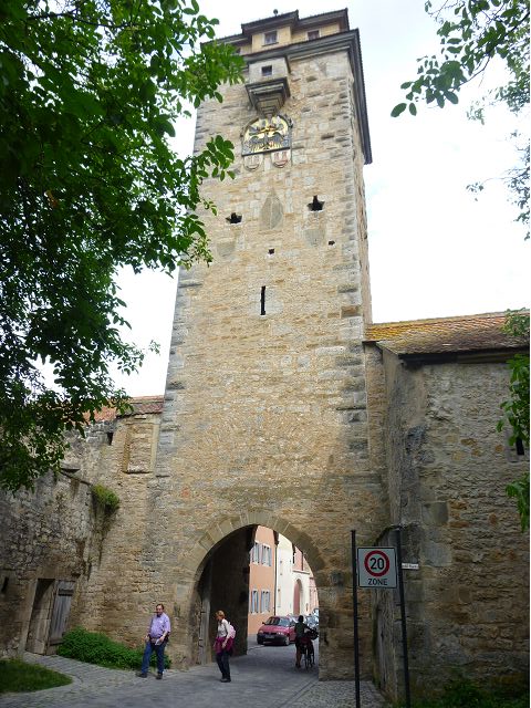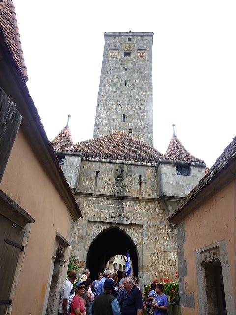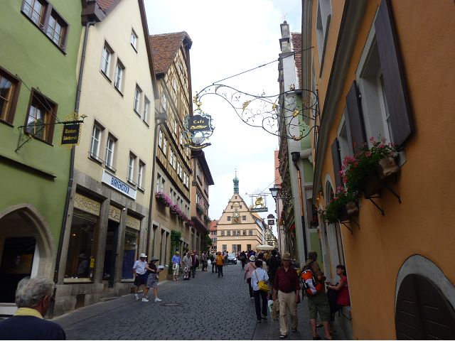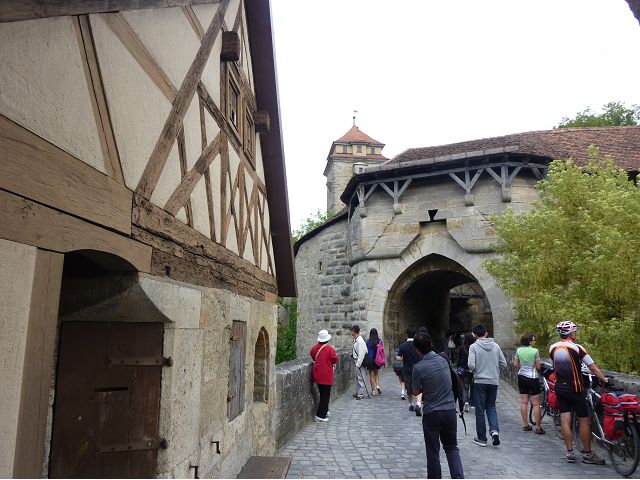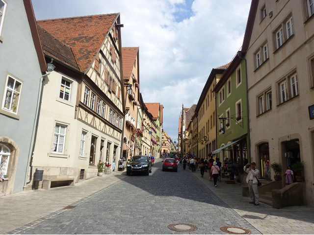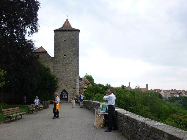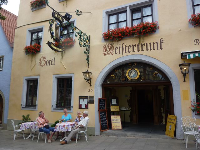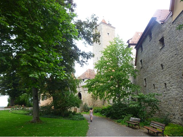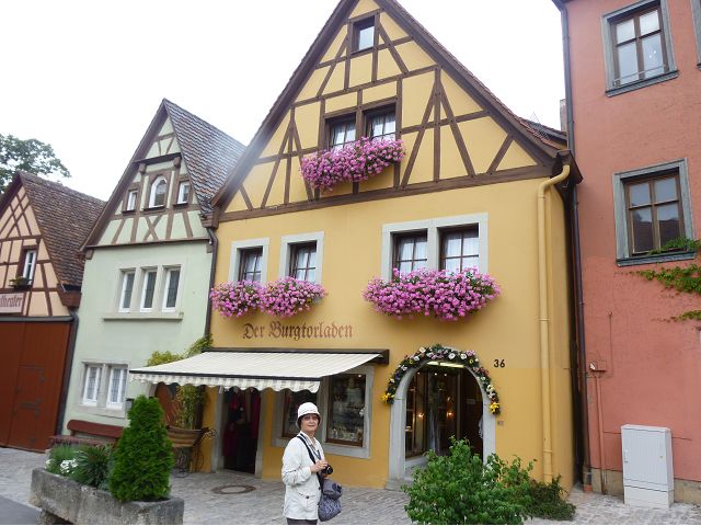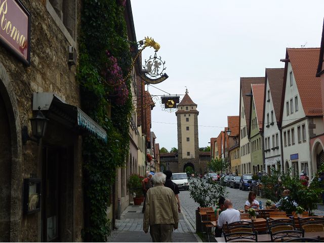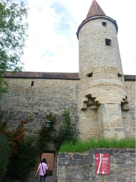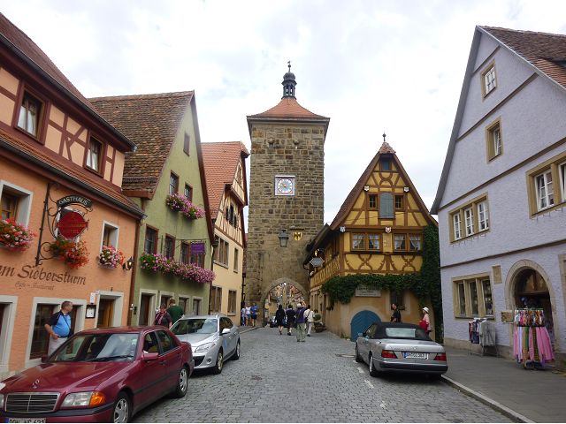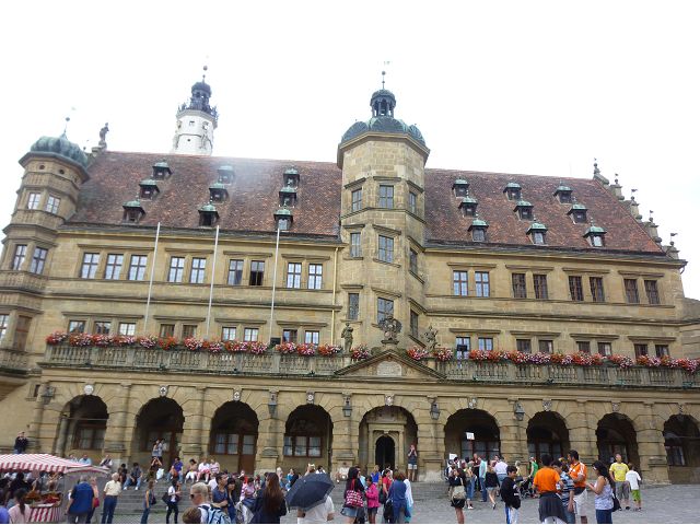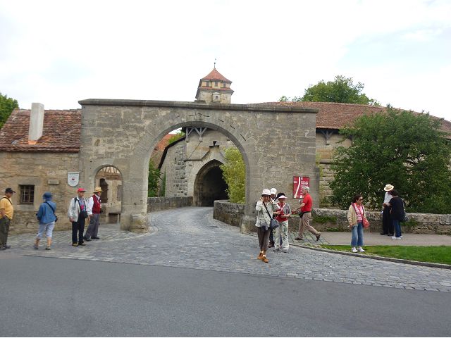 羅騰堡(Rothenburg ob der Tauber,意為陶柏河上的紅色屋頂城堡)位於德國南部巴伐利亞州西北側邊緣,是德國知名的中古世紀小鎮,此行利用半天時間漫步於羅騰堡老城。導遊介紹說,羅騰堡奇蹟般躲過兩次毀滅性災難,一是1631年三十年戰爭時的大酒杯傳奇故事,市長一口氣喝完3.25公升葡萄酒,拯救該市免於毀滅,一是1945年二戰末期,因美軍將領的童年回憶,而躲過轟炸惡運,因此之故,乃能幸運地保持住中世紀、文藝復興時期的城市風貌,才讓我們有機會欣賞羅曼蒂克的羅騰堡:走訪厚重外牆多層拱門的施皮塔炮壘(Spitalbastei)、漫步鋪設石板路鵝卵石步道的古城街道、舊城區中心市場廣場(Marktplatz)鱗次櫛比的古樸木造屋、哥德式市政廳山牆上的壁鐘定時秀出市長拼酒救市民的傳奇故事、鵝黃色小屋分岔石板路如經典明信片的普連萊小廣場(Plönlein)、路邊吸睛的商店鍛鐵招牌、城牆、城堡花園(Burggarten)及其建於1360年的Galgentor入口塔樓,還有已記不清楚的馬克斯塔(Markusturm Röderbogen)、雷達門(Röderturm)等塔樓,歐洲中世紀的建築場景,令人如置身童話世界裡般的夢幻。漫遊舊城區時,遇見一對來自斯洛凡尼亞的初老夫婦和共騎一車的德國夫婦,他們都是踏上騎遊羅曼蒂克大道的旅程;發現日本人經營的竹山畫廊,在店門前,竹山君和來自竹山的良夫夫婦合影,萍水相逢也是機緣巧合。