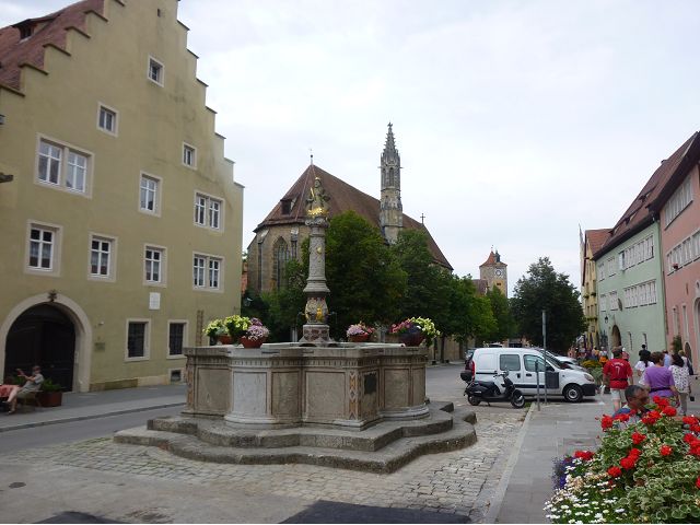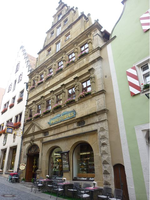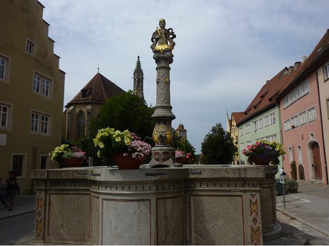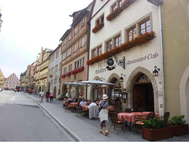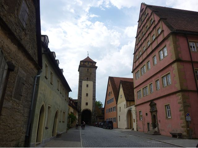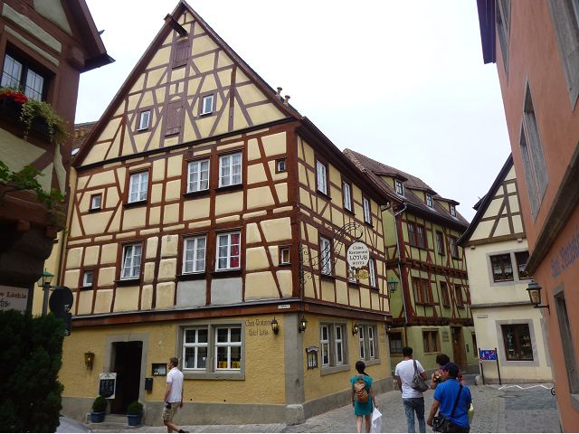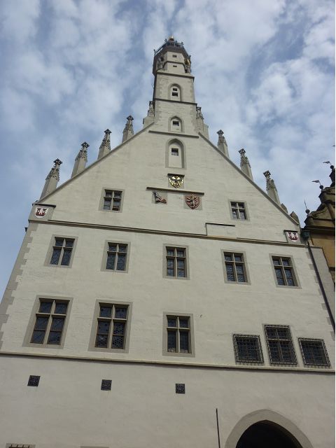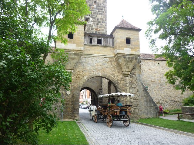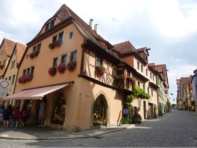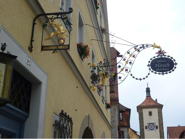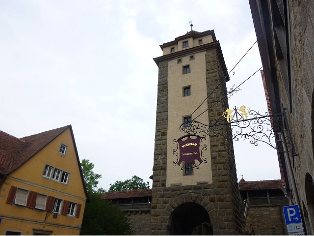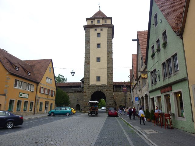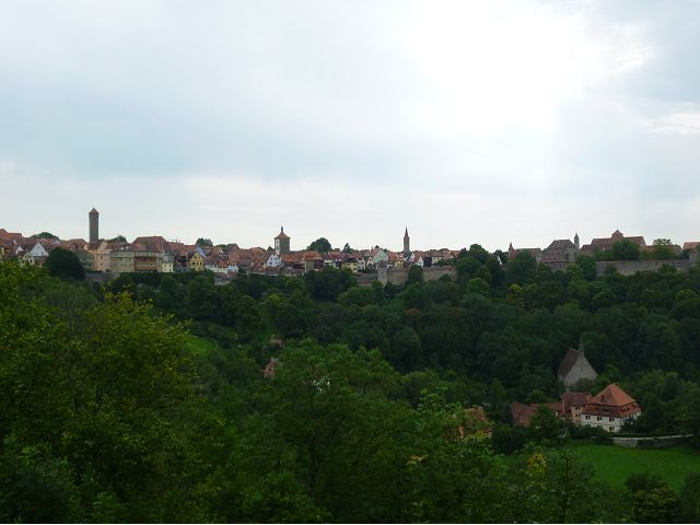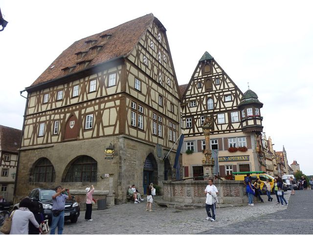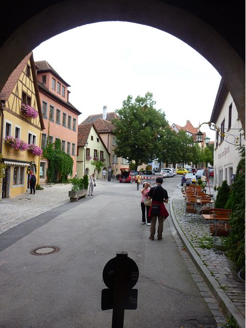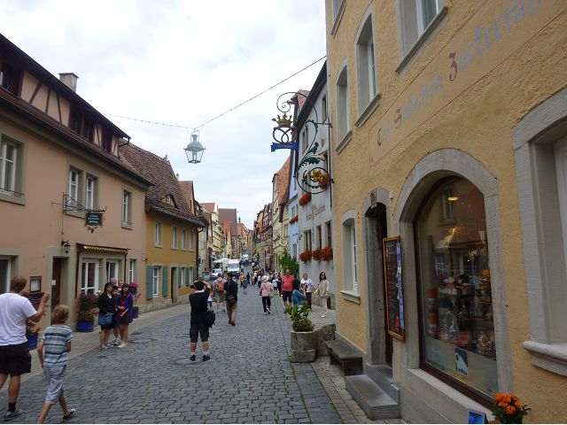 羅騰堡(Rothenburg ob der Tauber,意為陶柏河上的紅色屋頂城堡)位於德國南部巴伐利亞州西北側邊緣,是德國知名的中古世紀小鎮,此行利用半天時間漫步於羅騰堡老城。導遊介紹說,羅騰堡奇蹟般躲過兩次毀滅性災難,一是1631年三十年戰爭時的大酒杯傳奇故事,市長一口氣喝完3.25公升葡萄酒,拯救該市免於毀滅,一是1945年二戰末期,因美軍將領的童年回憶,而躲過轟炸惡運,因此之故,乃能幸運地保持住中世紀、文藝復興時期的城市風貌,才讓我們有機會欣賞羅曼蒂克的羅騰堡:走訪厚重外牆多層拱門的施皮塔炮壘(Spitalbastei)、漫步鋪設石板路鵝卵石步道的古城街道、舊城區中心市場廣場(Marktplatz)鱗次櫛比的古樸木造屋、哥德式市政廳山牆上的壁鐘定時秀出市長拼酒救市民的傳奇故事、鵝黃色小屋分岔石板路如經典明信片的普連萊小廣場(Plönlein)、路邊吸睛的商店鍛鐵招牌、城牆、城堡花園(Burggarten)及其建於1360年的Galgentor入口塔樓,還有已記不清楚的馬克斯塔(Markusturm Röderbogen)、雷達門(Röderturm)等塔樓,歐洲中世紀的建築場景,令人如置身童話世界裡般的夢幻。漫遊舊城區時,遇見一對來自斯洛凡尼亞的初老夫婦和共騎一車的德國夫婦,他們都是踏上騎遊羅曼蒂克大道的旅程;發現日本人經營的竹山畫廊,在店門前,竹山君和來自竹山的良夫夫婦合影,萍水相逢也是機緣巧合。