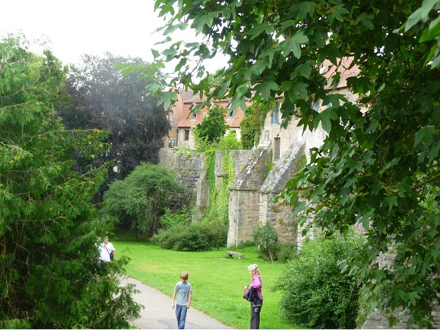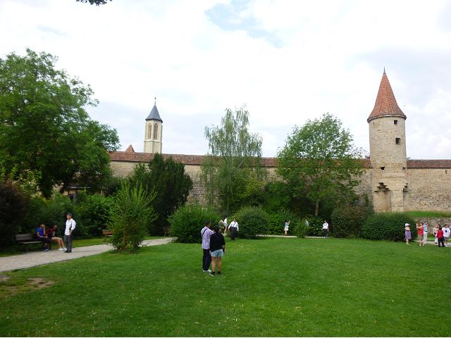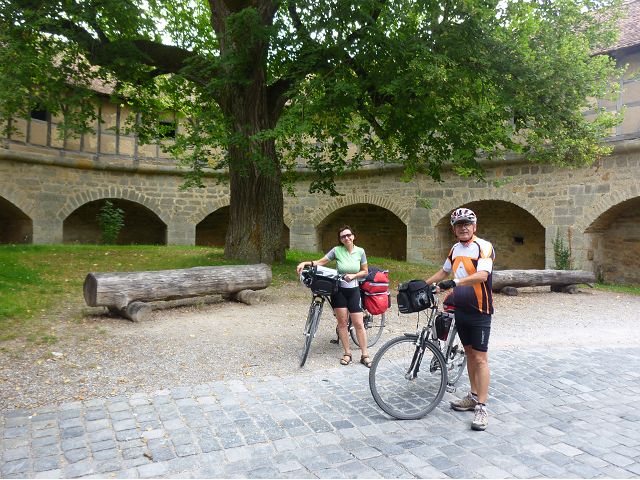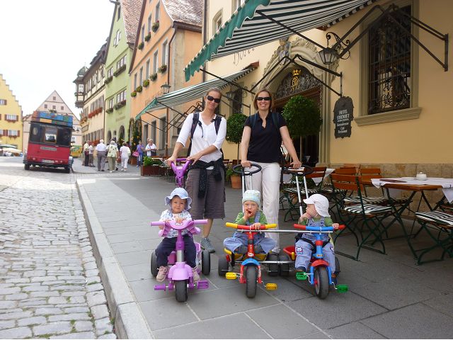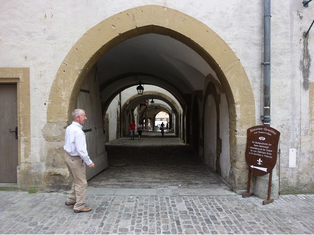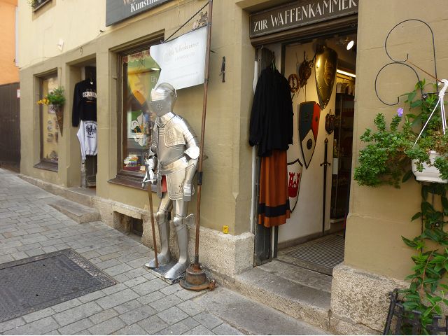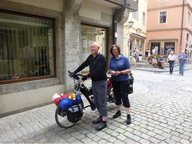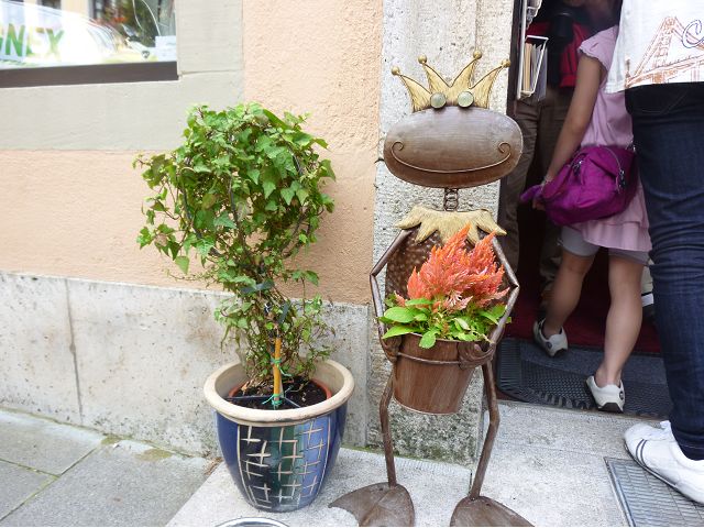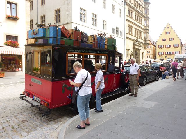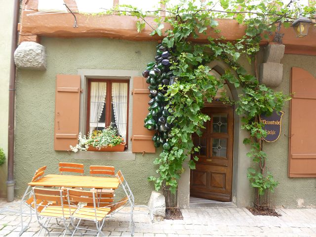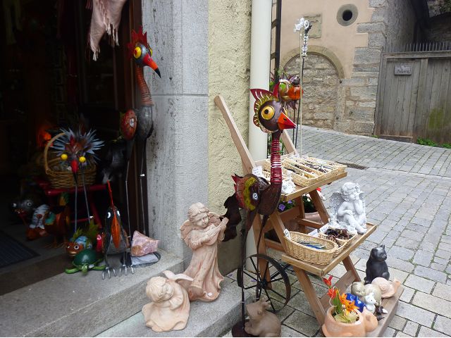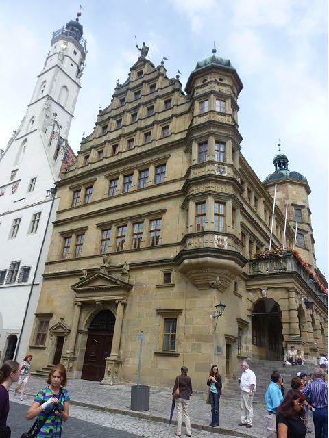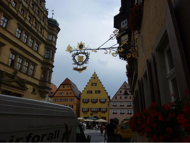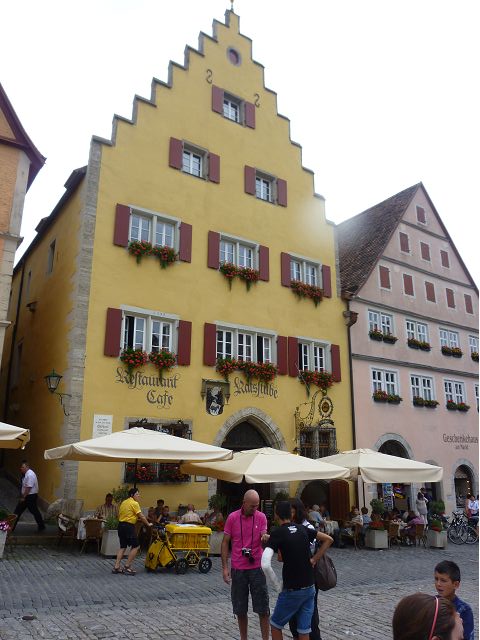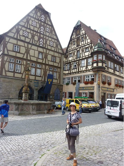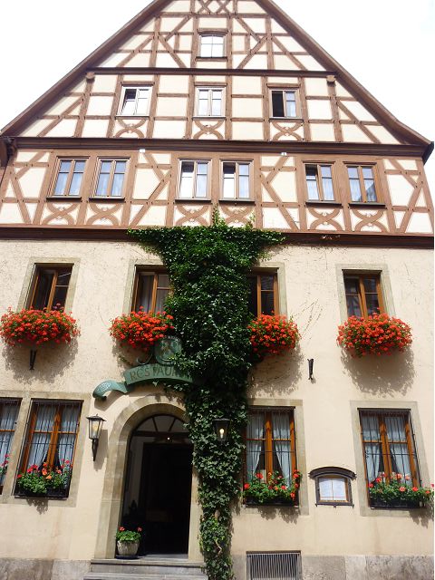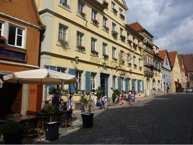 羅騰堡(Rothenburg ob der Tauber,意為陶柏河上的紅色屋頂城堡)位於德國南部巴伐利亞州西北側邊緣,是德國知名的中古世紀小鎮,此行利用半天時間漫步於羅騰堡老城。導遊介紹說,羅騰堡奇蹟般躲過兩次毀滅性災難,一是1631年三十年戰爭時的大酒杯傳奇故事,市長一口氣喝完3.25公升葡萄酒,拯救該市免於毀滅,一是1945年二戰末期,因美軍將領的童年回憶,而躲過轟炸惡運,因此之故,乃能幸運地保持住中世紀、文藝復興時期的城市風貌,才讓我們有機會欣賞羅曼蒂克的羅騰堡:走訪厚重外牆多層拱門的施皮塔炮壘(Spitalbastei)、漫步鋪設石板路鵝卵石步道的古城街道、舊城區中心市場廣場(Marktplatz)鱗次櫛比的古樸木造屋、哥德式市政廳山牆上的壁鐘定時秀出市長拼酒救市民的傳奇故事、鵝黃色小屋分岔石板路如經典明信片的普連萊小廣場(Plönlein)、路邊吸睛的商店鍛鐵招牌、城牆、城堡花園(Burggarten)及其建於1360年的Galgentor入口塔樓,還有已記不清楚的馬克斯塔(Markusturm Röderbogen)、雷達門(Röderturm)等塔樓,歐洲中世紀的建築場景,令人如置身童話世界裡般的夢幻。漫遊舊城區時,遇見一對來自斯洛凡尼亞的初老夫婦和共騎一車的德國夫婦,他們都是踏上騎遊羅曼蒂克大道的旅程;發現日本人經營的竹山畫廊,在店門前,竹山君和來自竹山的良夫夫婦合影,萍水相逢也是機緣巧合。