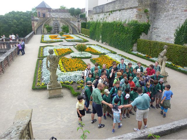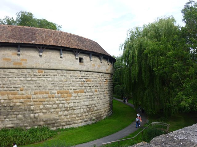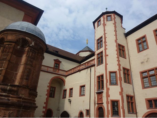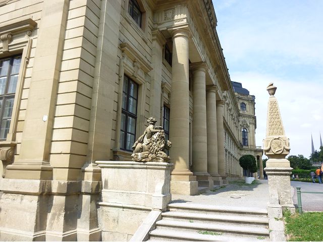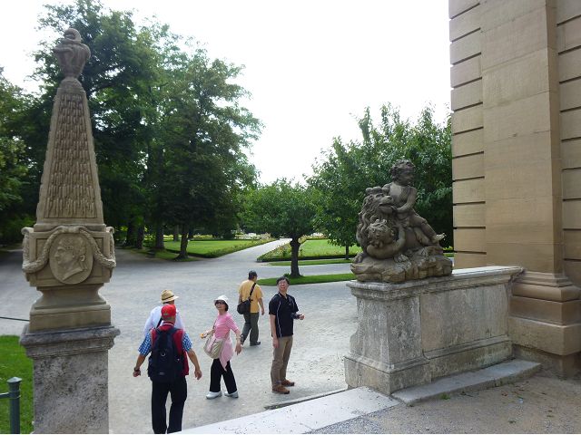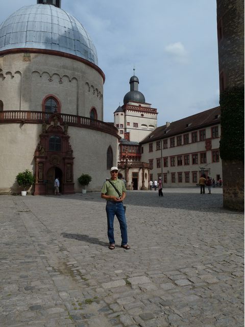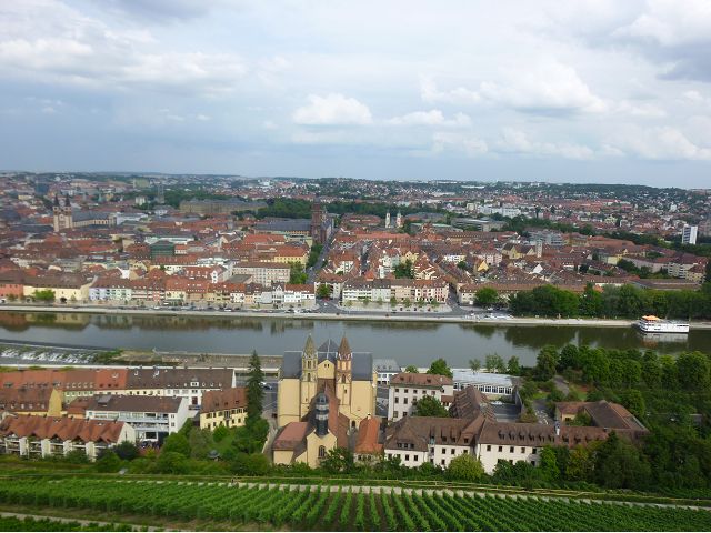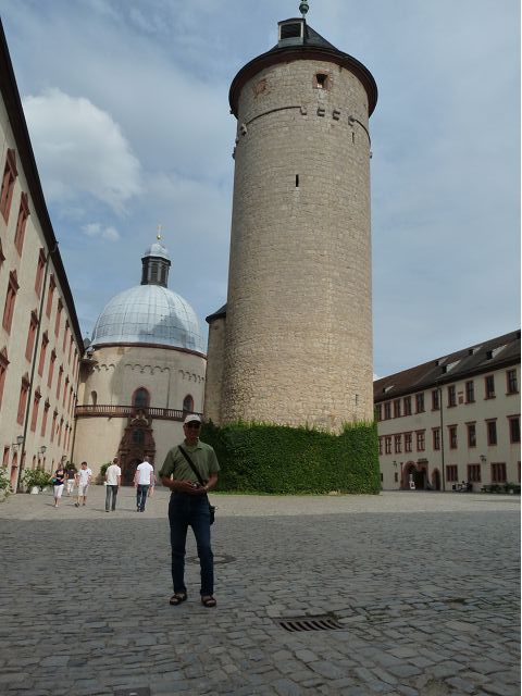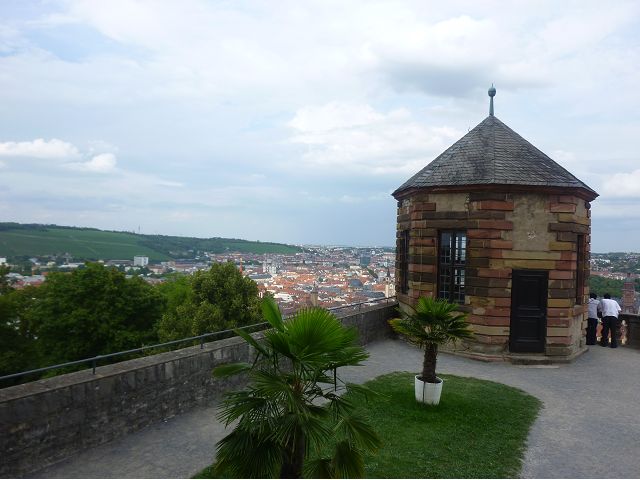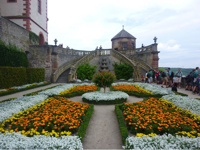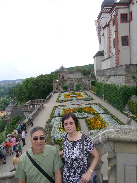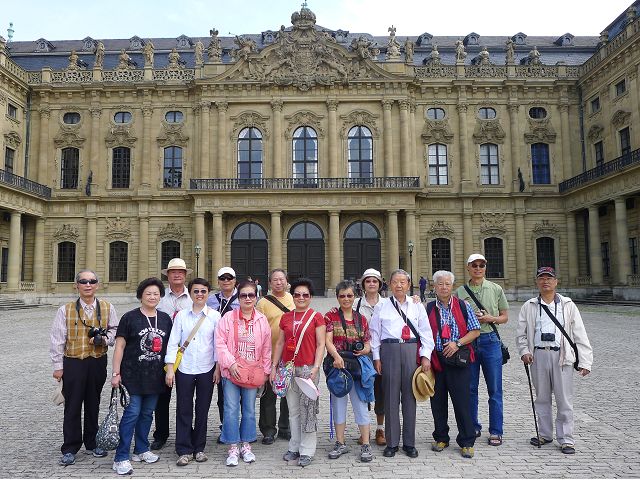 午餐後,續前往美茵河中游的烏茲堡,是羅曼蒂克大道起點,旅行團安排走訪分立美茵河兩岸的烏茲堡官邸(Residenz Würzburg)和瑪利亞堡(Festung Marienberg),前者已列入世界文化遺產名錄。烏茲堡官邸(亦稱為主教宮殿)是建於1719至1779年間、一座具巴洛克風情的奢華宮殿及宮廷花園,為侯爵主教的官邸,宮內有300多間廳室,內部裝飾極為華麗,金碧輝煌、雕花細緻、鏡光閃閃,其中最有名的是那座樓梯迴廊廳(Treppenhaus)天頂的溼壁畫,是由義大利威尼斯畫家Giovanni Battista Tiepoli所畫、全世界最大的穹頂溼壁畫(Fresco),充分展現出主教在當時宗教界與世俗權力的地位與雄厚財力。二戰末期,美軍毀滅性轟炸空襲中,這座官邸幾乎全毀,只倖存中央建築部分(包括前廳、花園大廳、樓梯、白色大廳和皇家大廳),據說,經多年修復,已重現往日風采云,因而成為德國最重要的歷史與藝術地標之一。宮殿旁的宮廷花園,對稱的設計、精美的雕像與噴泉,同樣讓人感受其宏偉與優雅,且是制高點,可臨眺烏茲堡市區。