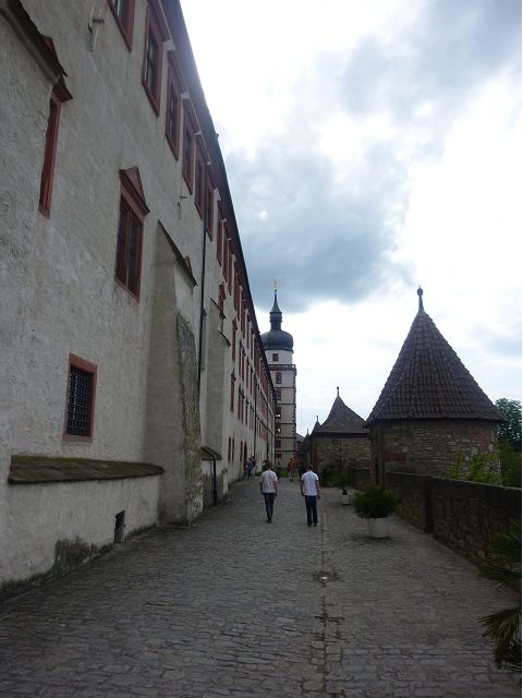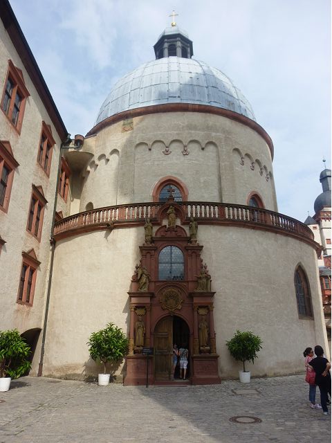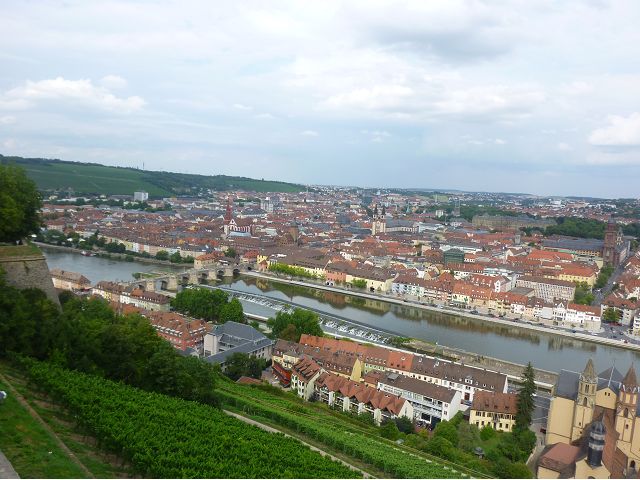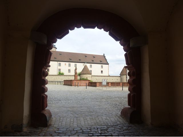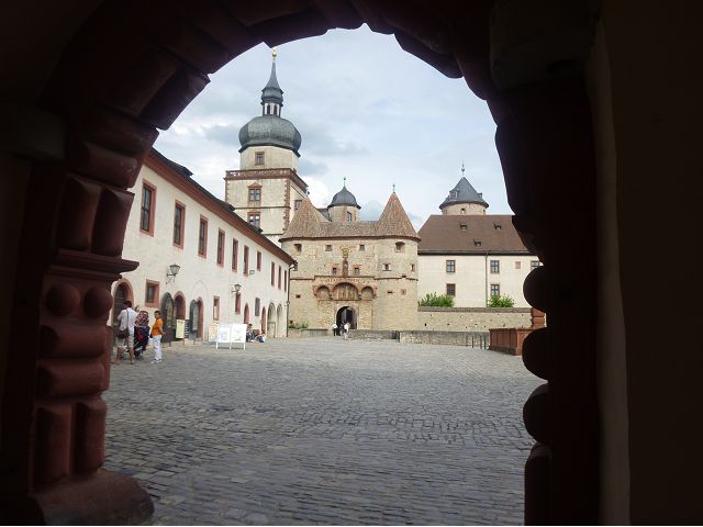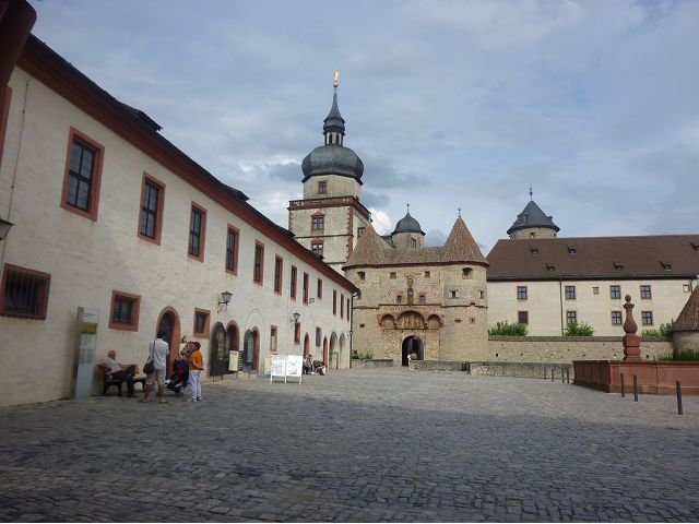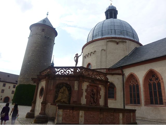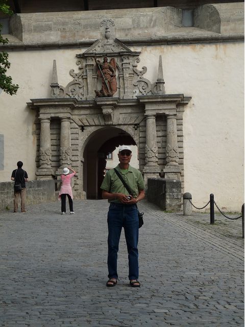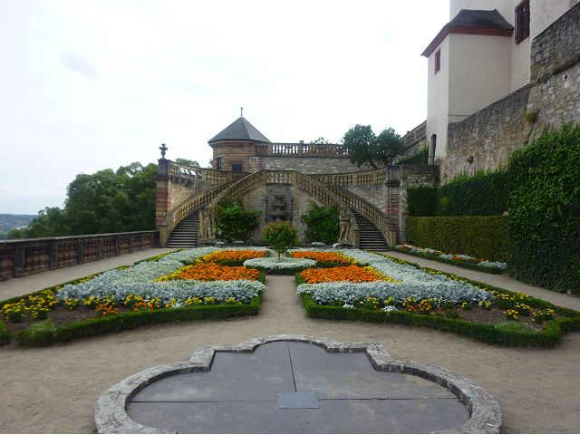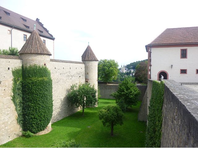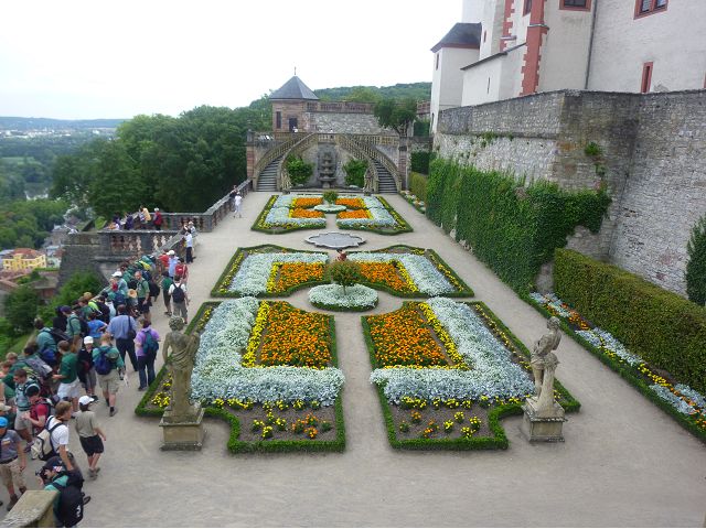 接著走過老美茵橋(Alte Mainbrücke),前往河對岸的瑪利亞堡。古老石橋建於1476年,長185公尺,連接老城區與瑪利亞堡,也是該市著名地標之一,僅開放步行,橋上矗立著12尊聖徒雕像,漫步橋上,因有360度視野,可環視眼前的中世紀小鎮、堡壘要塞、高聳的教堂尖塔,也是旅程的樂趣之一。瑪利亞堡位於美茵河上方山丘,自古以來,這座中世紀城堡就是一座要塞,原本是采邑主教將近5個世紀的家,直到1631年被瑞典古斯塔夫二世∙阿道夫征服後,才被改建為巴洛克式堡壘,如今成為一座公園和博物館。參觀時,記不得什麼原因,沒留下室內影像,只留了許多很有特色的圓頂、尖塔、拱門、古色古香的中世紀建築群落、對稱佈置的美麗花圃、居高臨下的街景市容,以及處處牆壁攀藤似翠綠樹枝的情景,正足以彰顯其老而彌新吧。